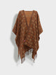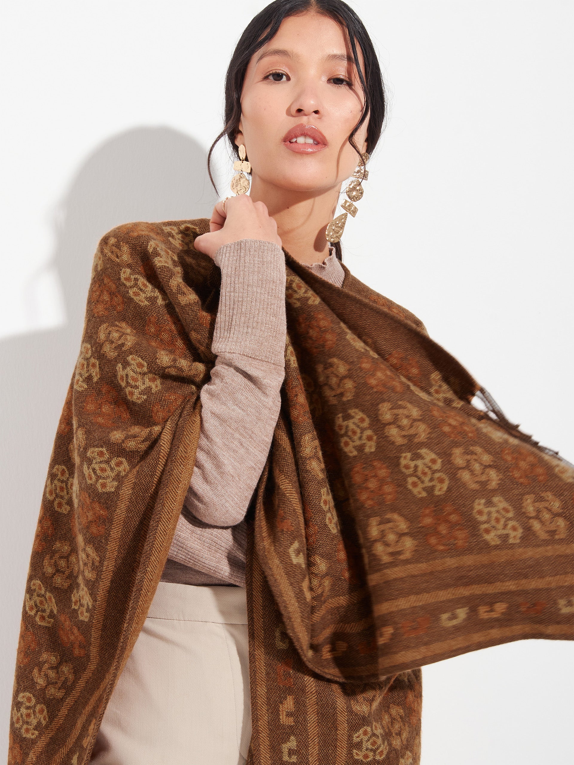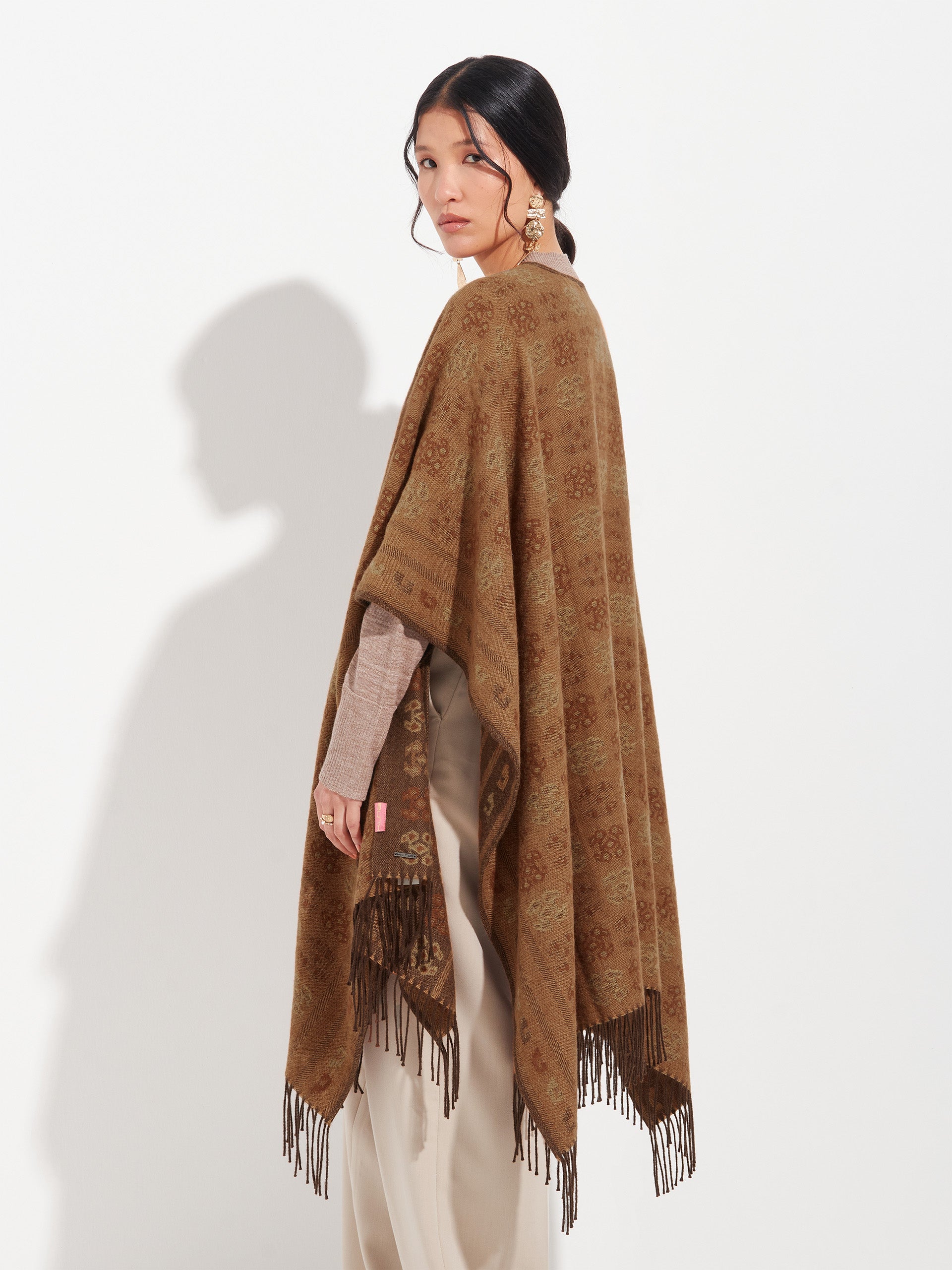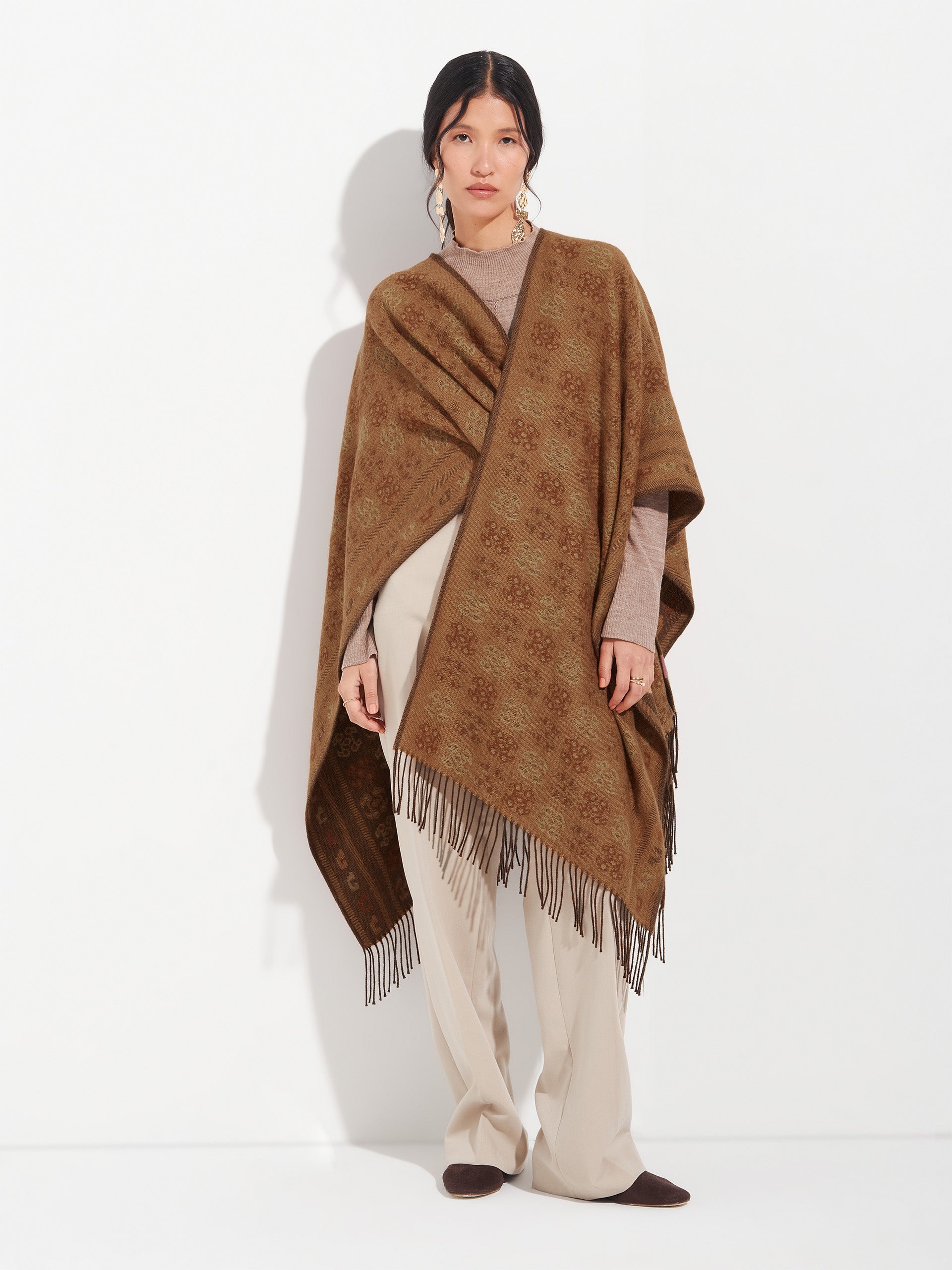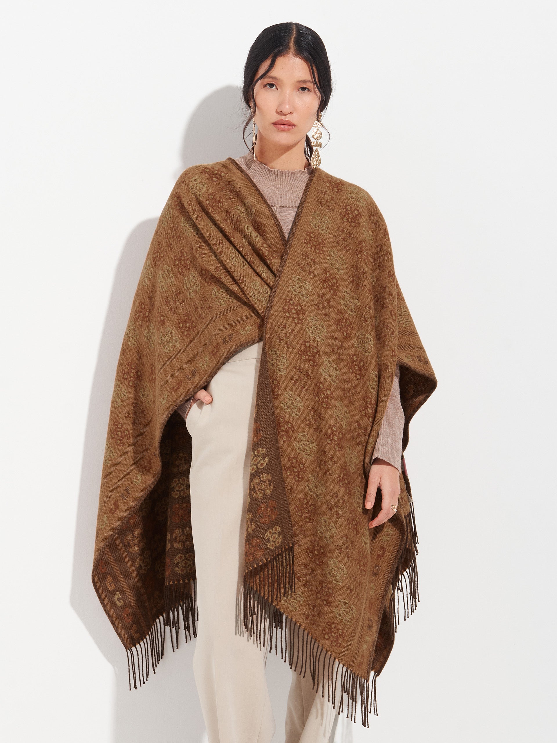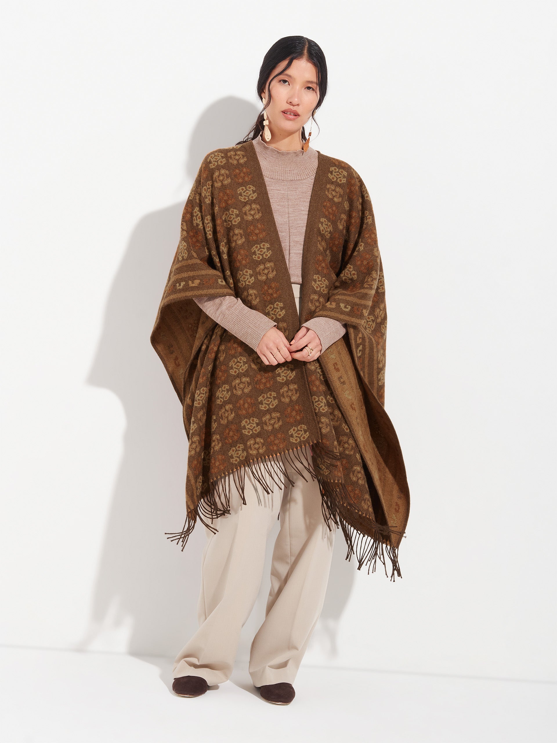 Poncho Chancay 35 en tonalidad marrón, elaborado en 100% baby alpaca con técnica Jacquard en doble cara. Es una prenda reversible, inspirada en la Cultura Chancay, que mantiene viva la tradición ancestral en un diseño representativo de la identidad cultural. | Material predominante: Baby Alpaca