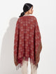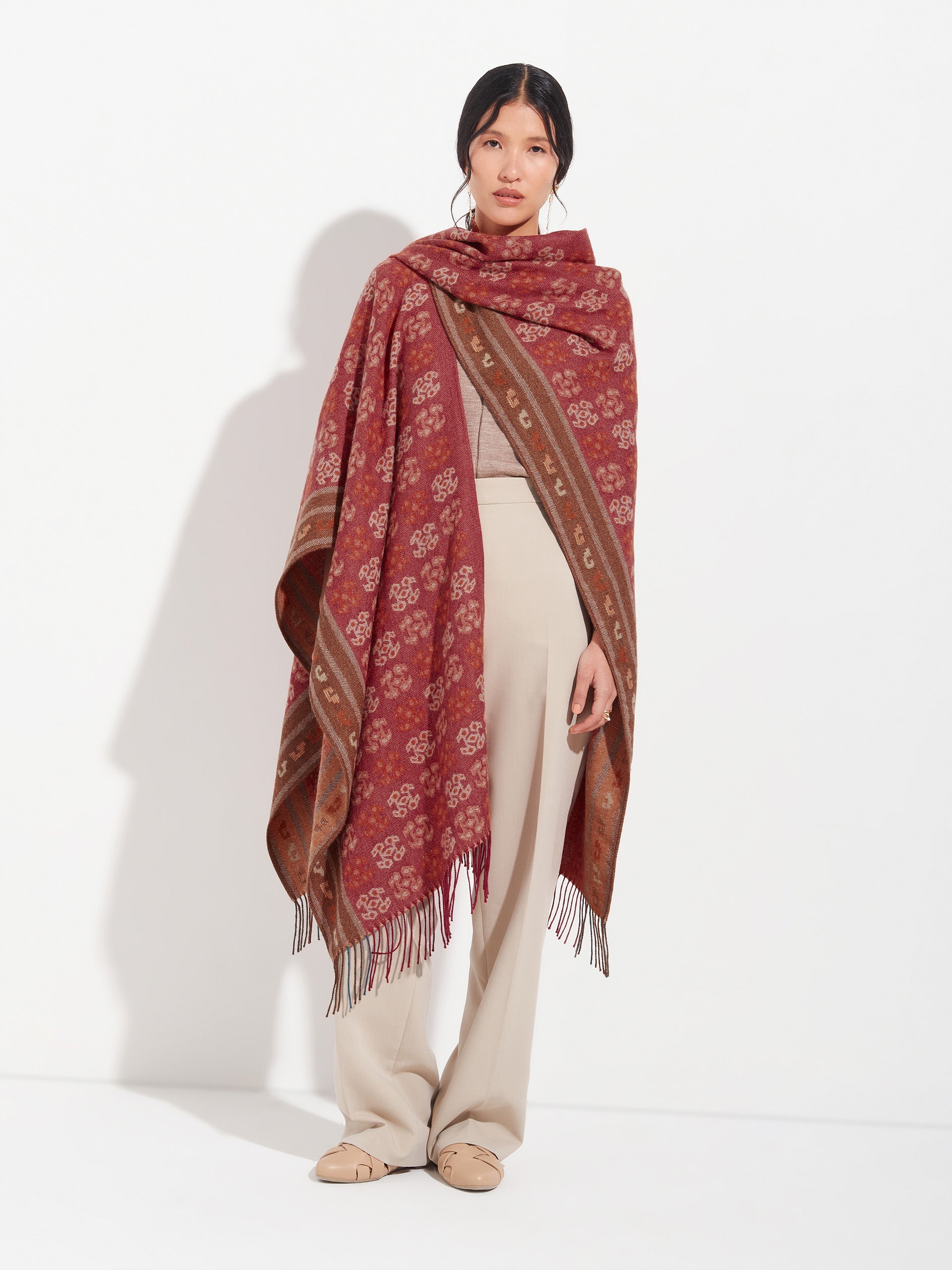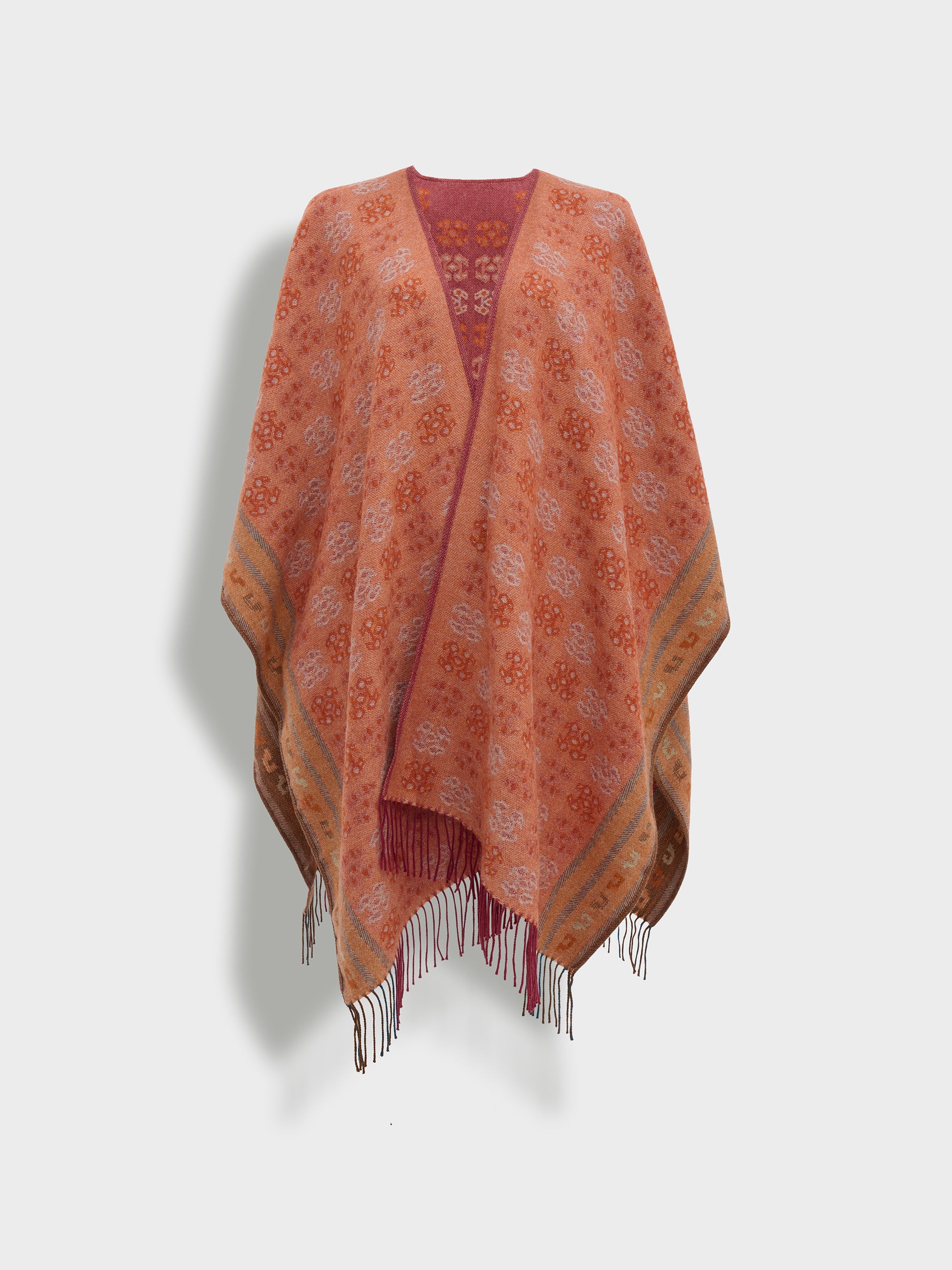 Poncho Chancay 35 en tonalidad naranja, elaborado en 100% baby alpaca con técnica Jacquard en doble cara. Es una prenda reversible, inspirada en la Cultura Chancay, que mantiene viva la tradición ancestral en un diseño representativo de la identidad cultural. | Material predominante: Baby Alpaca