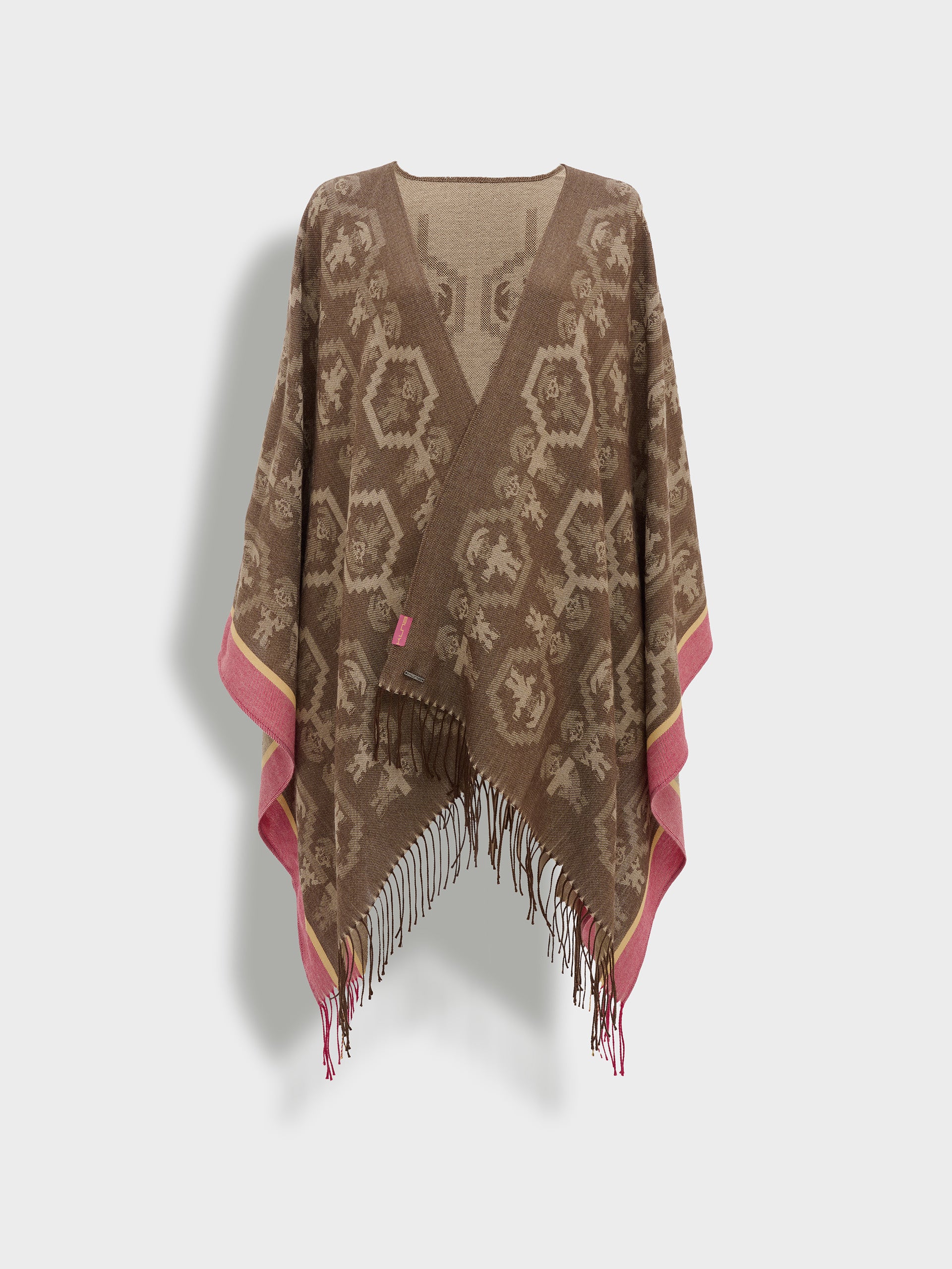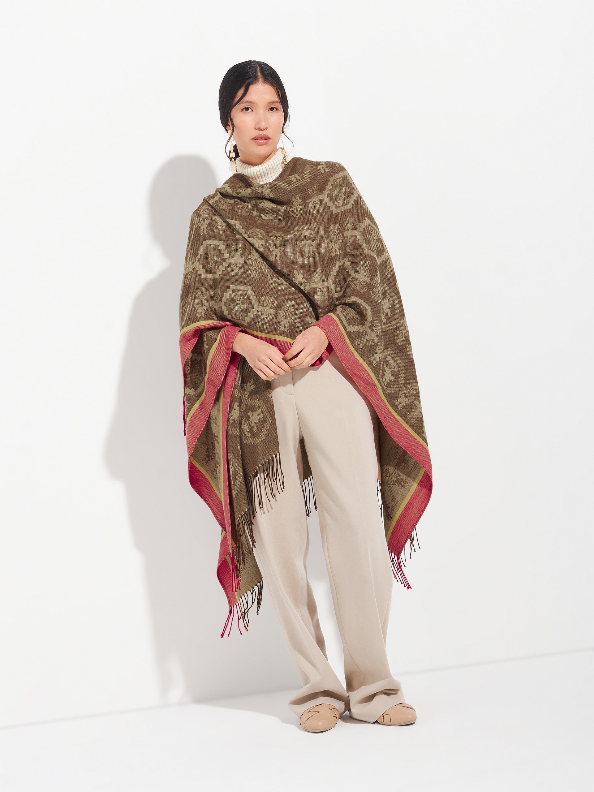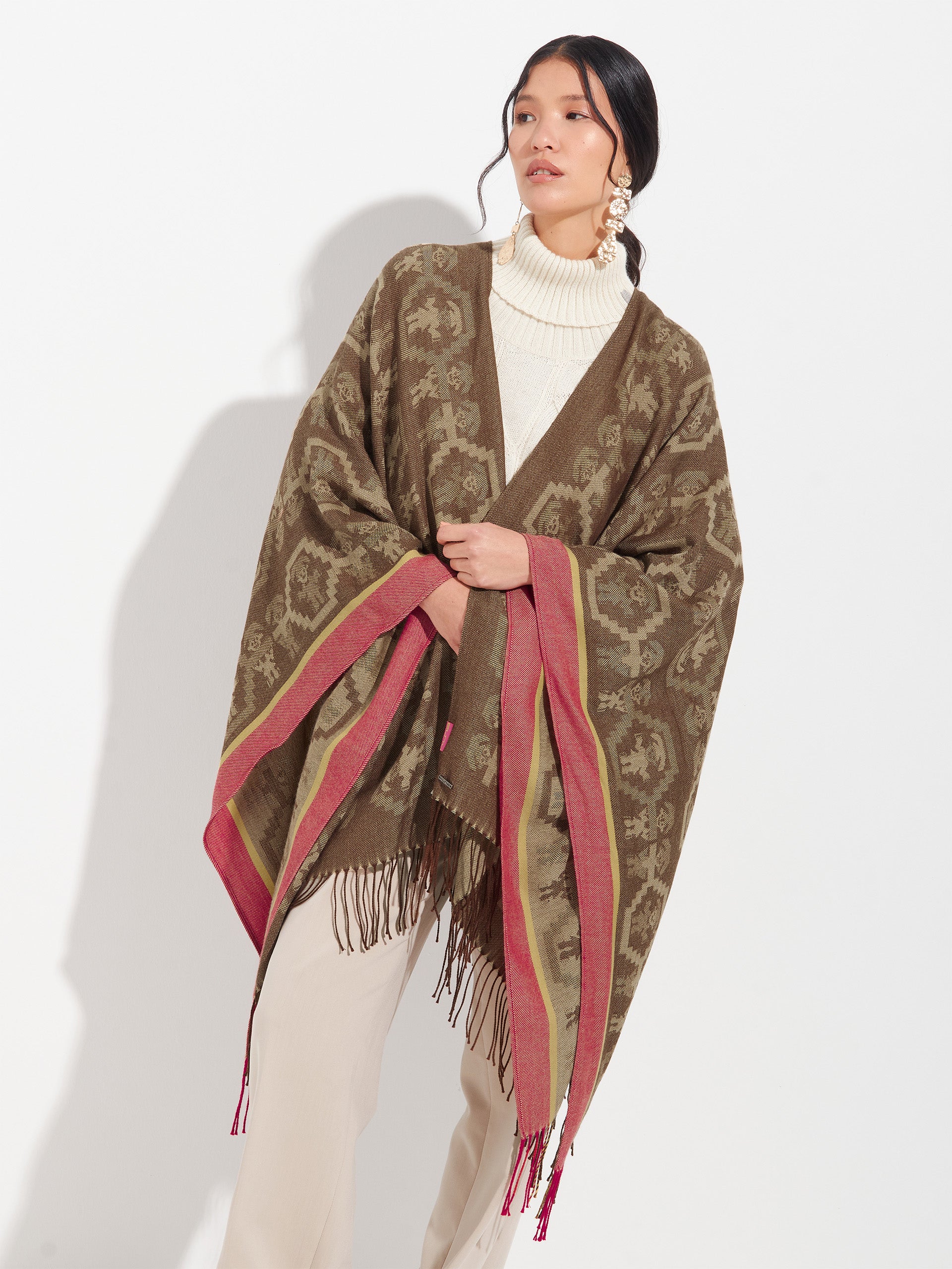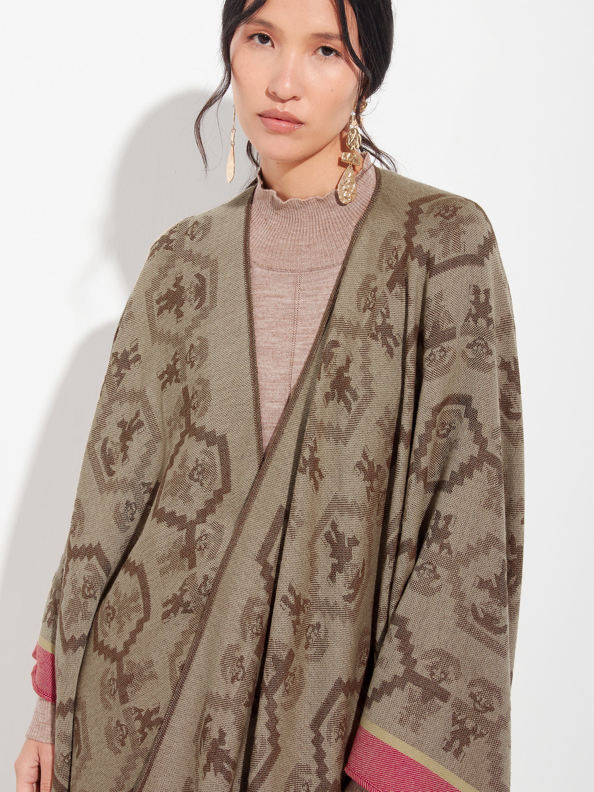 Poncho Chimu 12 en tonalidad amarillo, elaborado en 100% Alpaca Royal con técnica Jacquard satín (tela simple). Es una prenda reversible, inspirada en la Cultura Chimú, que refleja el valor de la tradición ancestral a través de un diseño lleno de identidad cultural. | Material predominante: Royal Alpaca