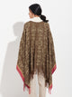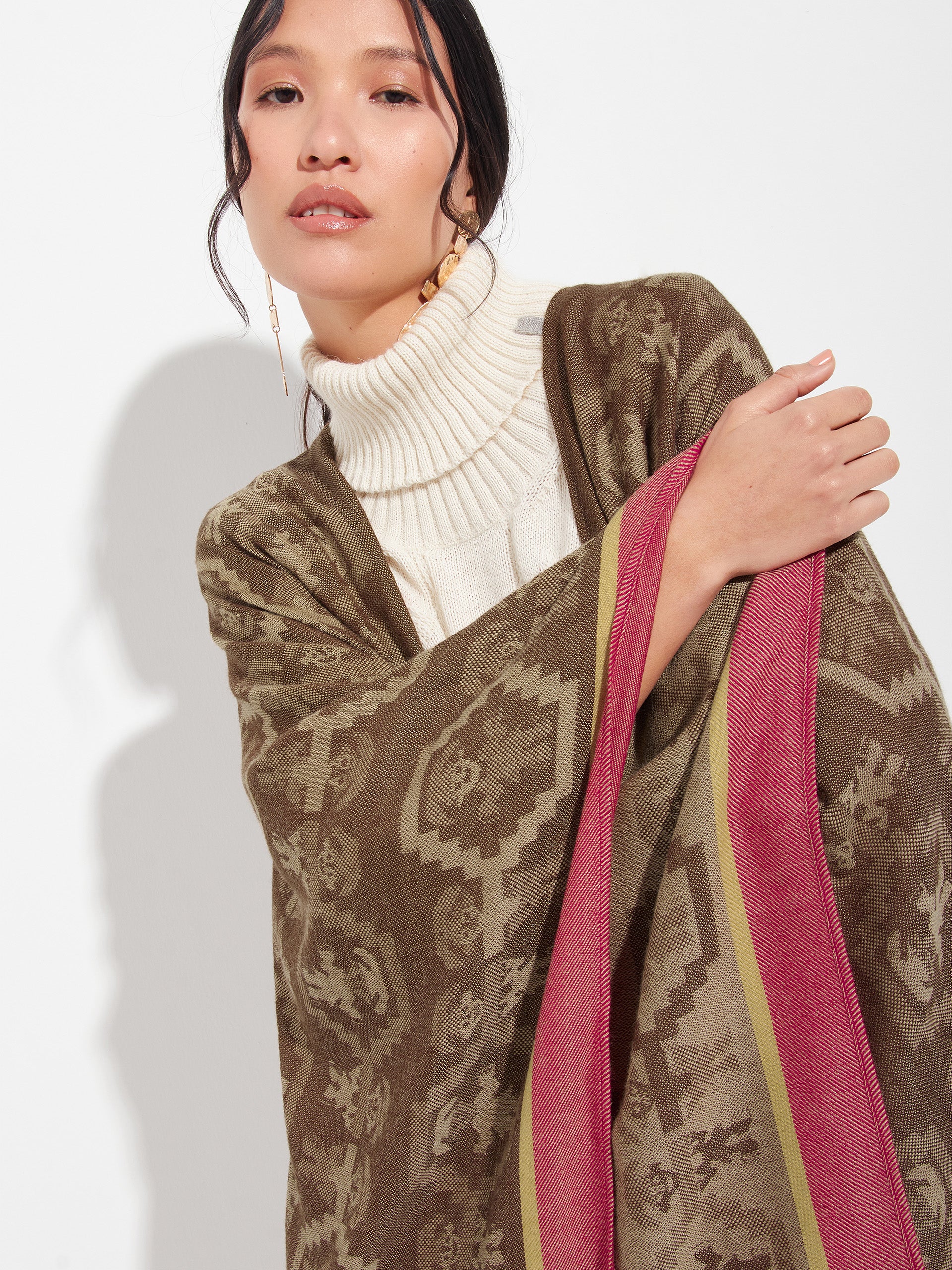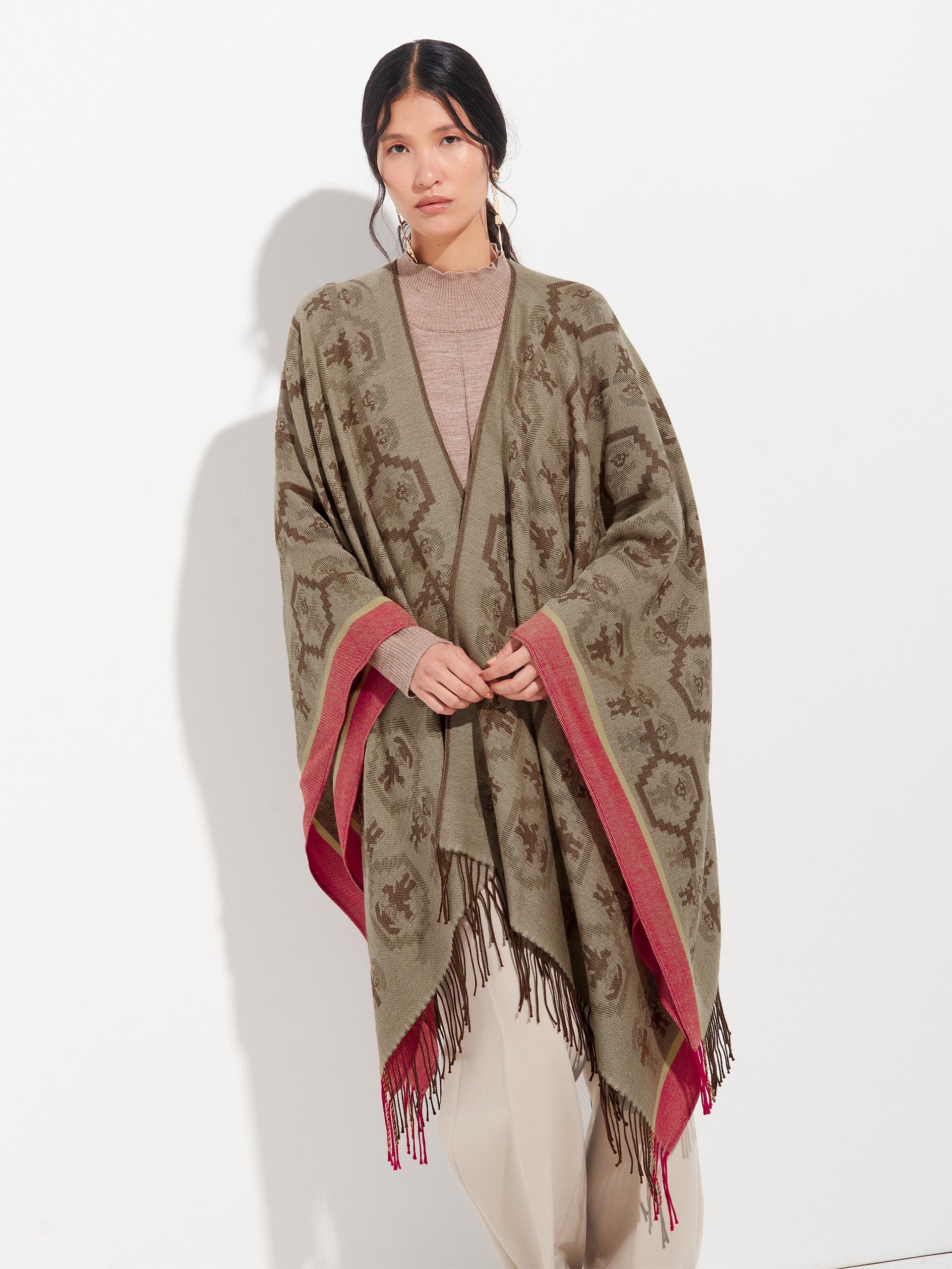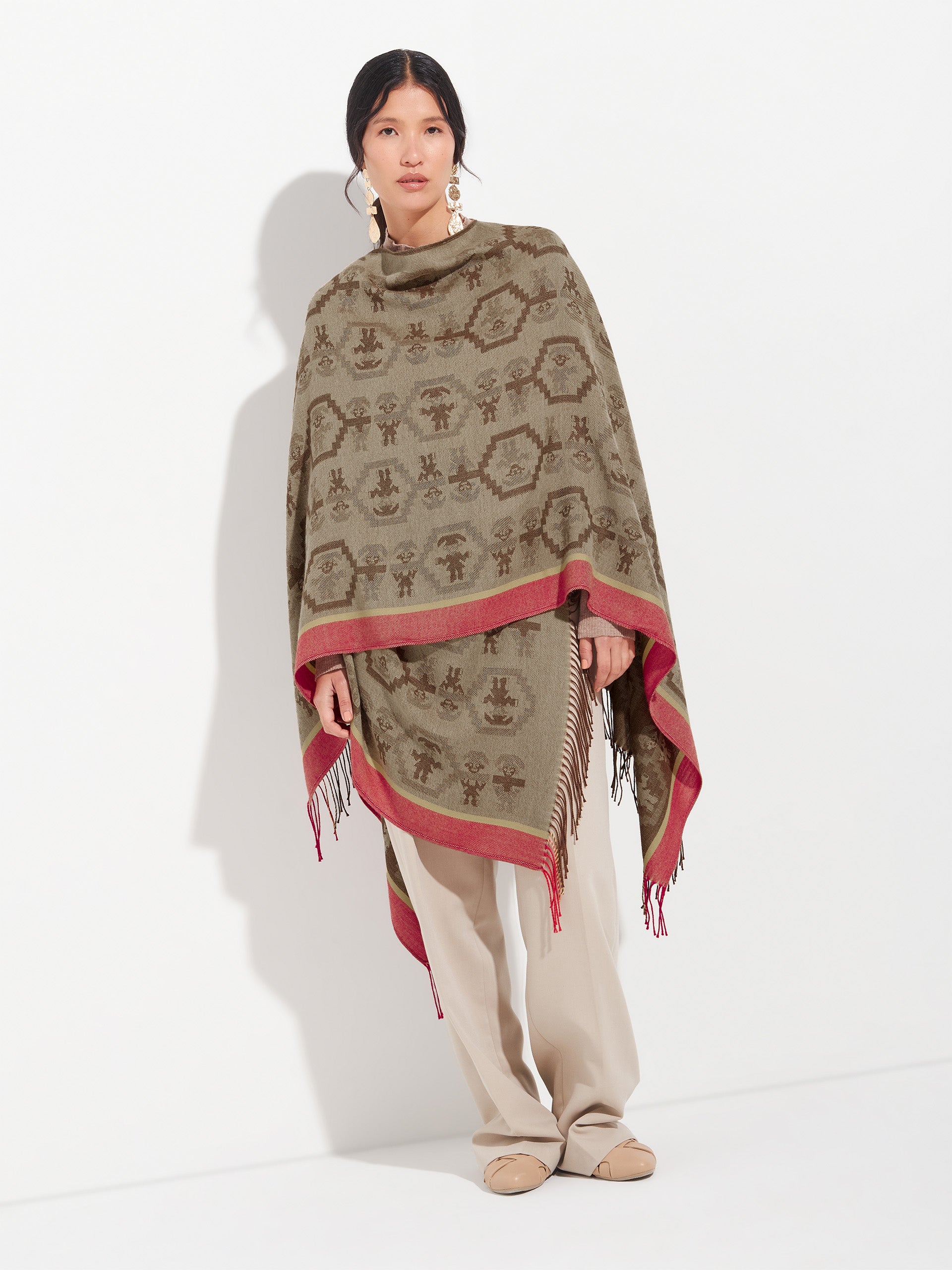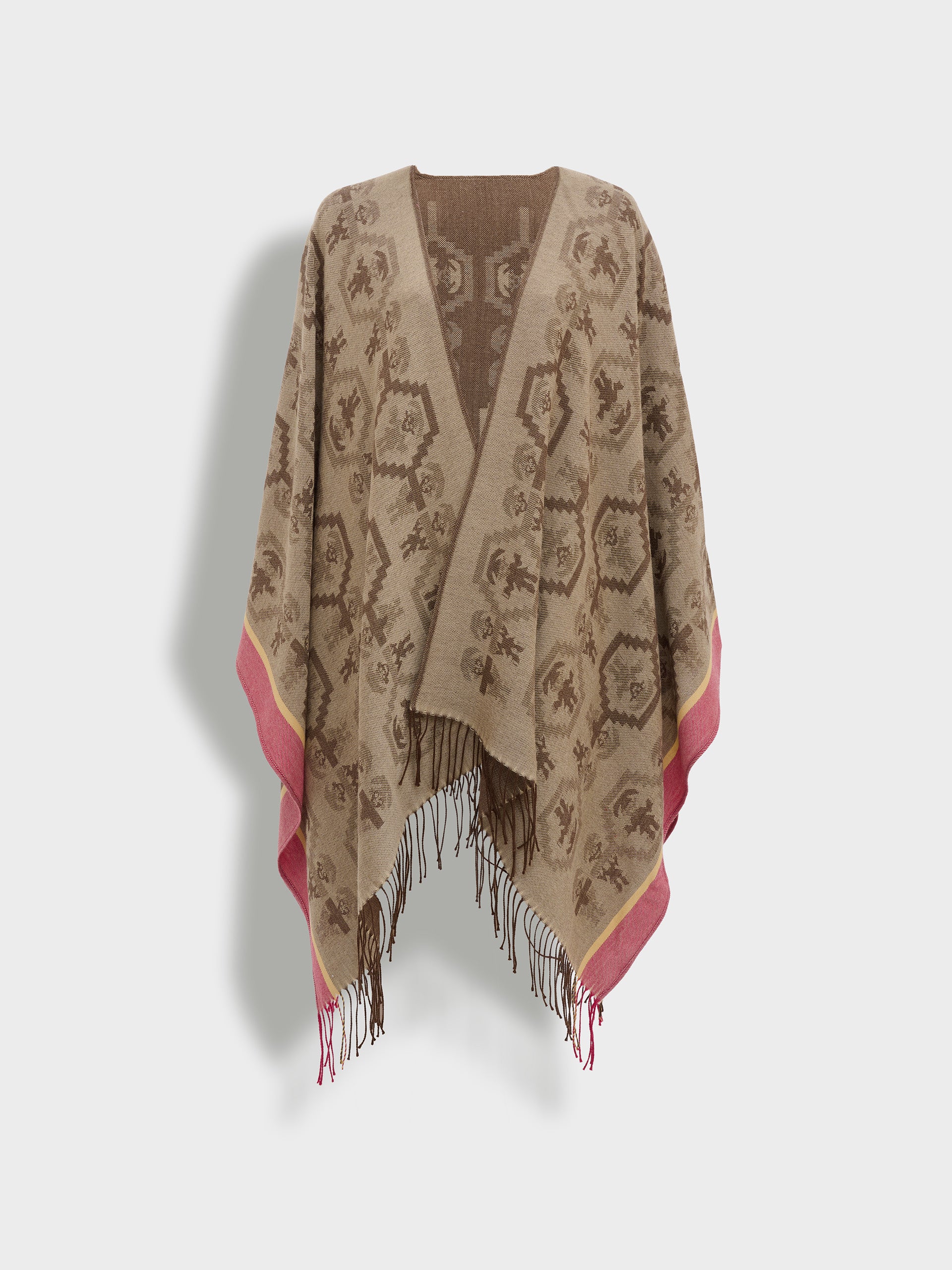 Poncho Chimu 12 en tonalidad amarillo, elaborado en 100% Alpaca Royal con técnica Jacquard satín (tela simple). Es una prenda reversible, inspirada en la Cultura Chimú, que refleja el valor de la tradición ancestral a través de un diseño lleno de identidad cultural. | Material predominante: Royal Alpaca