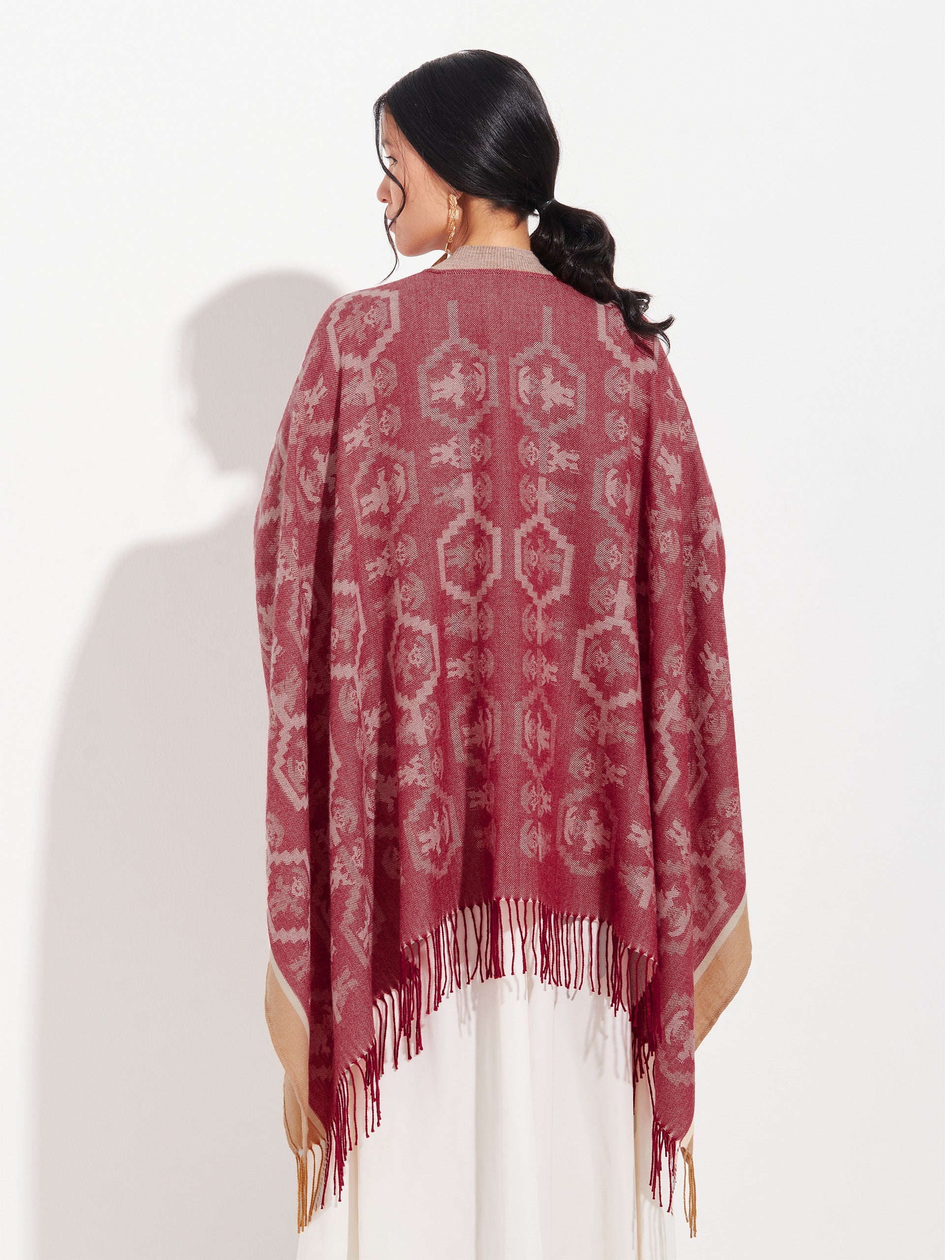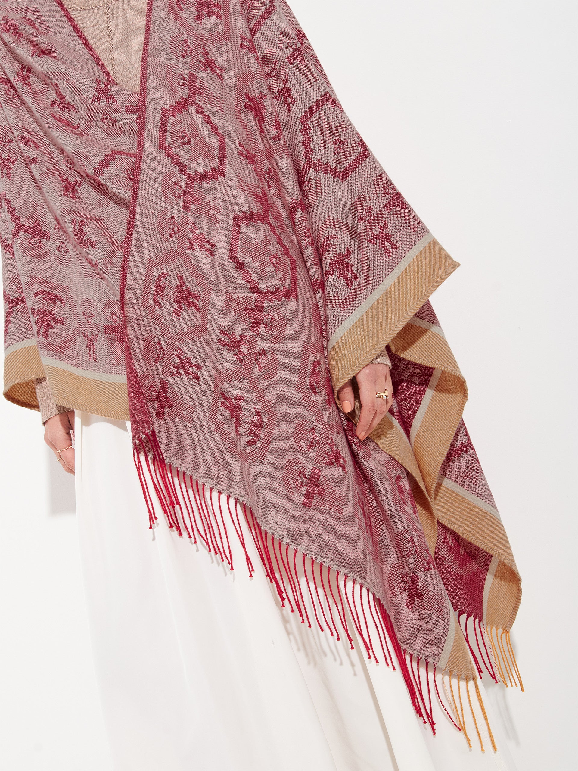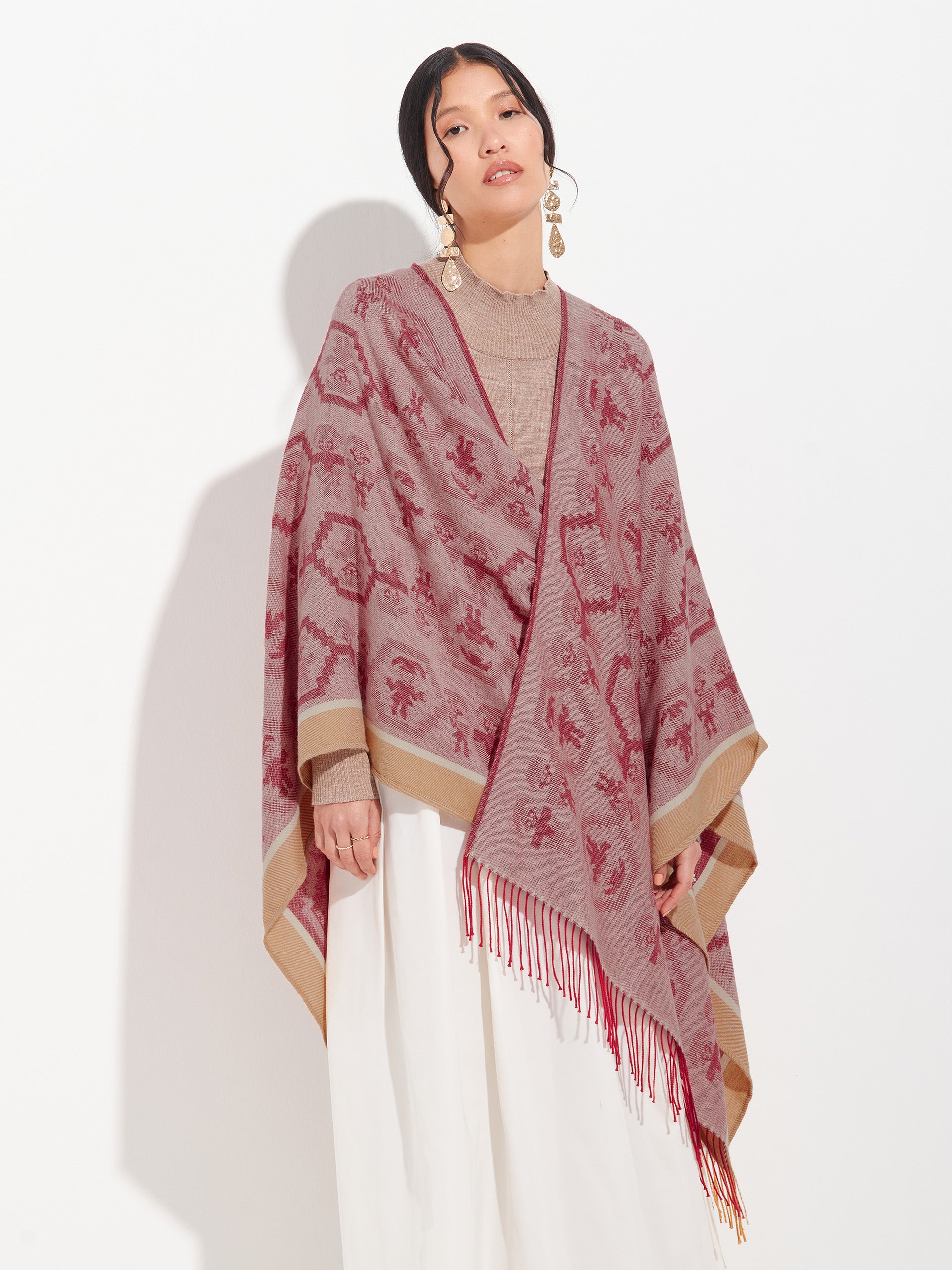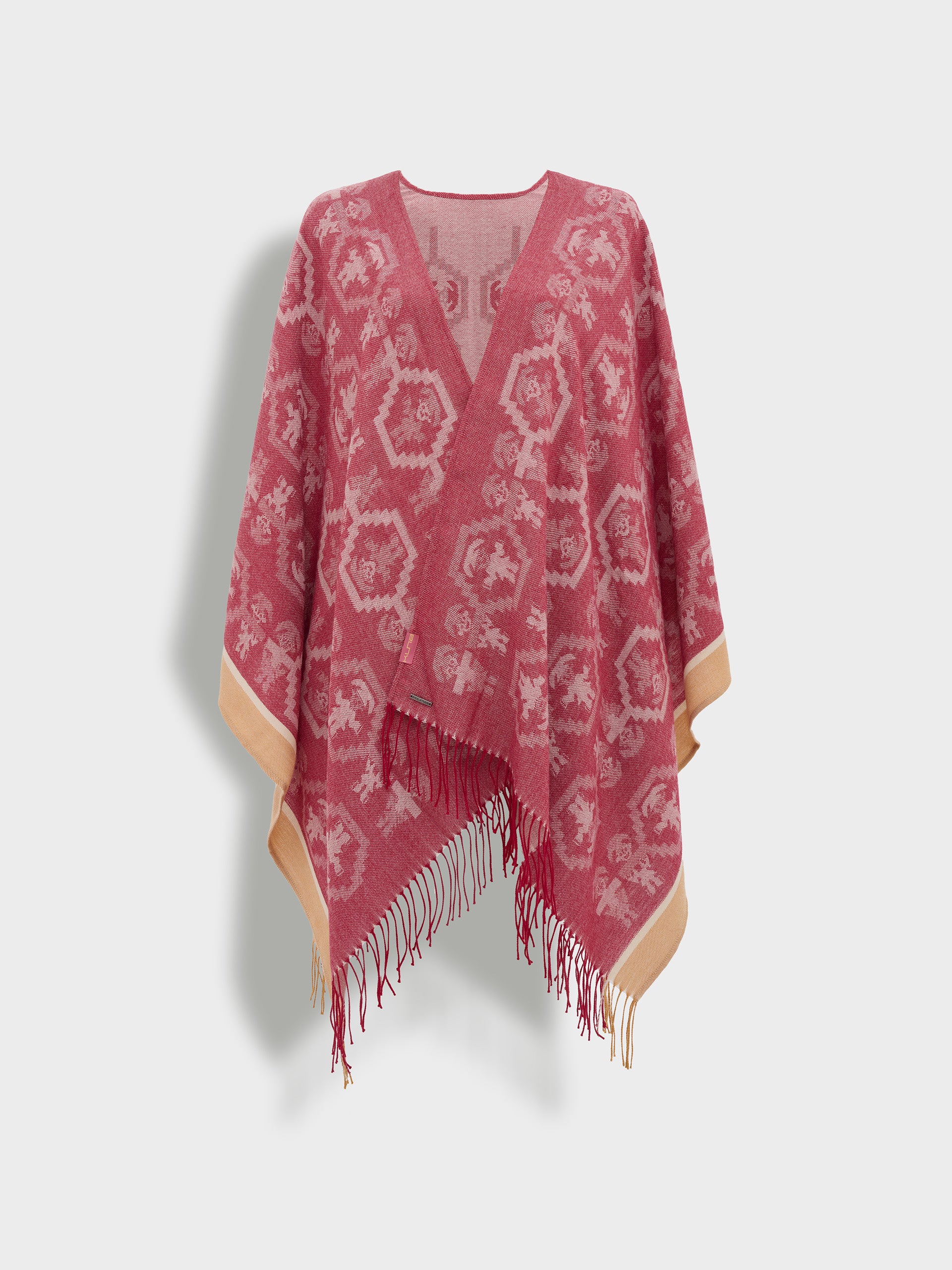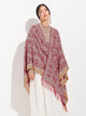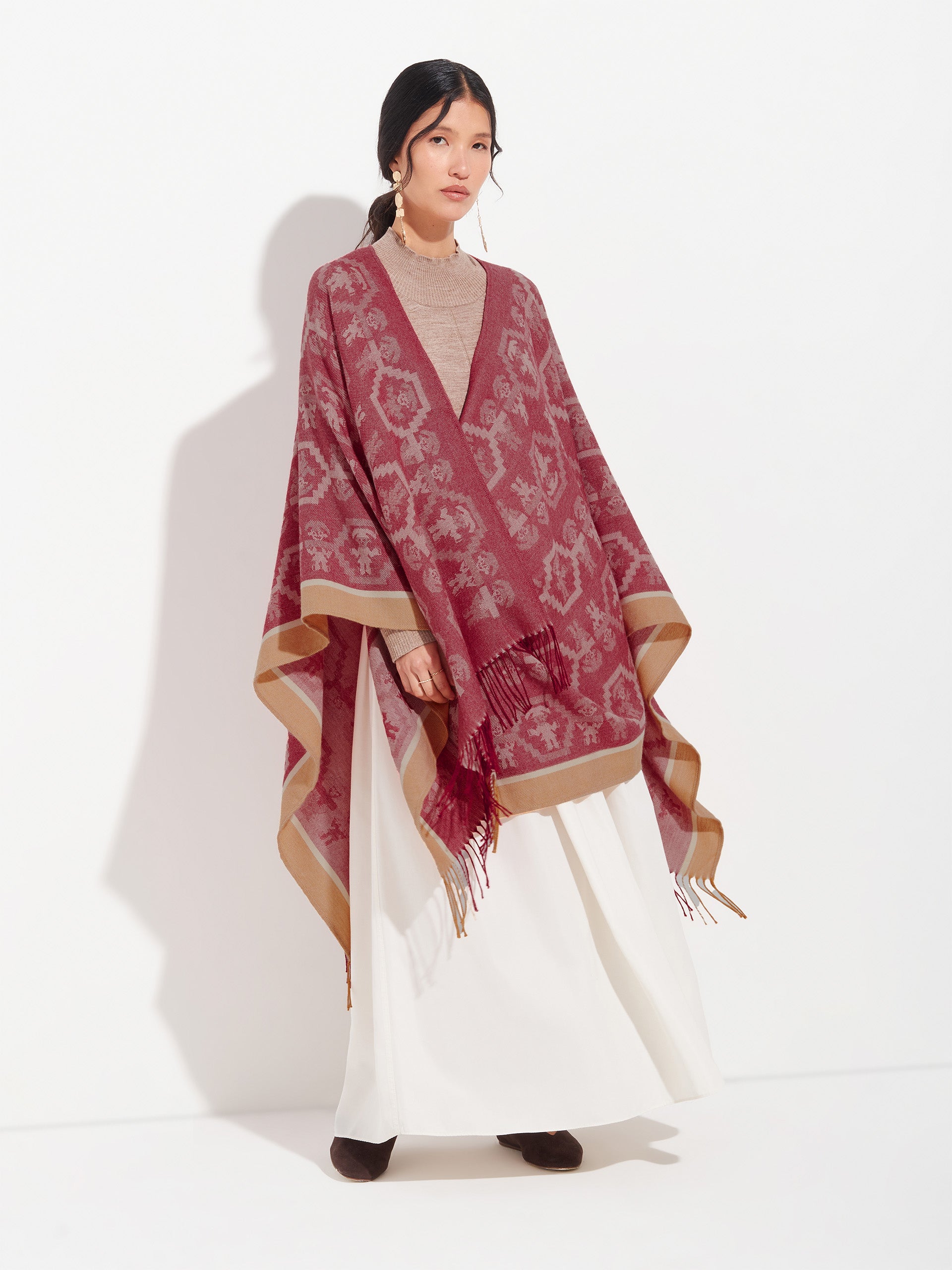 Poncho Chimu 12 en tonalidad rojo, elaborado en 100% Alpaca Royal con técnica Jacquard satín (tela simple). Es una prenda reversible, inspirada en la Cultura Chimú, que refleja el valor de la tradición ancestral a través de un diseño lleno de identidad cultural. | Material predominante: Royal Alpaca