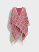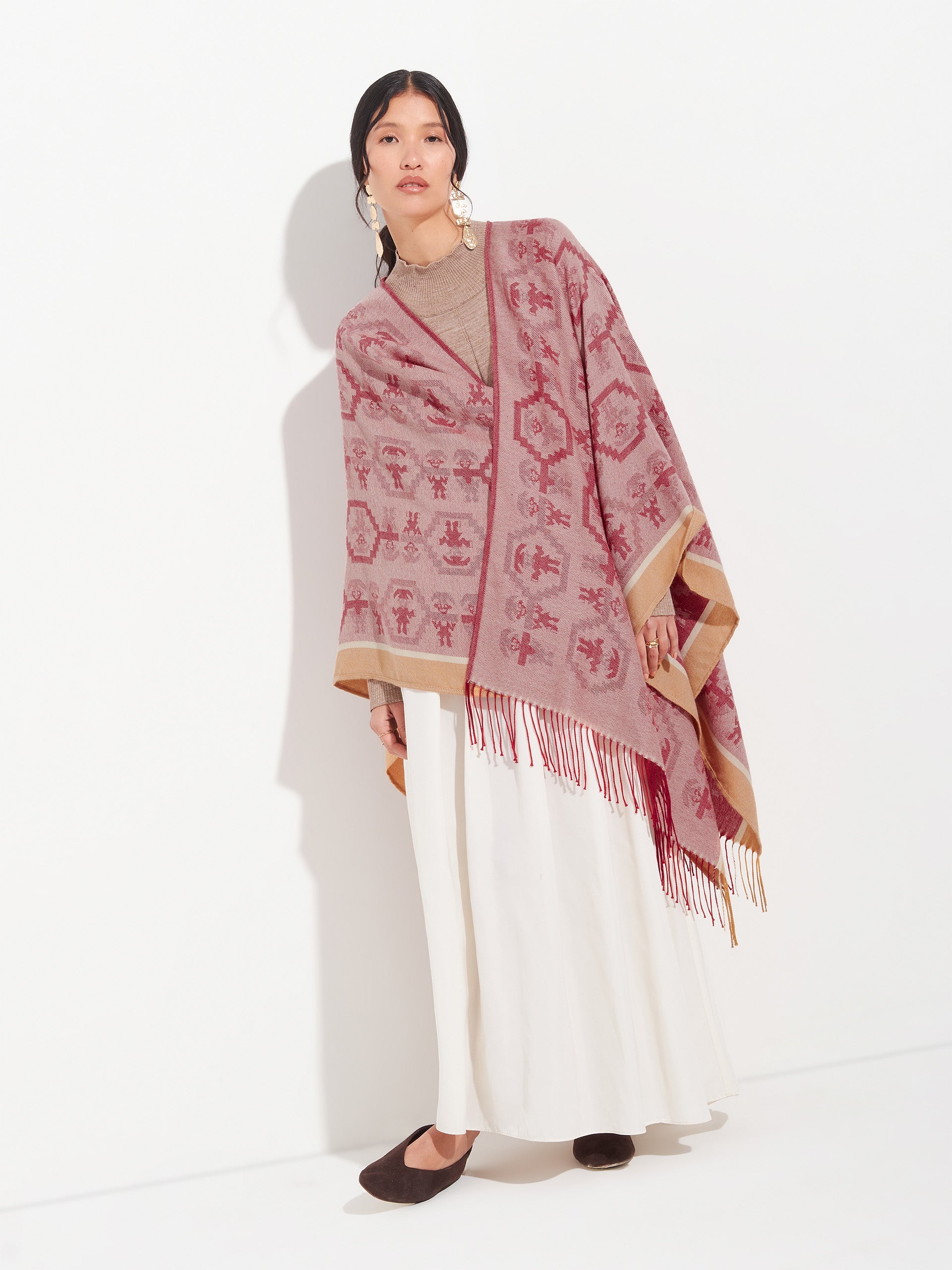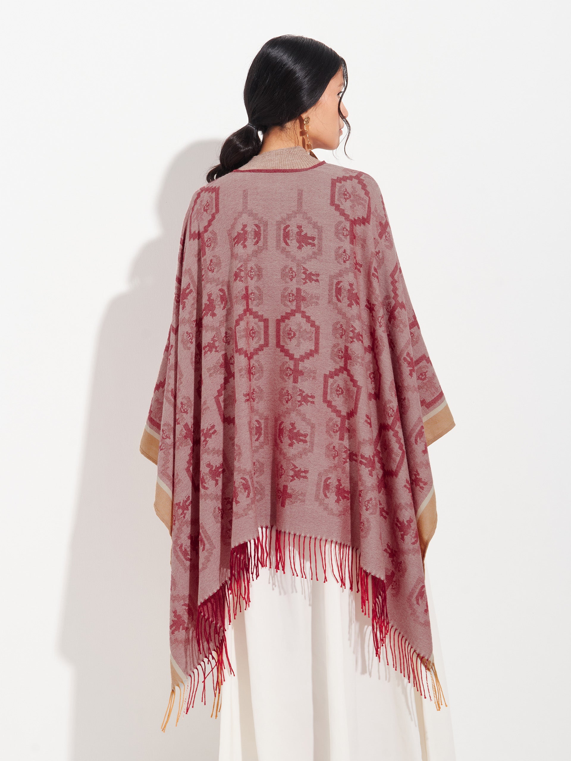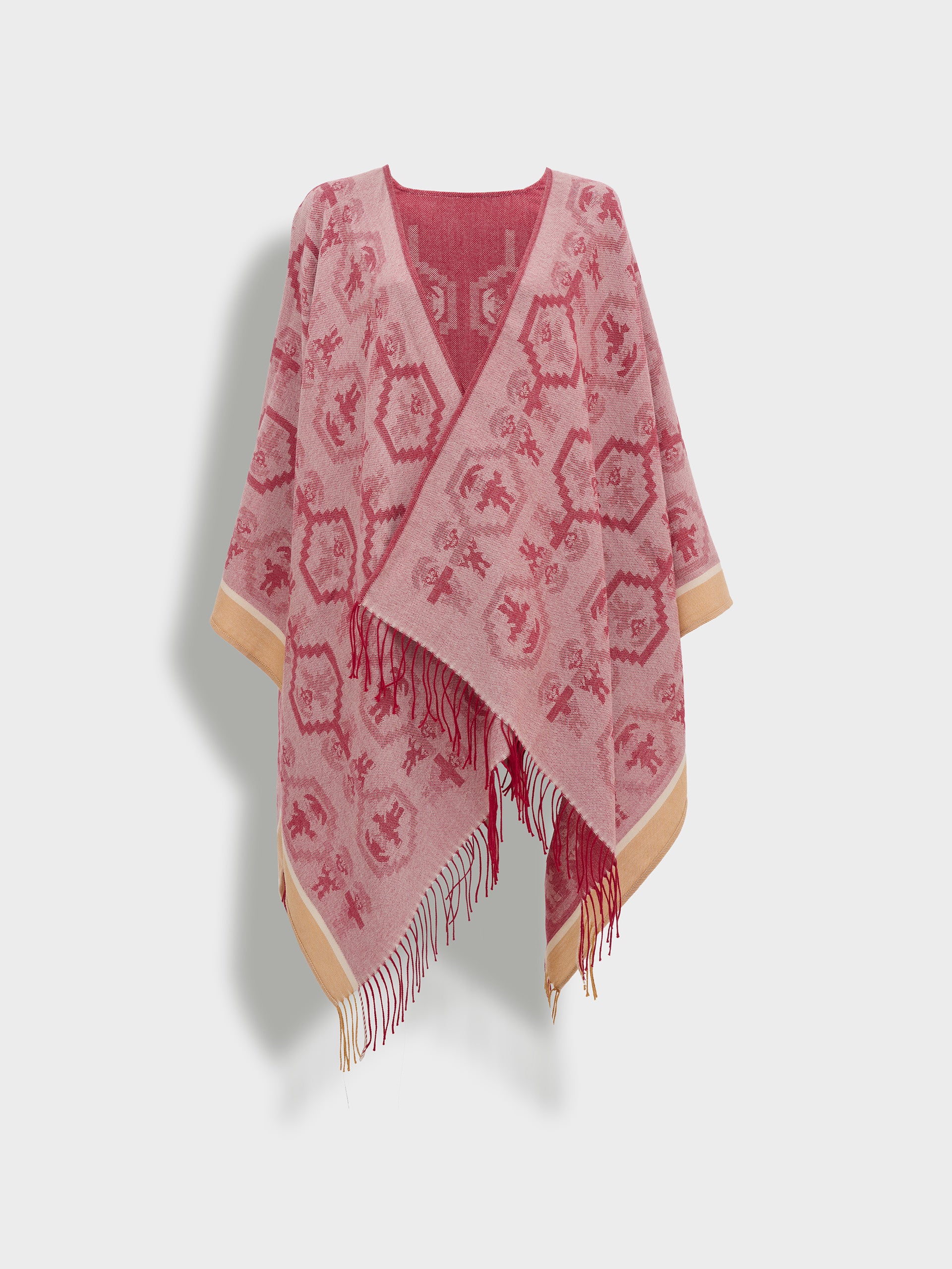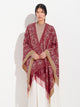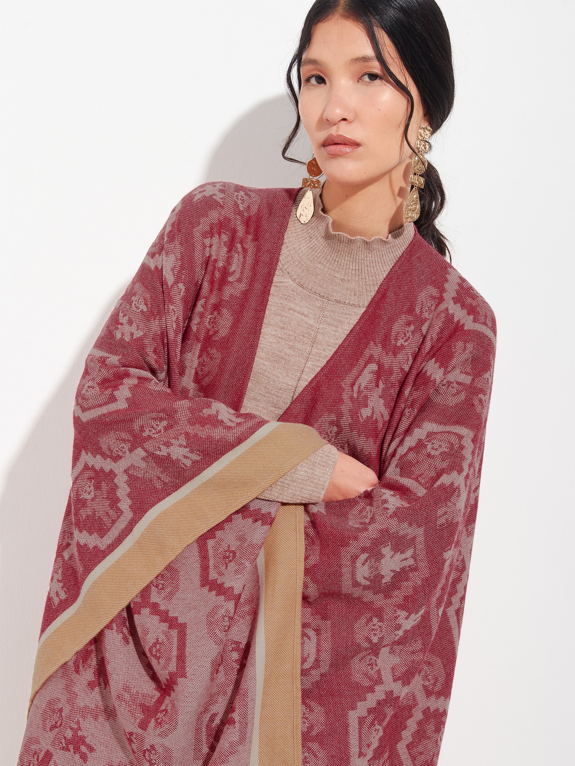 Poncho Chimu 12 en tonalidad rojo, elaborado en 100% Alpaca Royal con técnica Jacquard satín (tela simple). Es una prenda reversible, inspirada en la Cultura Chimú, que refleja el valor de la tradición ancestral a través de un diseño lleno de identidad cultural. | Material predominante: Royal Alpaca
