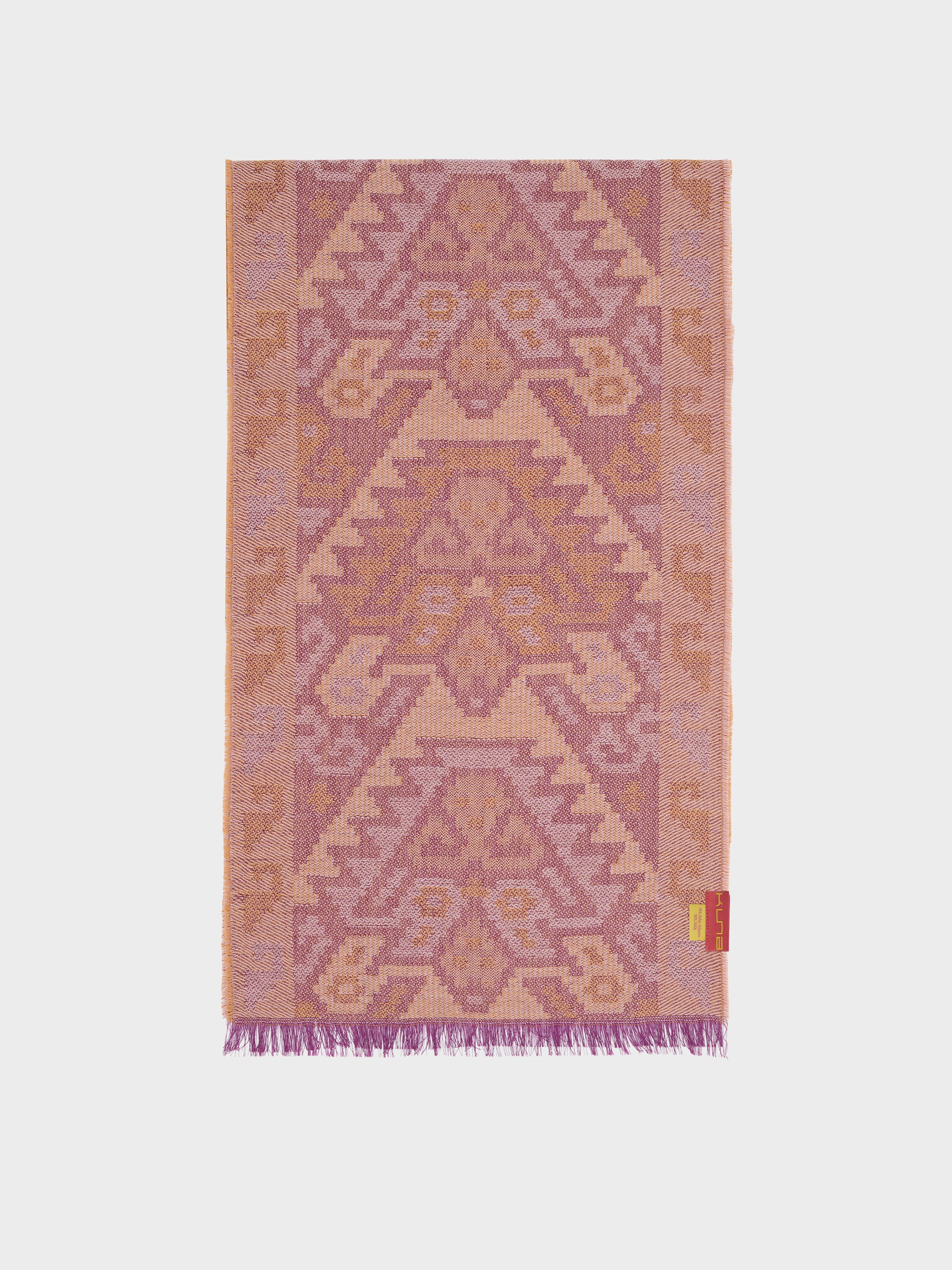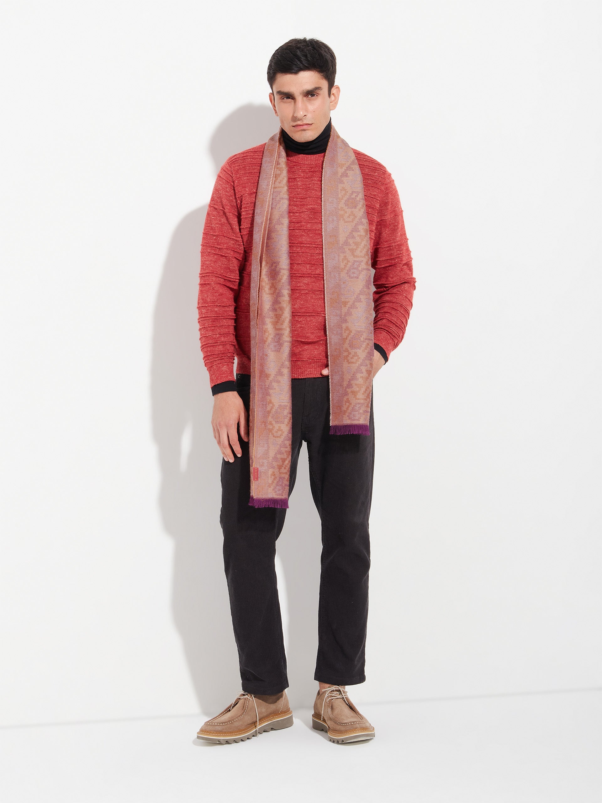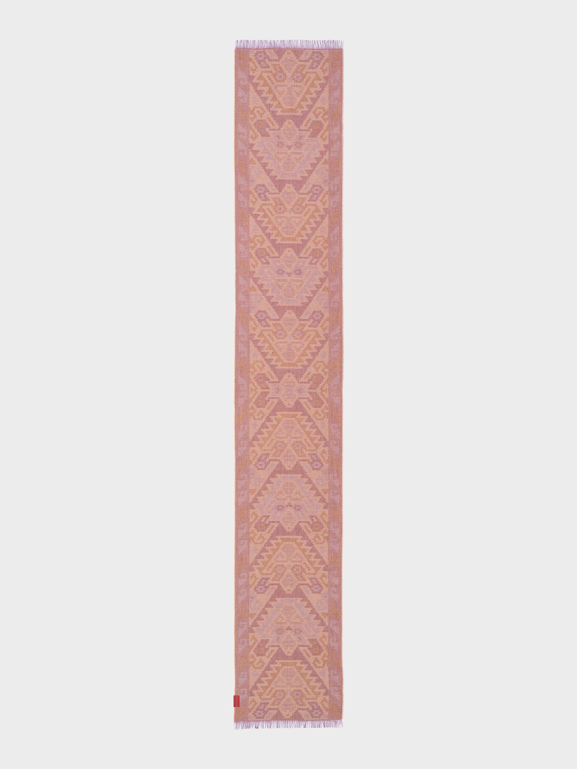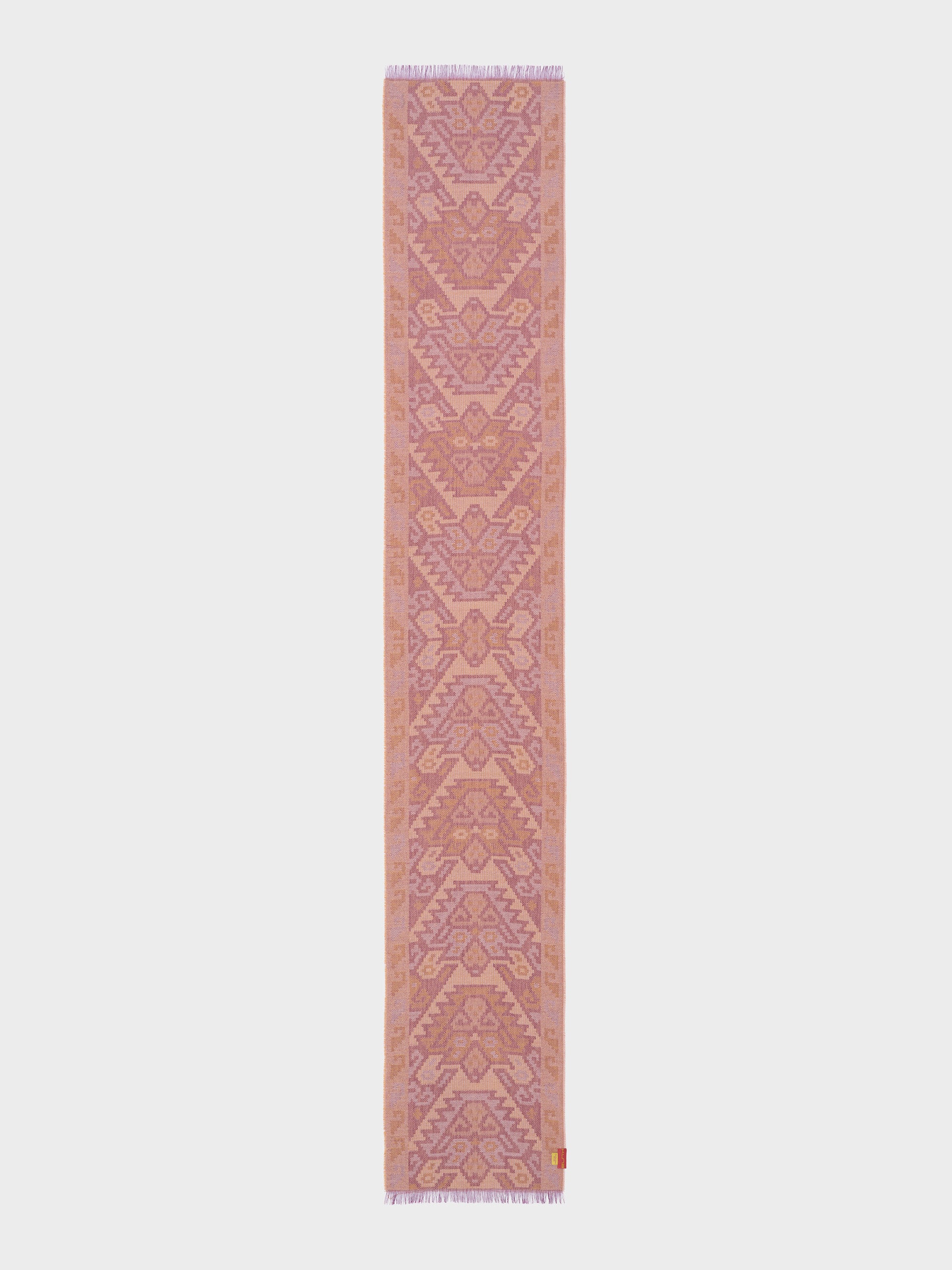 Chalina Chancay 38 en tonalidad rojo, elaborada en 70% baby alpaca y 30% seda, con técnica Jacquard en doble cara. Con una medida de 200/196 x 30 cm, es un accesorio unisex y reversible, inspirado en la Cultura Chancay, que conecta con la memoria ancestral a través de un diseño auténticamente cultural. | Material predominante: Baby Alpaca