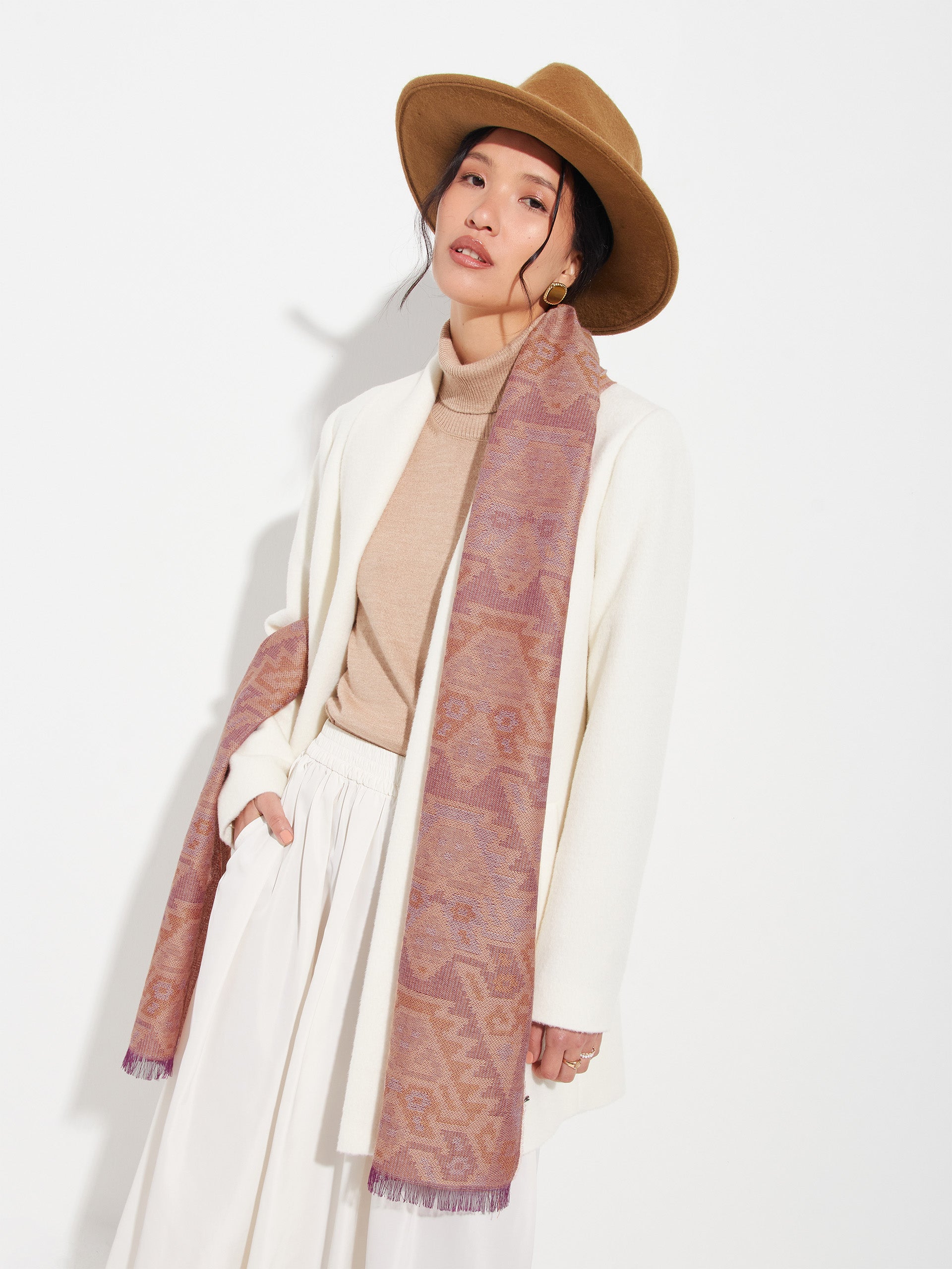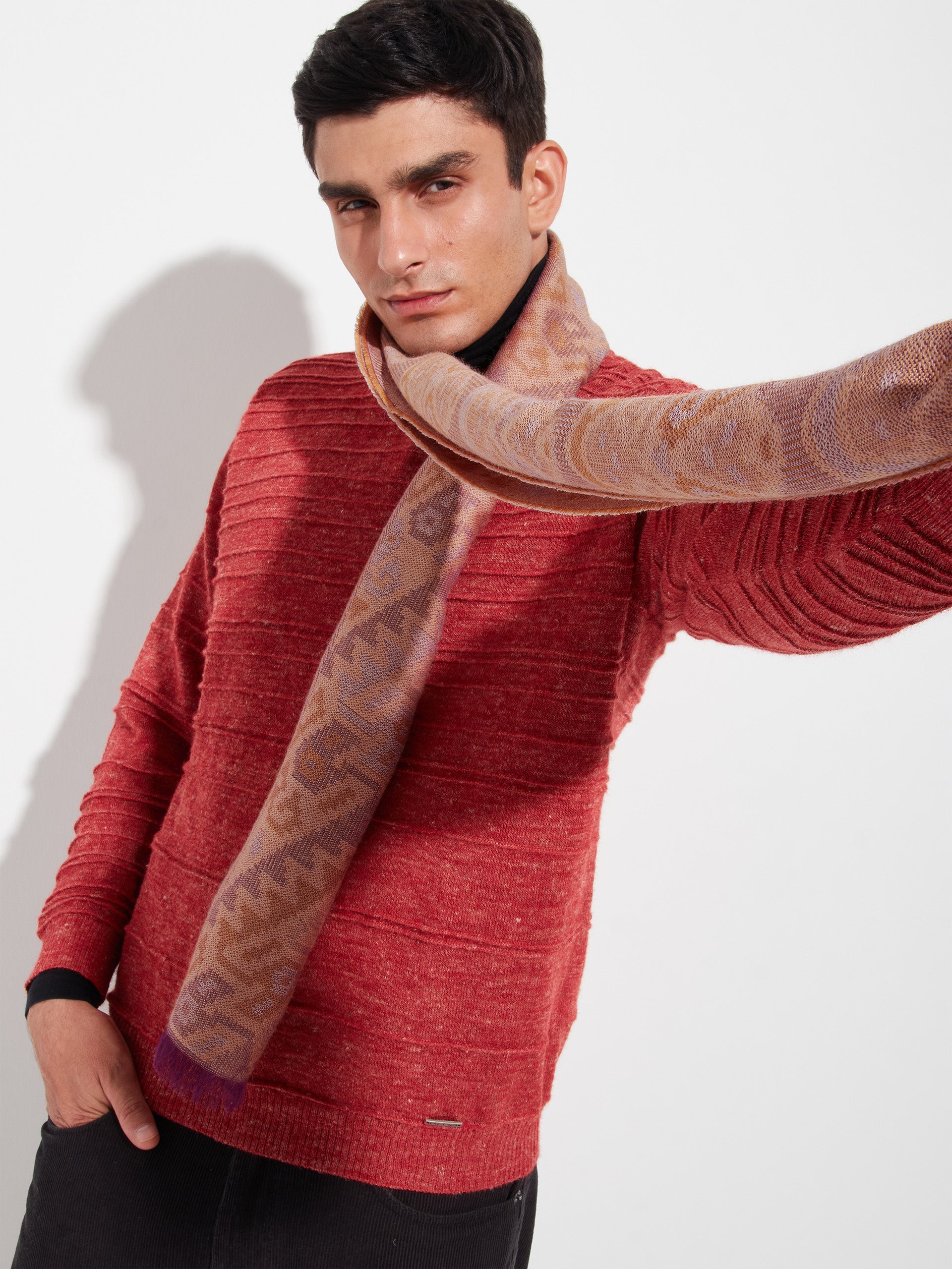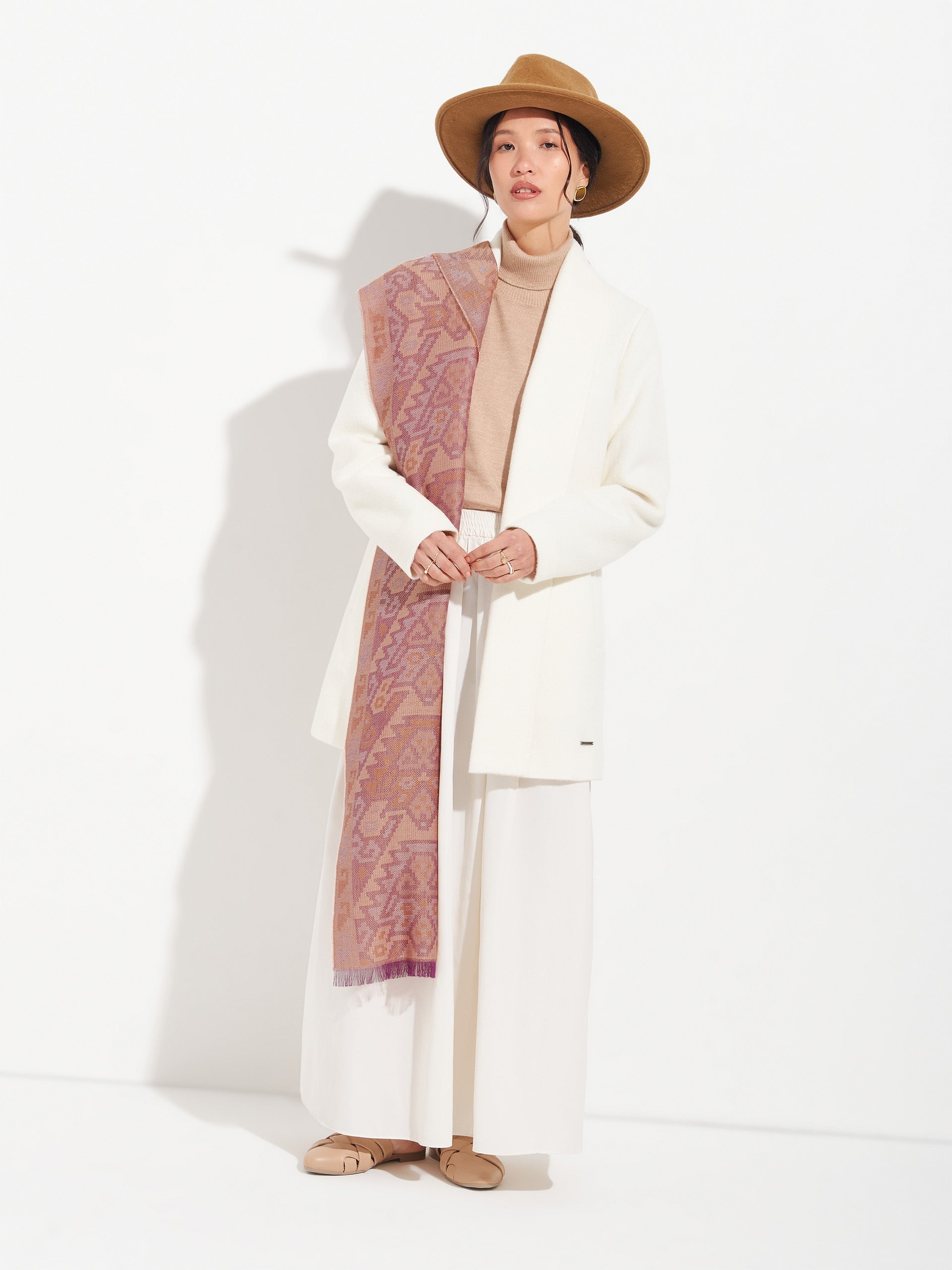 Chalina Chancay 38 en tonalidad rojo, elaborada en 70% baby alpaca y 30% seda, con técnica Jacquard en doble cara. Con una medida de 200/196 x 30 cm, es un accesorio unisex y reversible, inspirado en la Cultura Chancay, que conecta con la memoria ancestral a través de un diseño auténticamente cultural. | Material predominante: Baby Alpaca