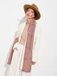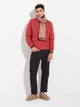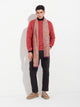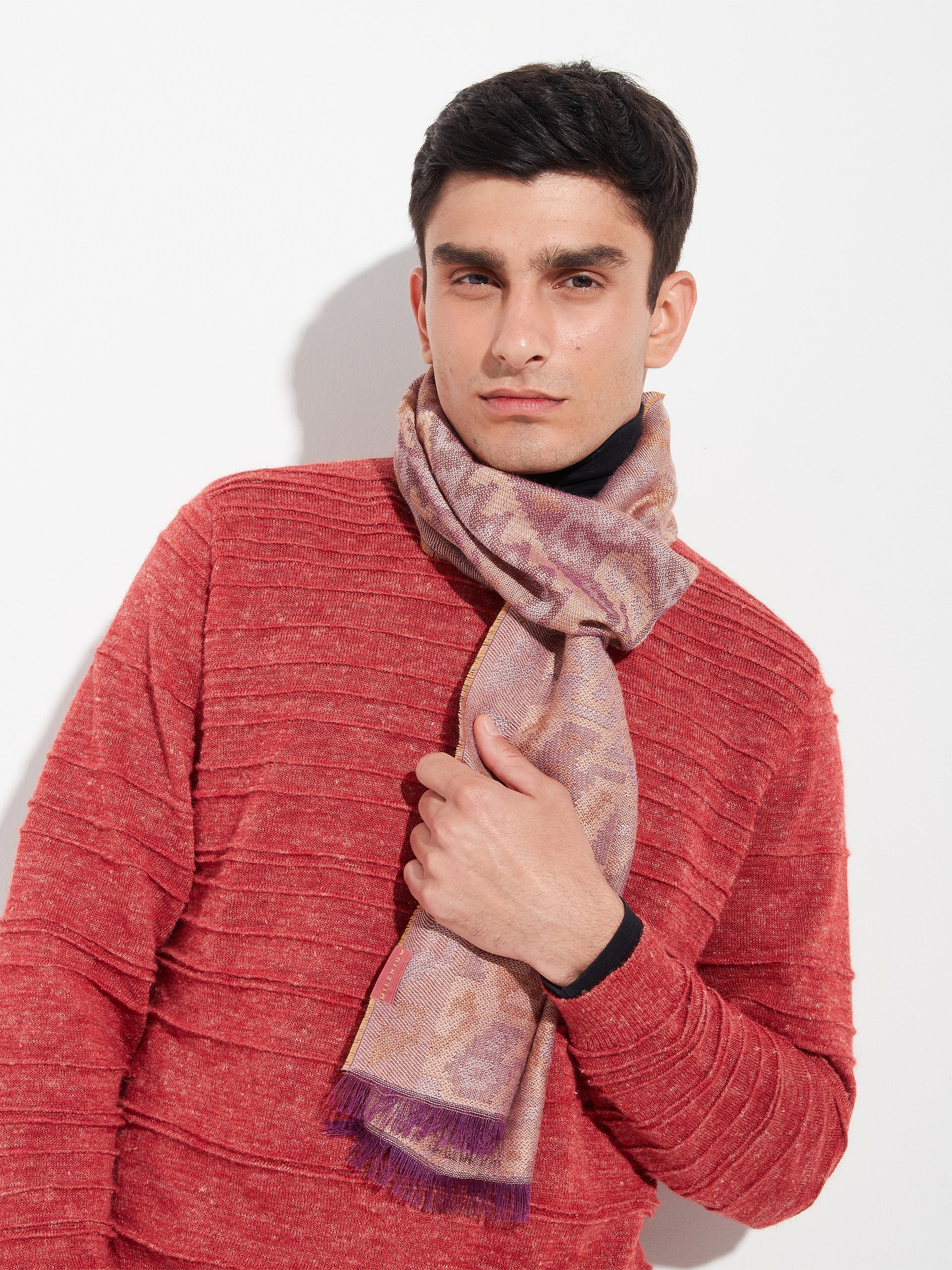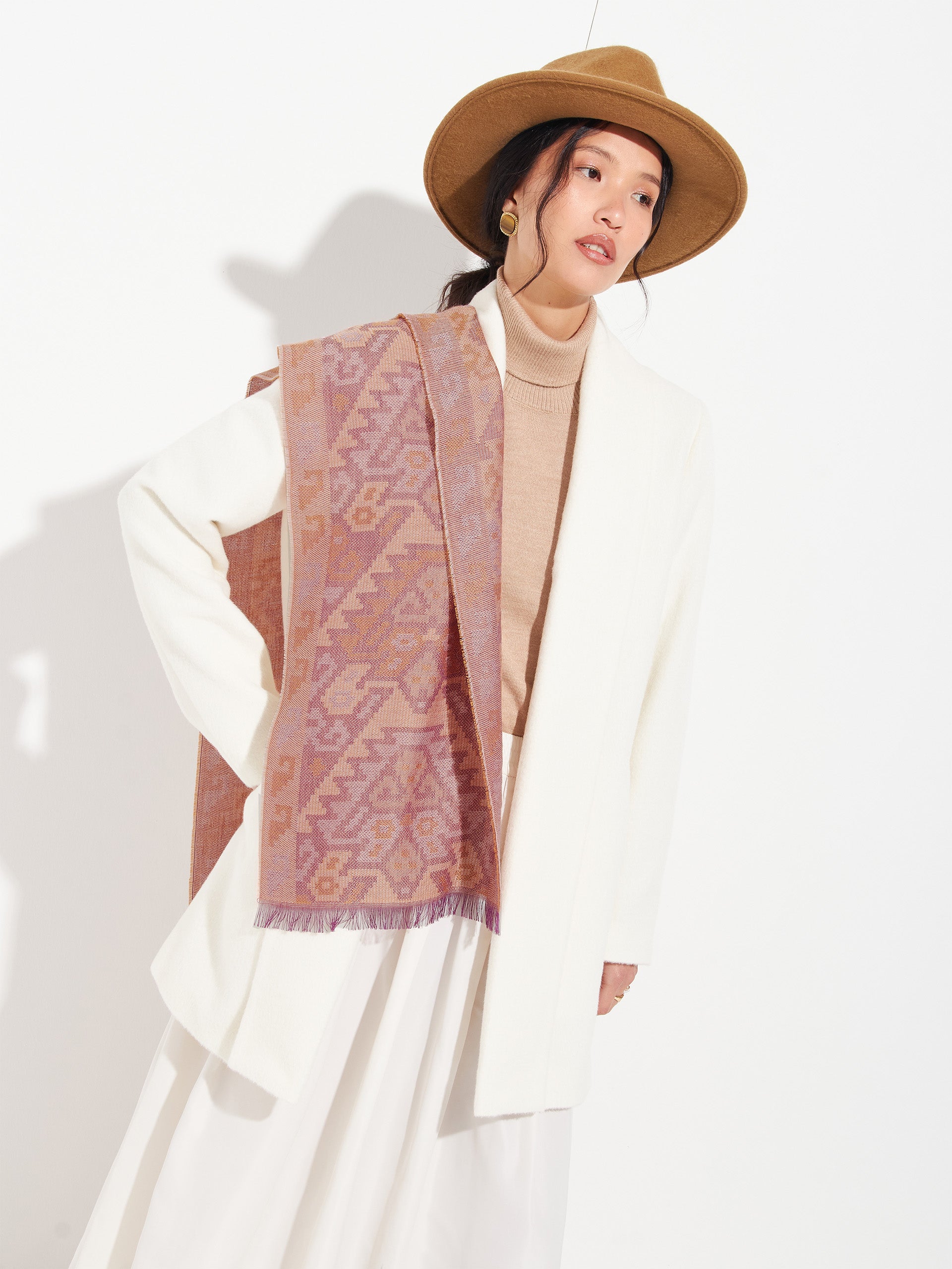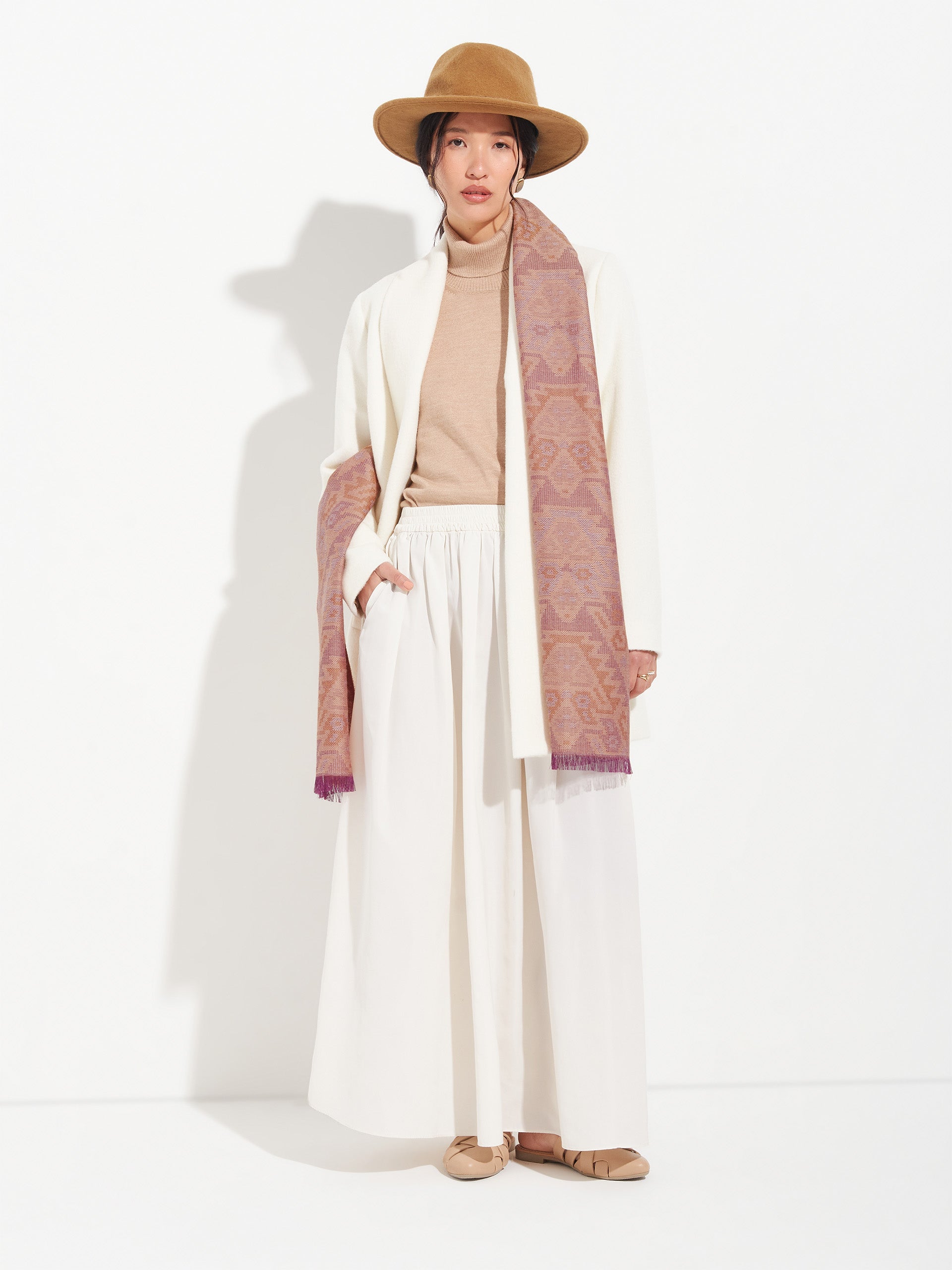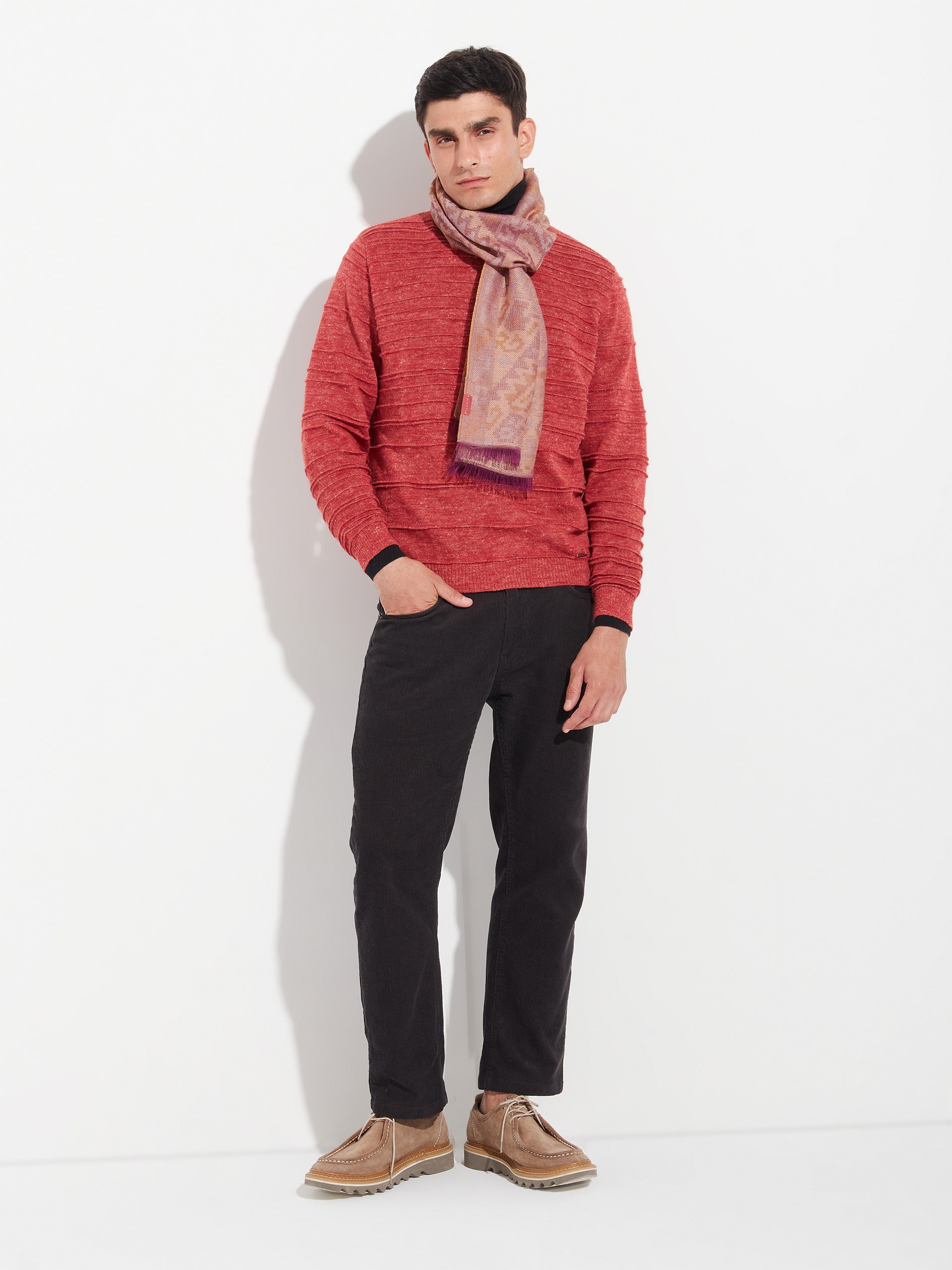 Chalina Chancay 38 en tonalidad rojo, elaborada en 70% baby alpaca y 30% seda, con técnica Jacquard en doble cara. Con una medida de 200/196 x 30 cm, es un accesorio unisex y reversible, inspirado en la Cultura Chancay, que conecta con la memoria ancestral a través de un diseño auténticamente cultural. | Material predominante: Baby Alpaca
