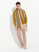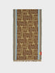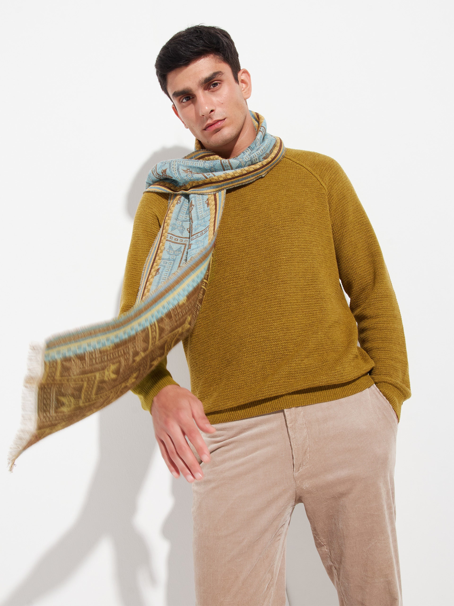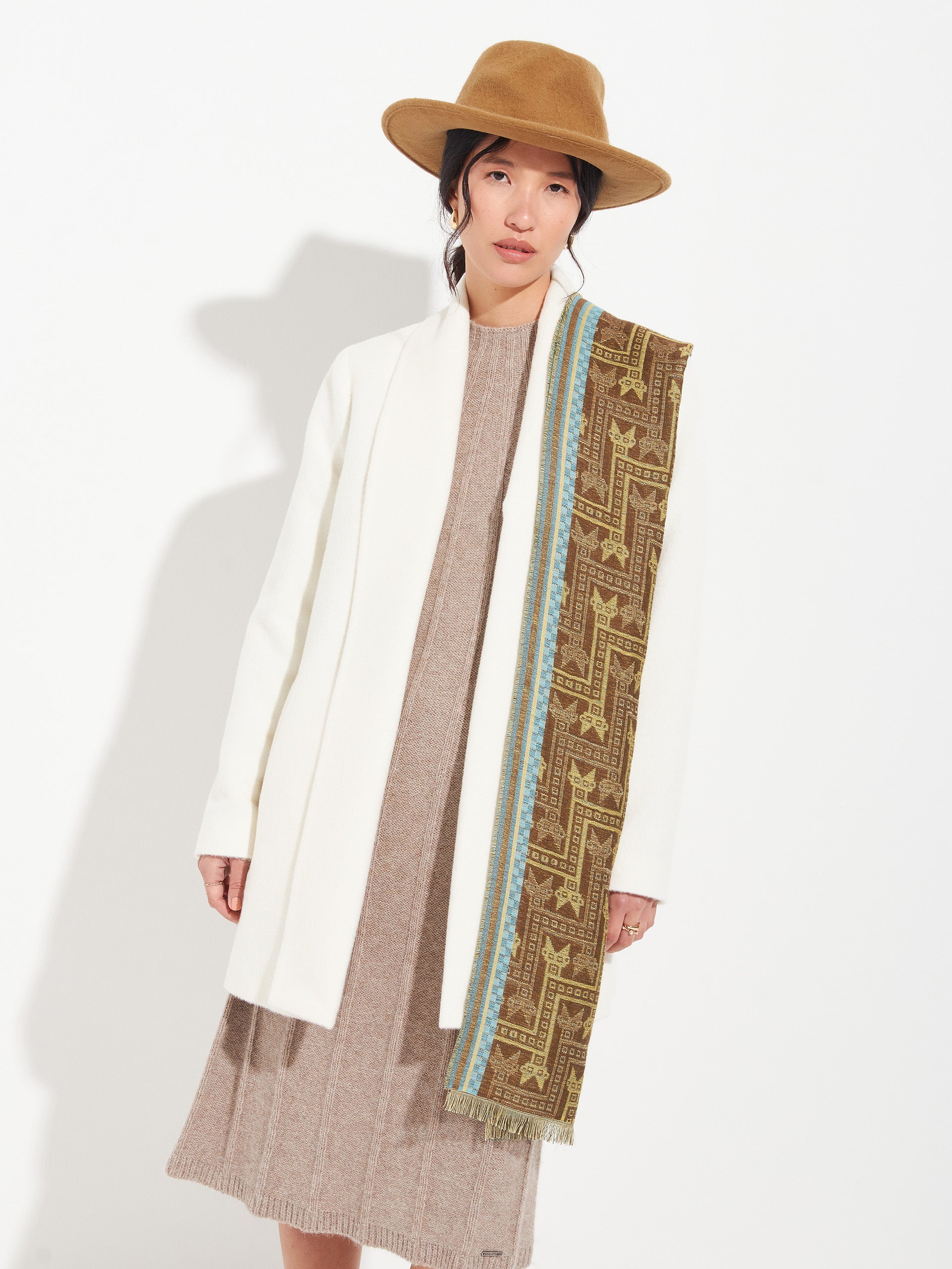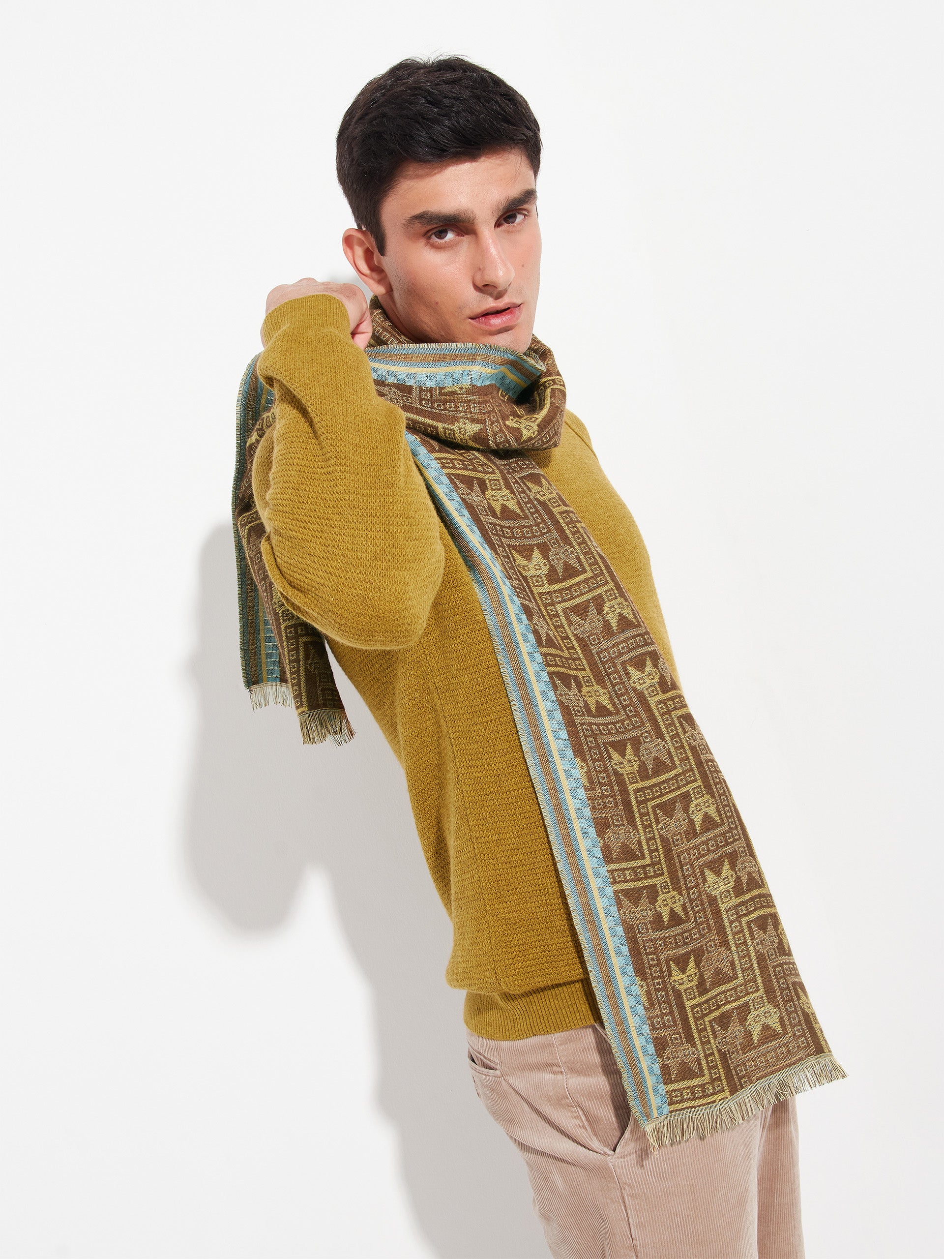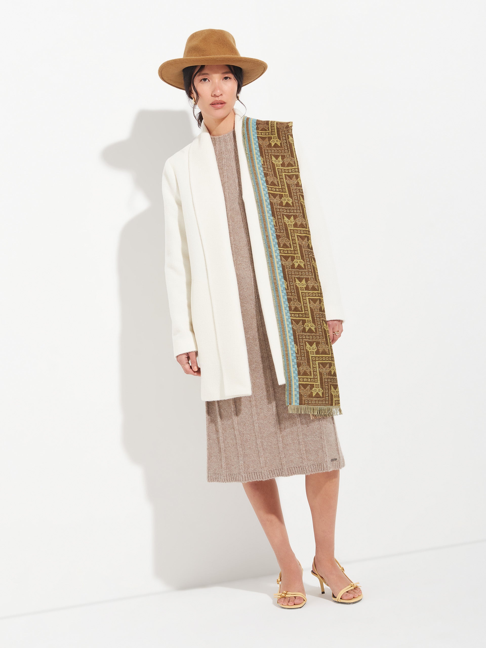 Chalina Chancay 39 en tonalidad amarillo, elaborada en 70% baby alpaca y 30% seda, con técnica Jacquard en doble tela e inserción de trama oculta. Con una medida de 180/176 x 30 cm, es un accesorio unisex y reversible, inspirado en la Cultura Chancay, que evoca la riqueza de las tradiciones antiguas a través de un diseño con identidad cultural. | Material predominante: Baby Alpaca