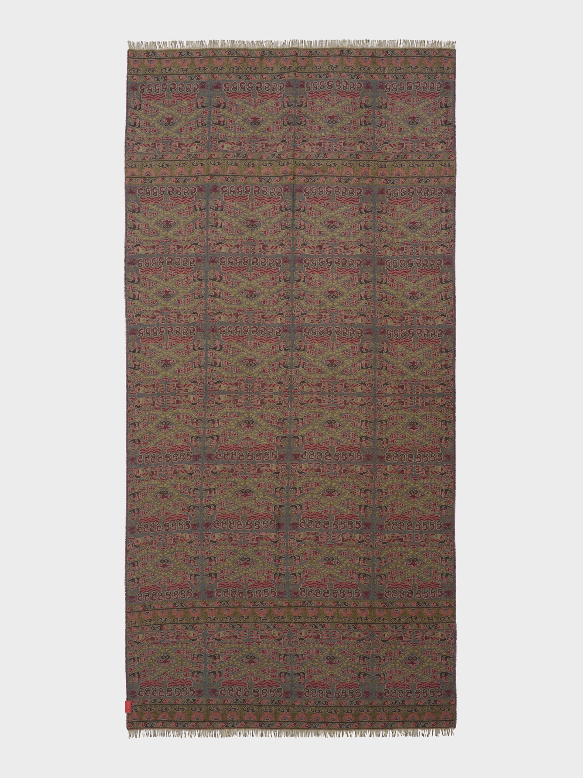 Estola Lambayeque 8 en tonalidad amarillo, elaborada en 50% Royal alpaca y 50% seda, con técnica Jacquard en doble tela e inserción de trama oculta. Con una medida de 200/196 x 93 cm, es una prenda reversible, inspirada en la Cultura Lambayeque, que mantiene viva la tradición ancestral en un diseño representativo de la identidad cultural. Colección en homenaje a los 100 años del Museo Larco. | Material predominante: Royal Alpaca y Seda