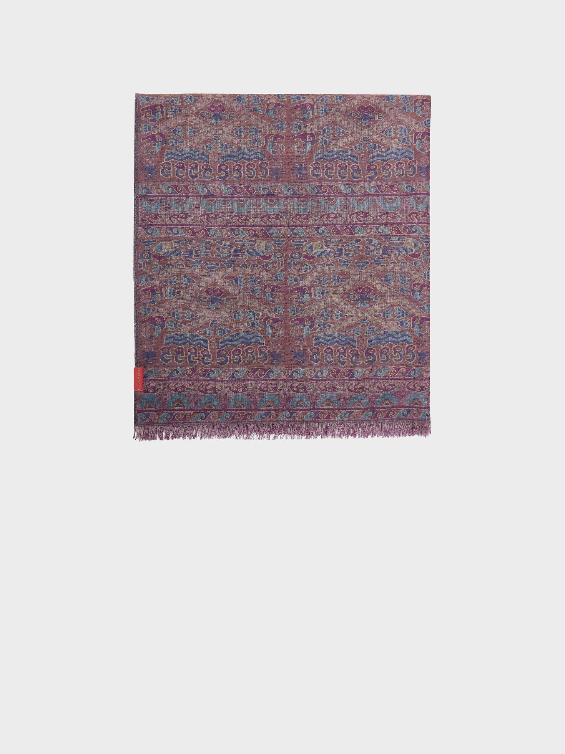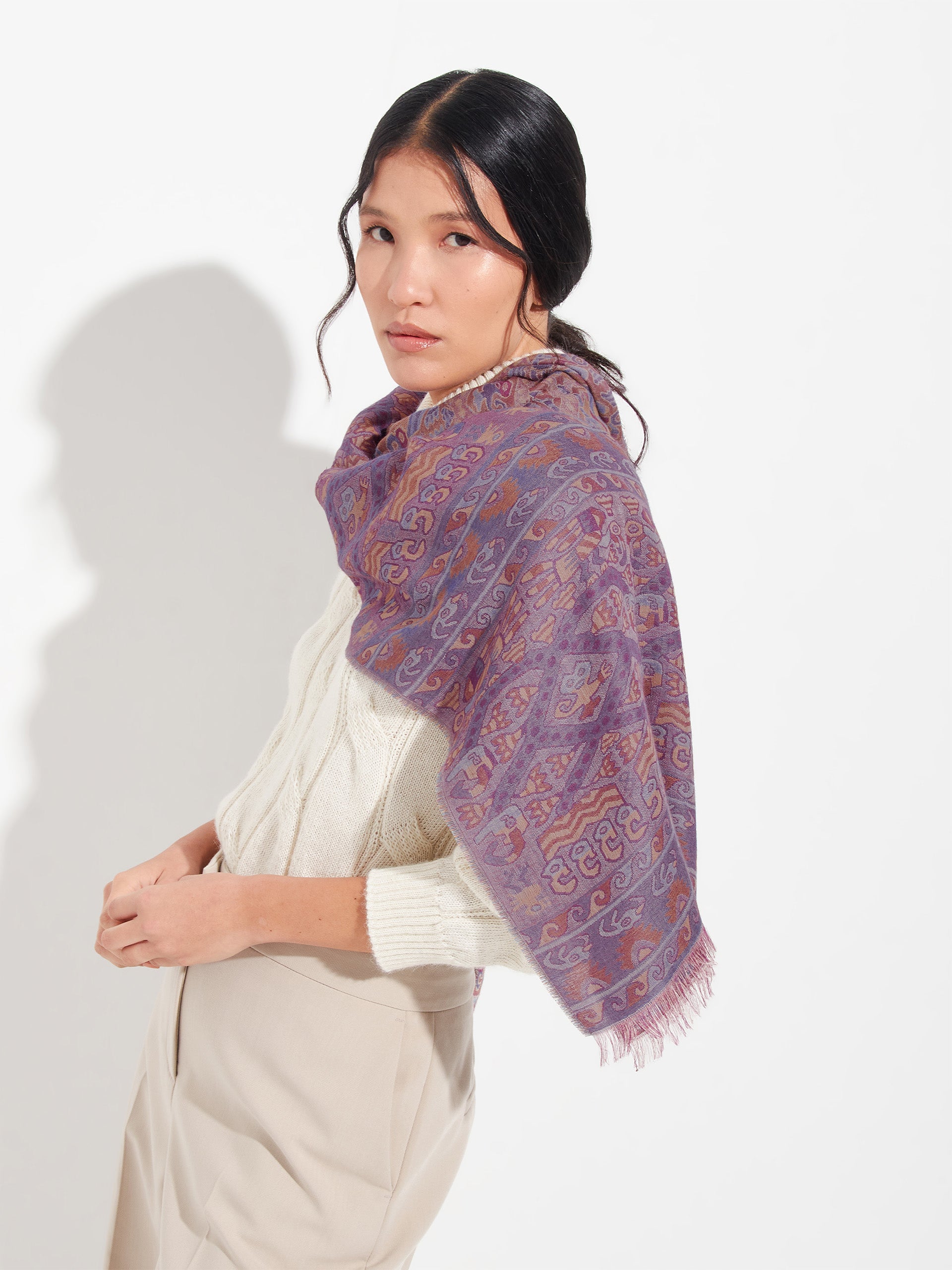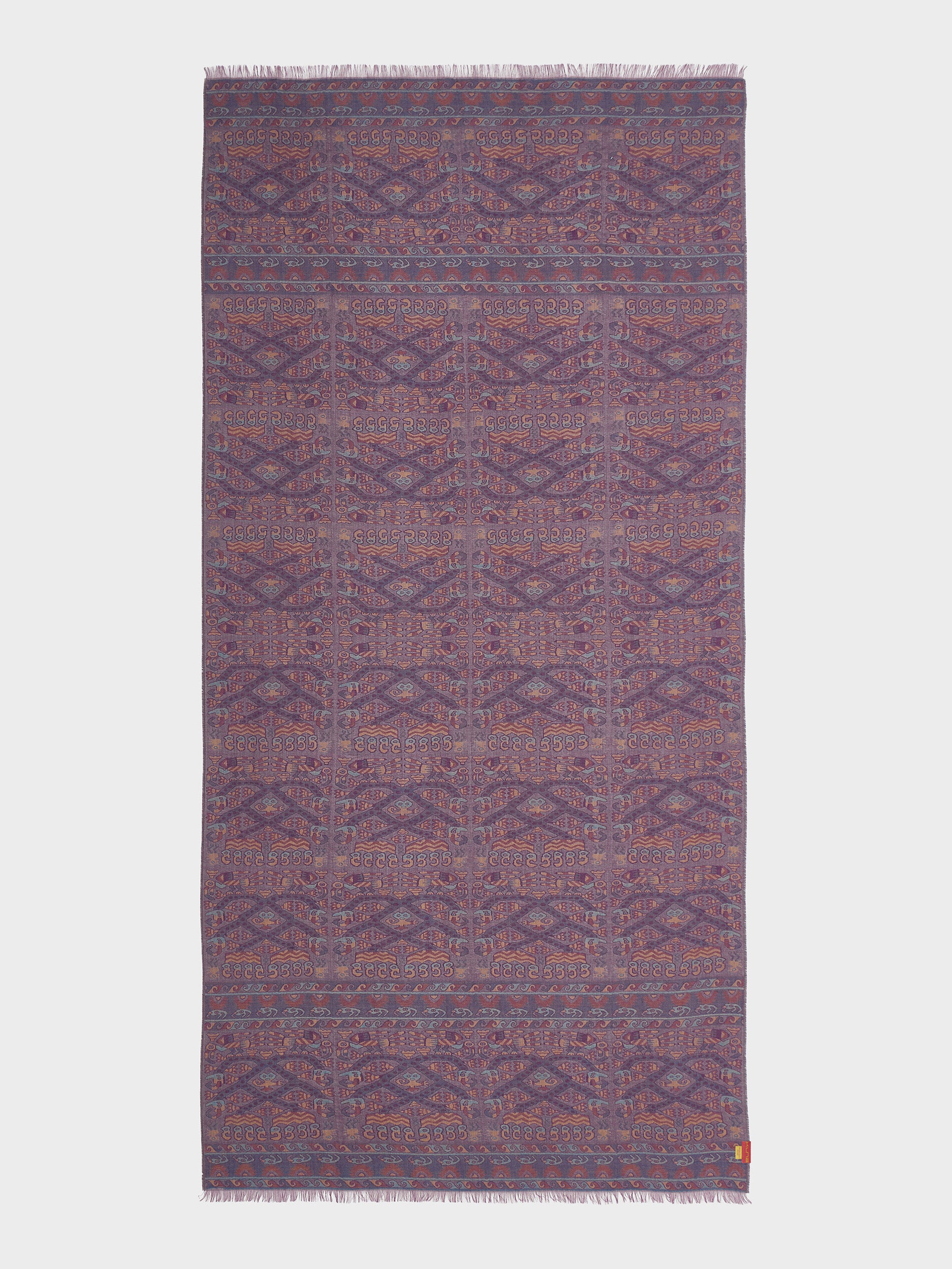 Estola Lambayeque 8 en tonalidad rojo, elaborada en 50% Royal alpaca y 50% seda, con técnica Jacquard en doble tela e inserción de trama oculta. Con una medida de 200/196 x 93 cm, es una prenda reversible, inspirada en la Cultura Lambayeque, que mantiene viva la tradición ancestral en un diseño representativo de la identidad cultural. Colección en homenaje a los 100 años del Museo Larco. | Material predominante: Royal Alpaca y Seda