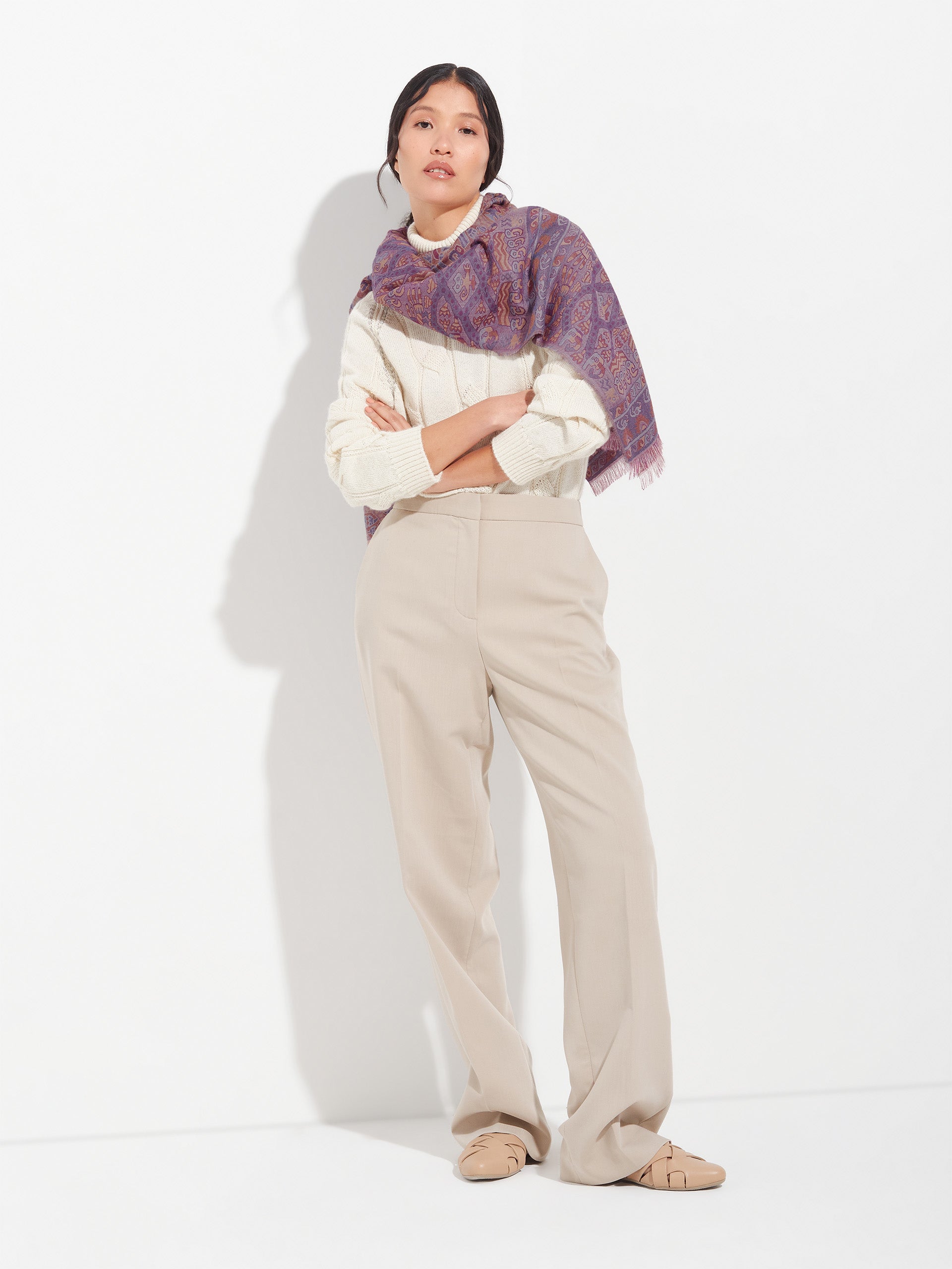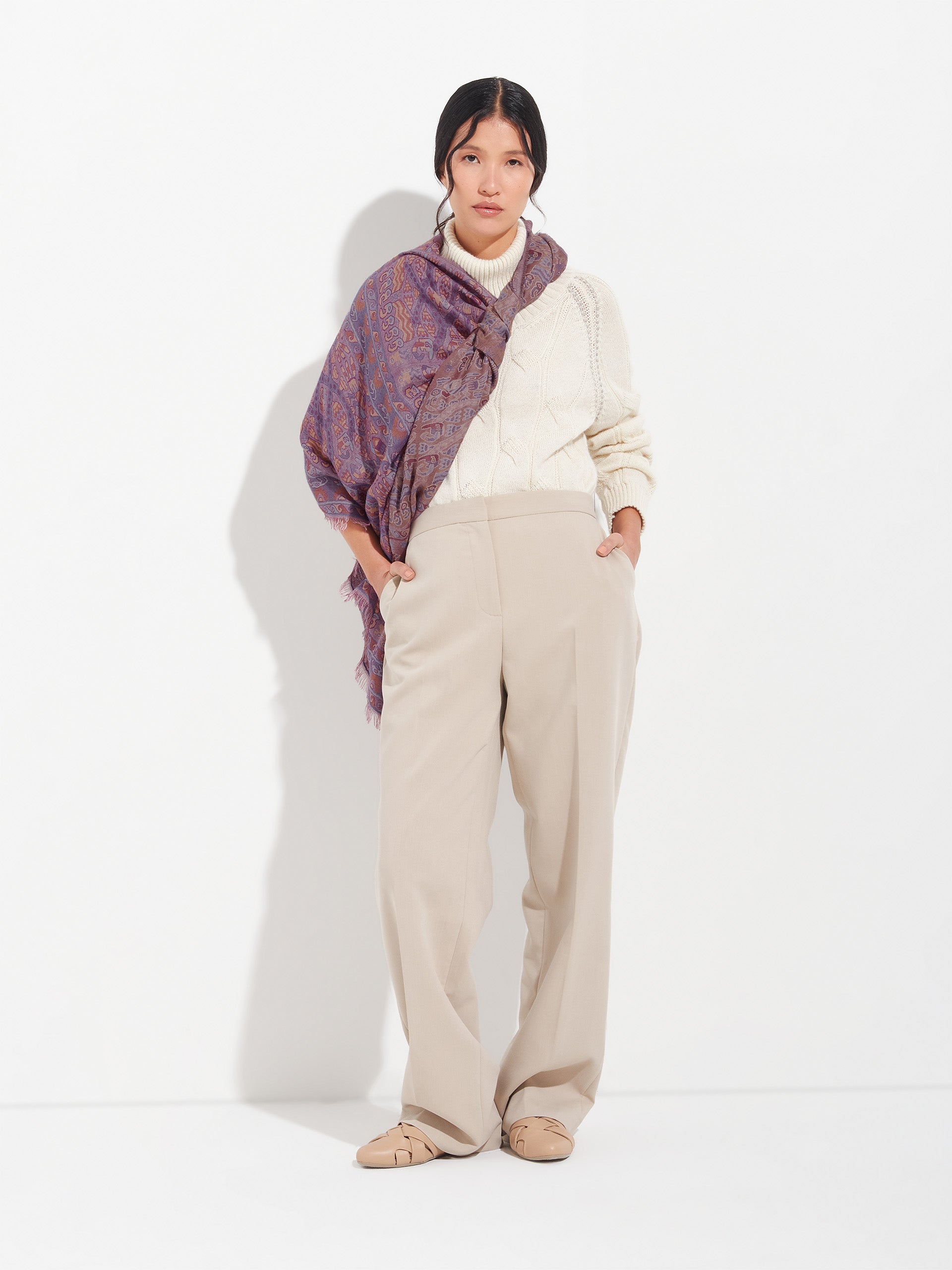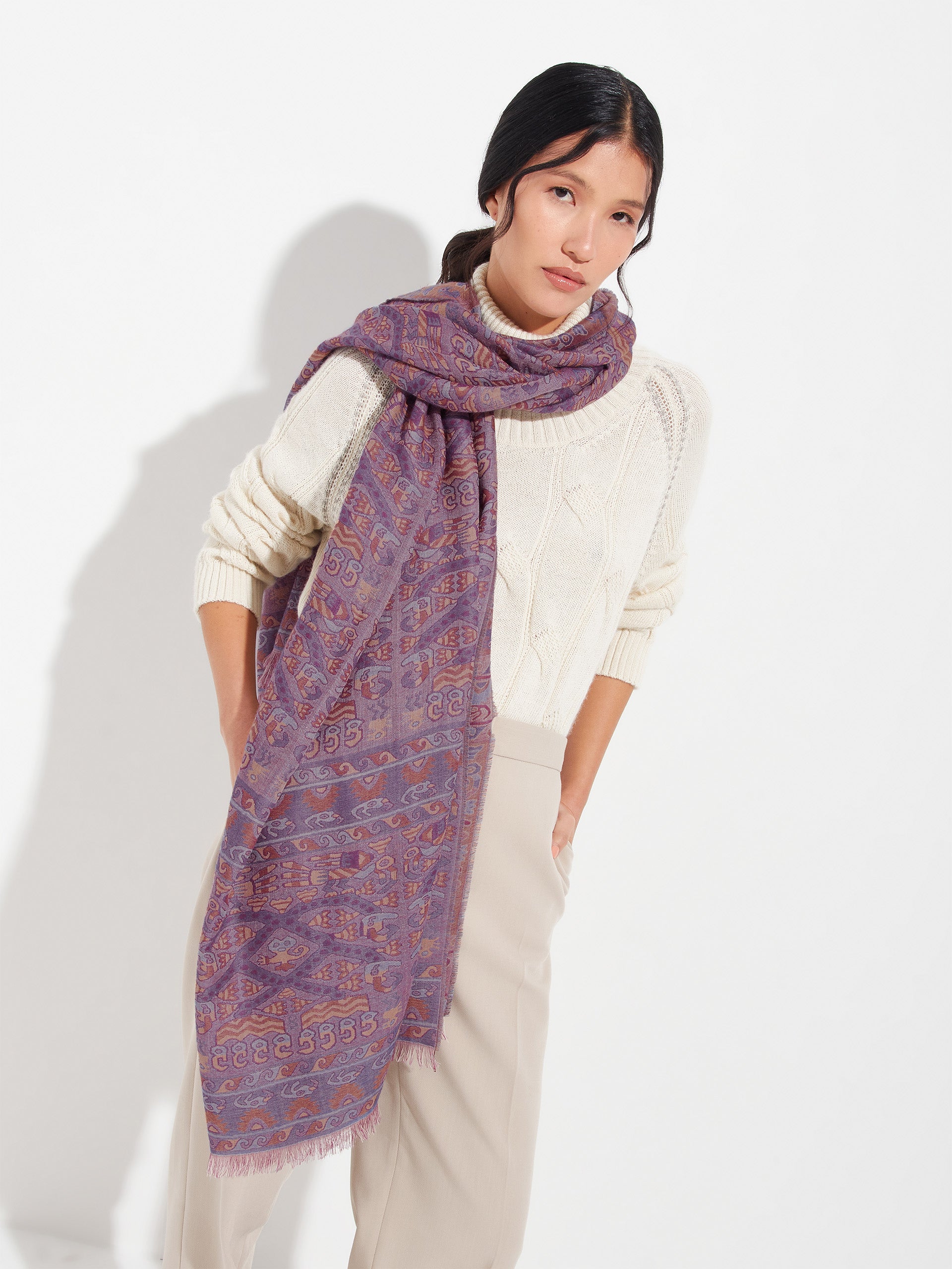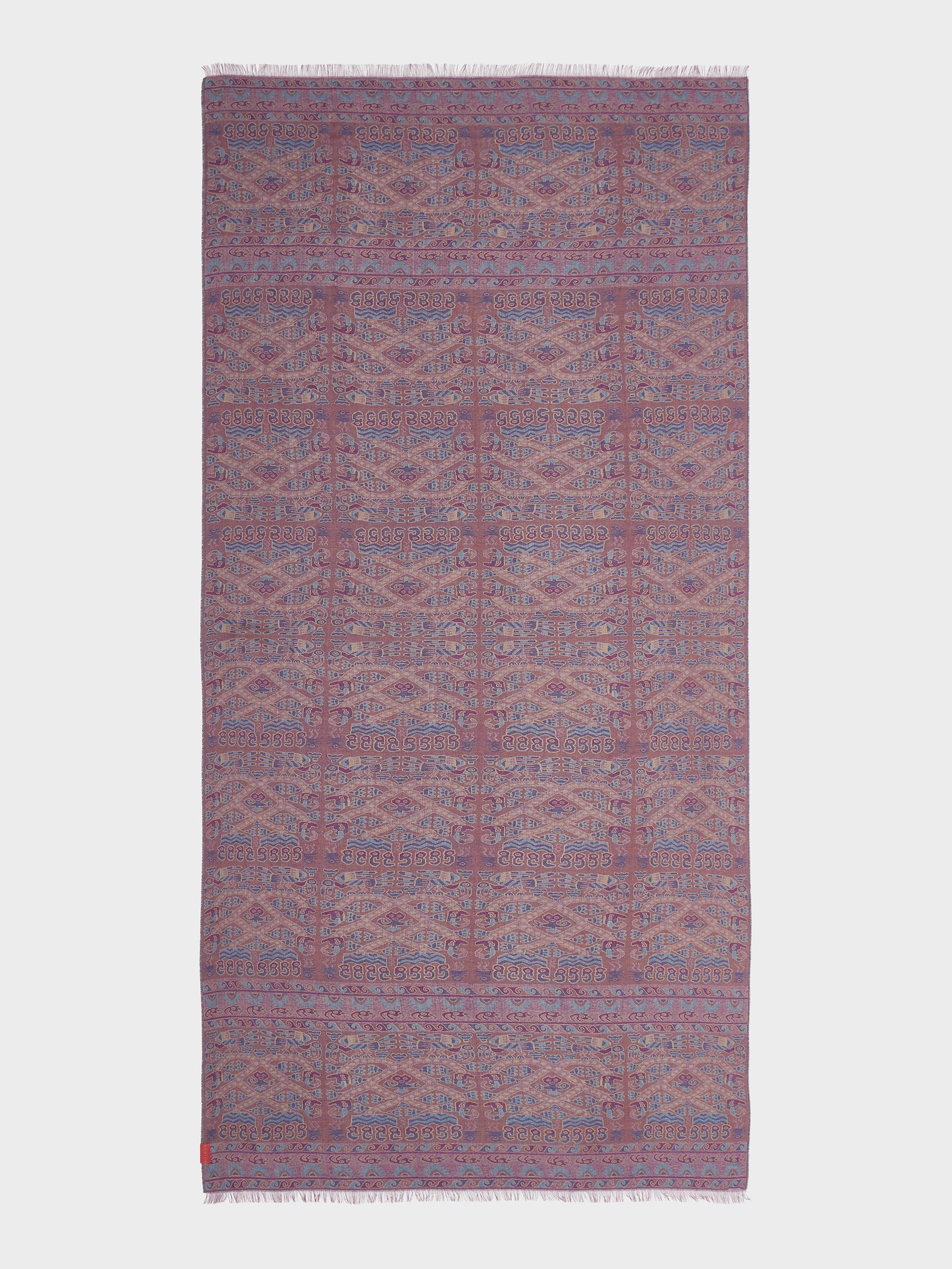 Estola Lambayeque 8 en tonalidad rojo, elaborada en 50% Royal alpaca y 50% seda, con técnica Jacquard en doble tela e inserción de trama oculta. Con una medida de 200/196 x 93 cm, es una prenda reversible, inspirada en la Cultura Lambayeque, que mantiene viva la tradición ancestral en un diseño representativo de la identidad cultural. Colección en homenaje a los 100 años del Museo Larco. | Material predominante: Royal Alpaca y Seda