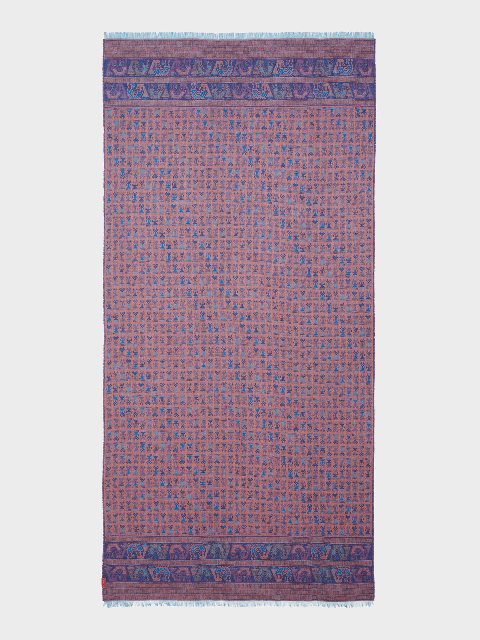 Estola Lambayeque 9 en tonalidad azul, elaborada en 50% Royal alpaca y 50% seda, con técnica Jacquard en doble tela e inserción de trama oculta. Con una medida de 200/196 x 93 cm, es una prenda reversible, inspirada en la Cultura Lambayeque, que reinterpreta la tradición ancestral a través de un diseño con esencia cultural. Colección en homenaje a los 100 años del Museo Larco. | Material predominante: Royal Alpaca y Seda