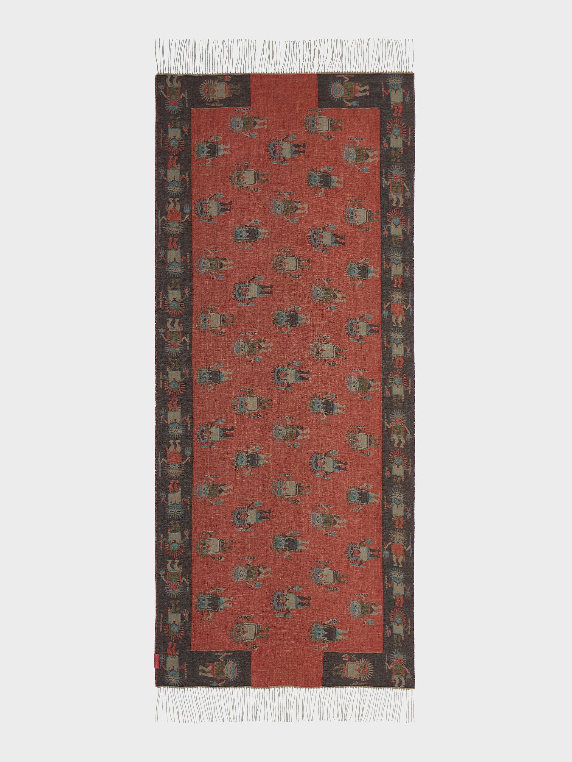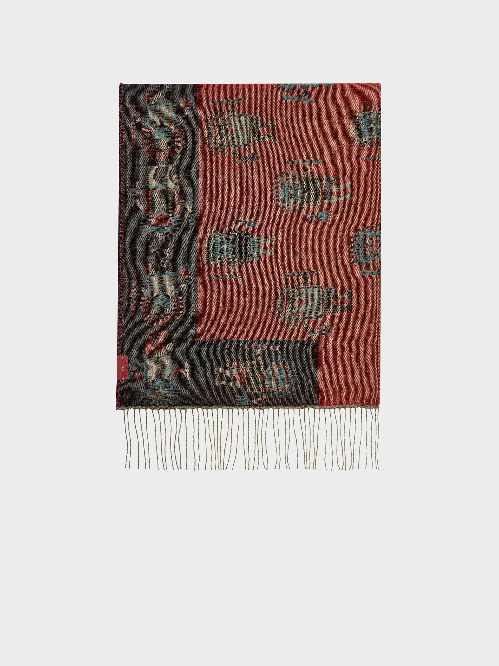 Estola Nazca 53 en tonalidad azul, confeccionada en 70% baby alpaca y 30% seda, trabajada en Jacquard de doble tela con inserción de trama oculta. Sus dimensiones son 200/180 x 75 cm y se trata de una pieza reversible, inspirada en la Cultura Nazca, que revive el legado ancestral a través de un diseño basado en la cultura originaria. | Material predominante: Baby Alpaca