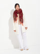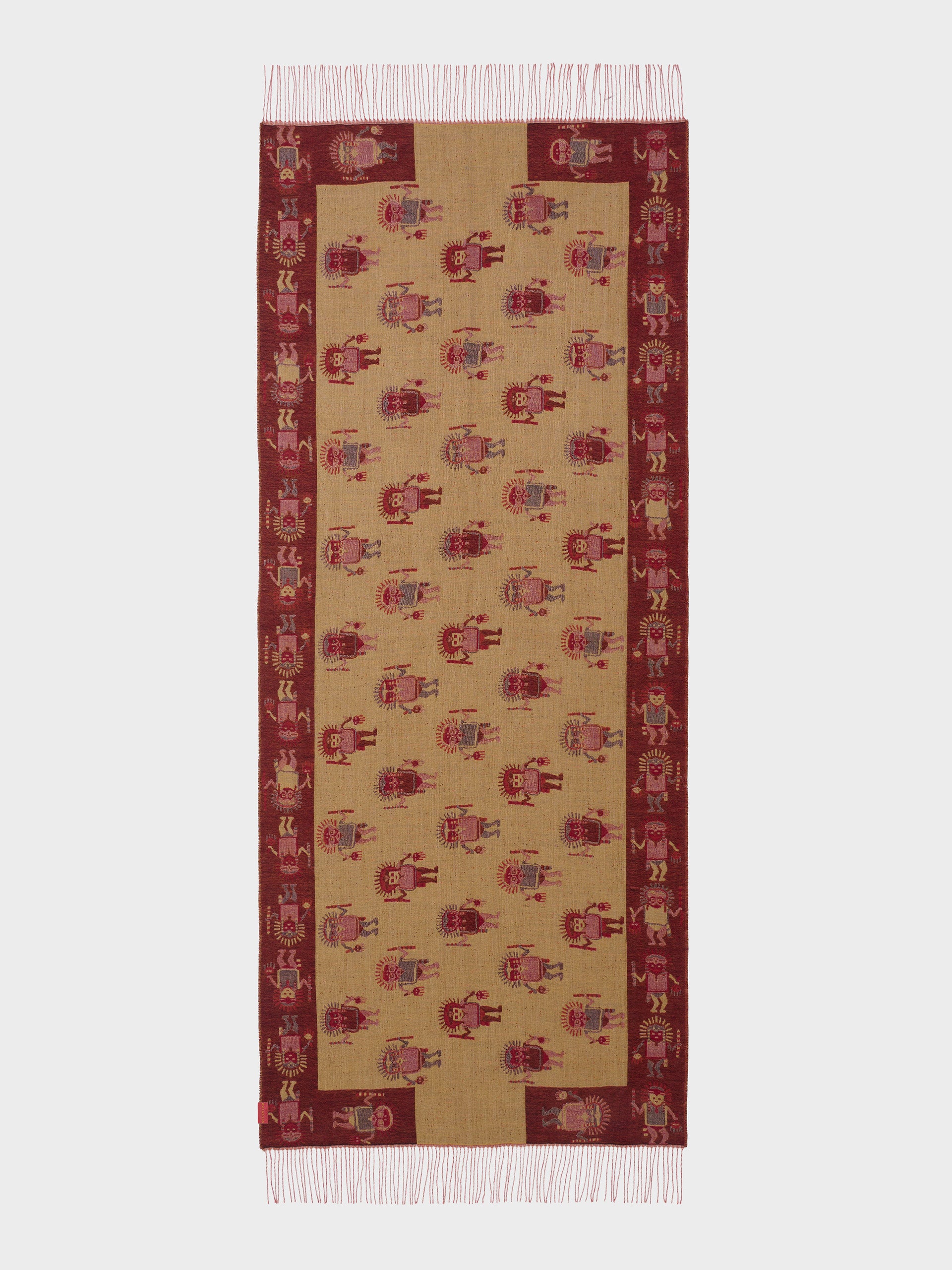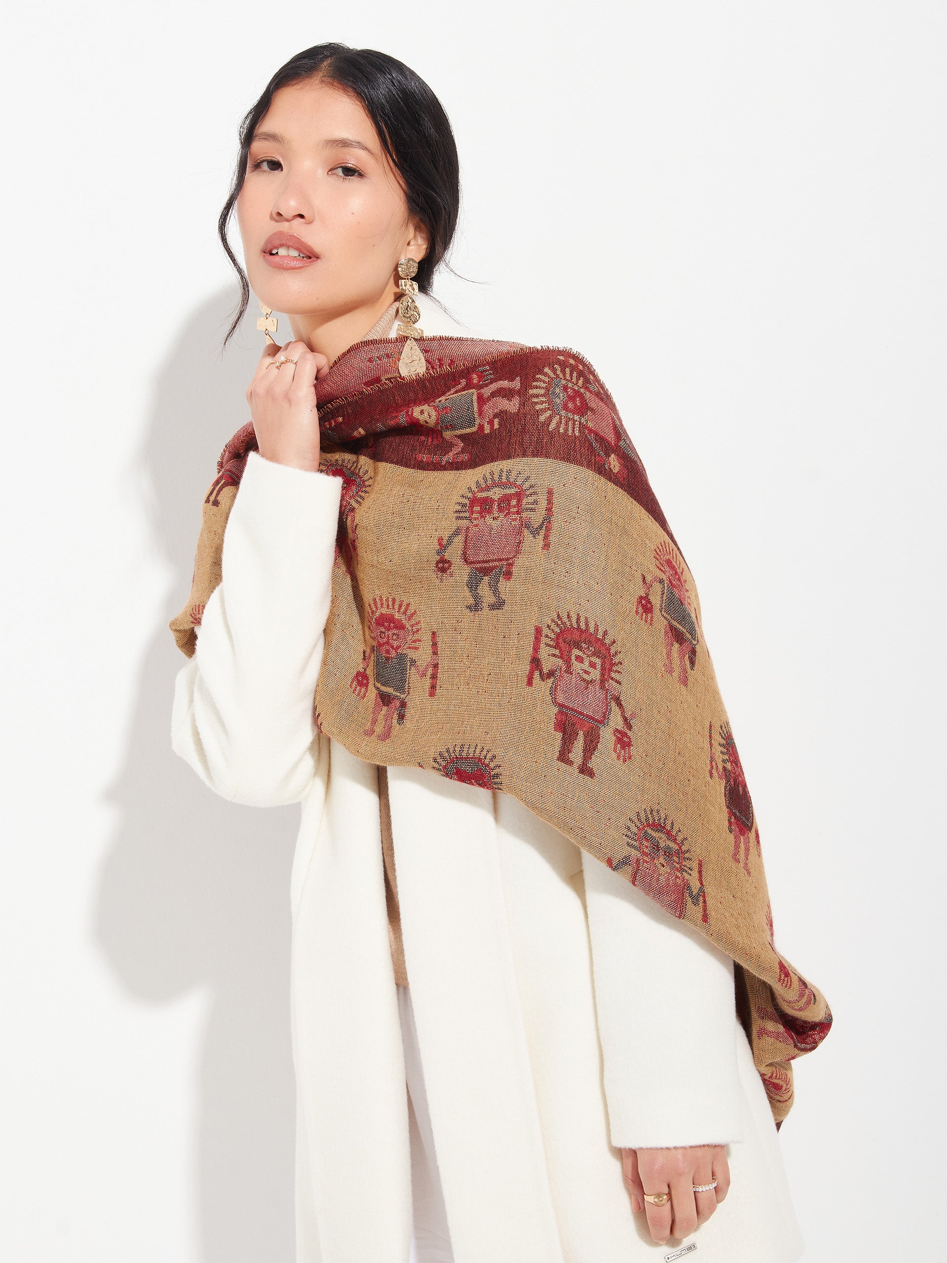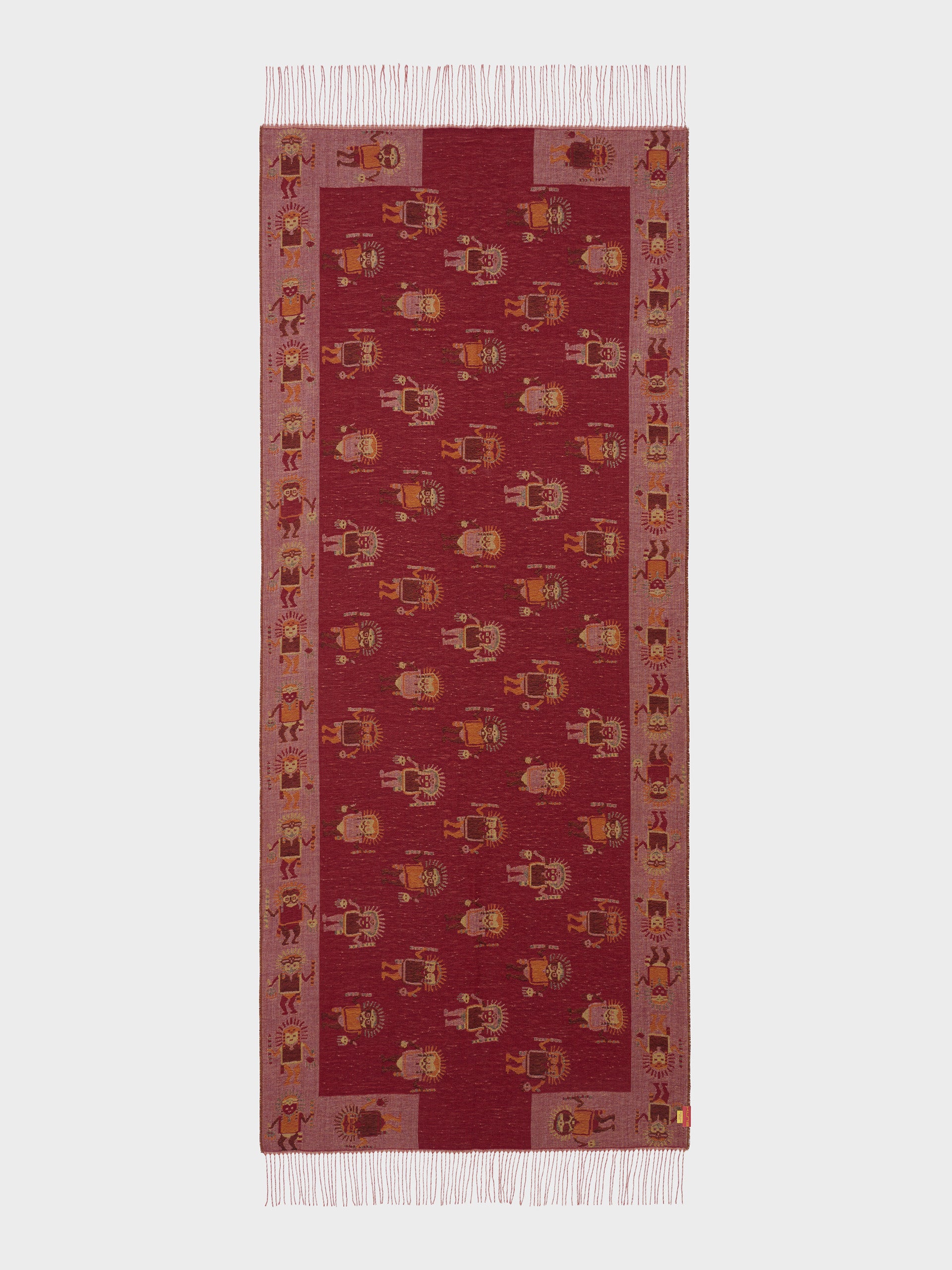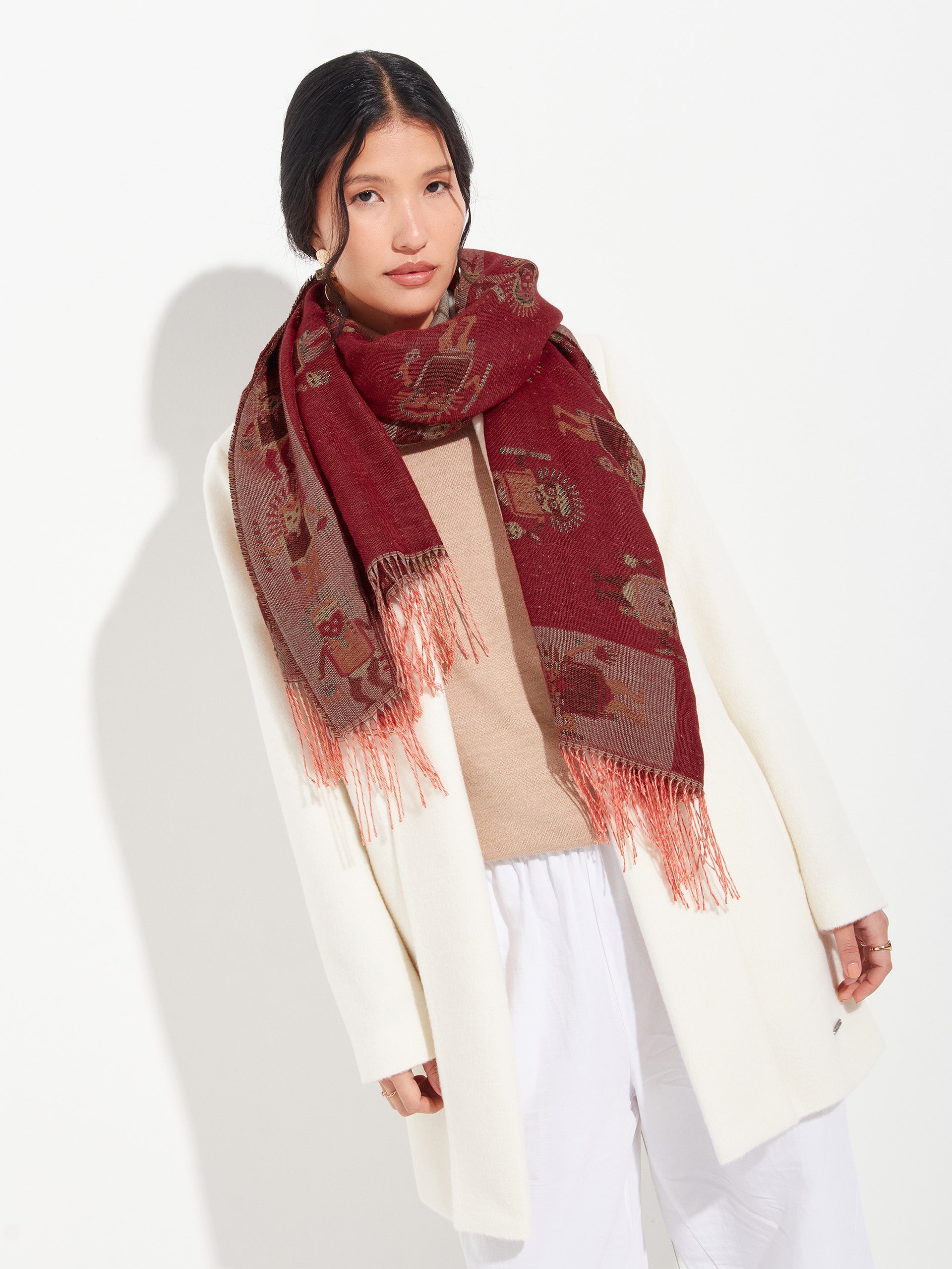 Estola Nazca 53 en tonalidad rojo, confeccionada en 70% baby alpaca y 30% seda, trabajada en Jacquard de doble tela con inserción de trama oculta. Sus dimensiones son 200/180 x 75 cm y se trata de una pieza reversible, inspirada en la Cultura Nazca, que revive el legado ancestral a través de un diseño basado en la cultura originaria. | Material predominante: Baby Alpaca