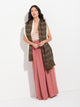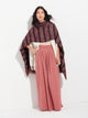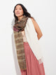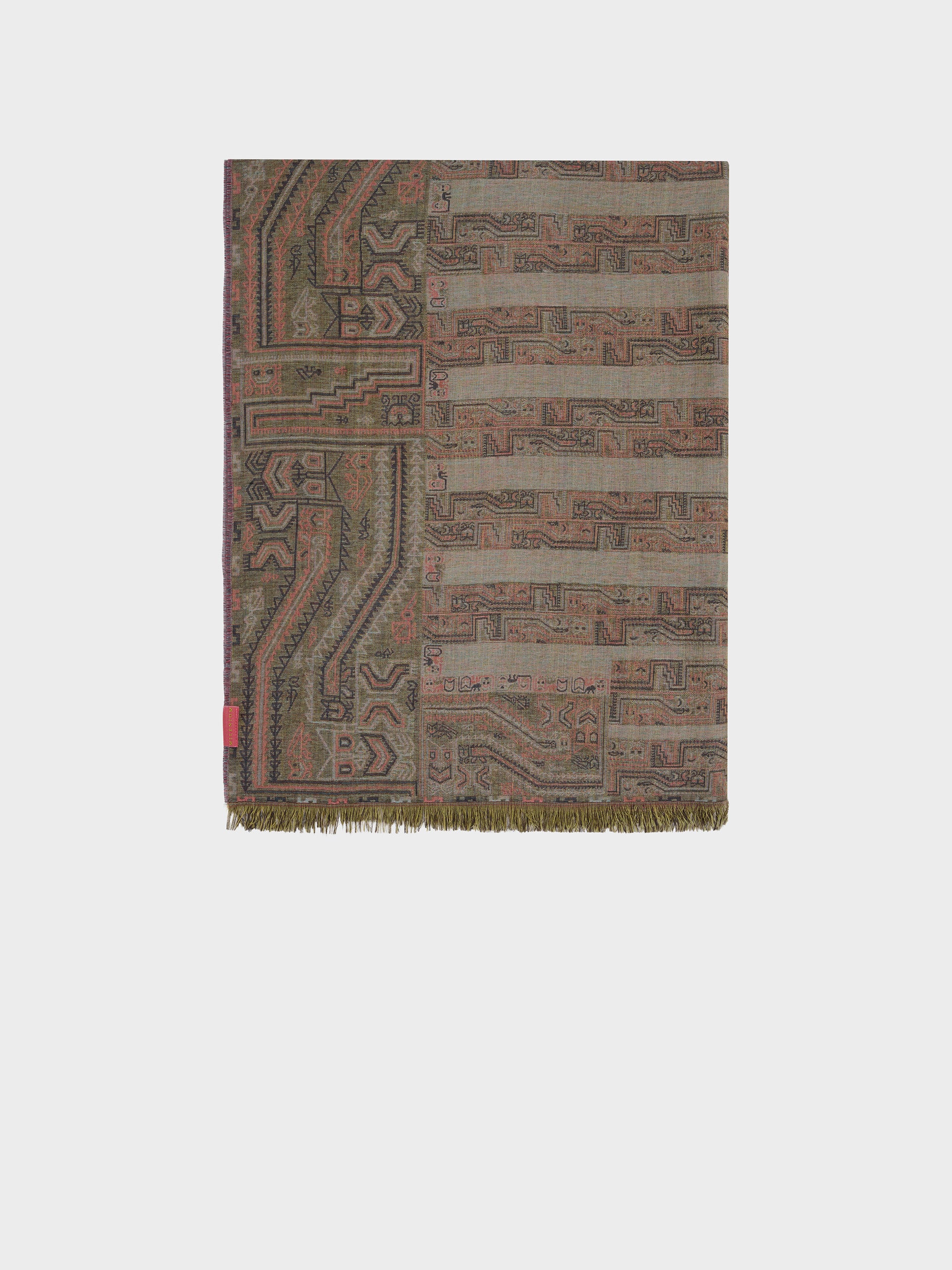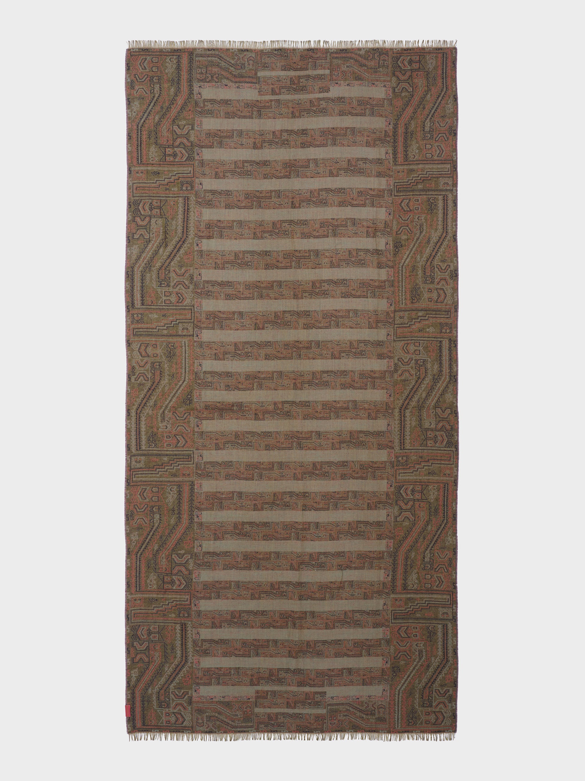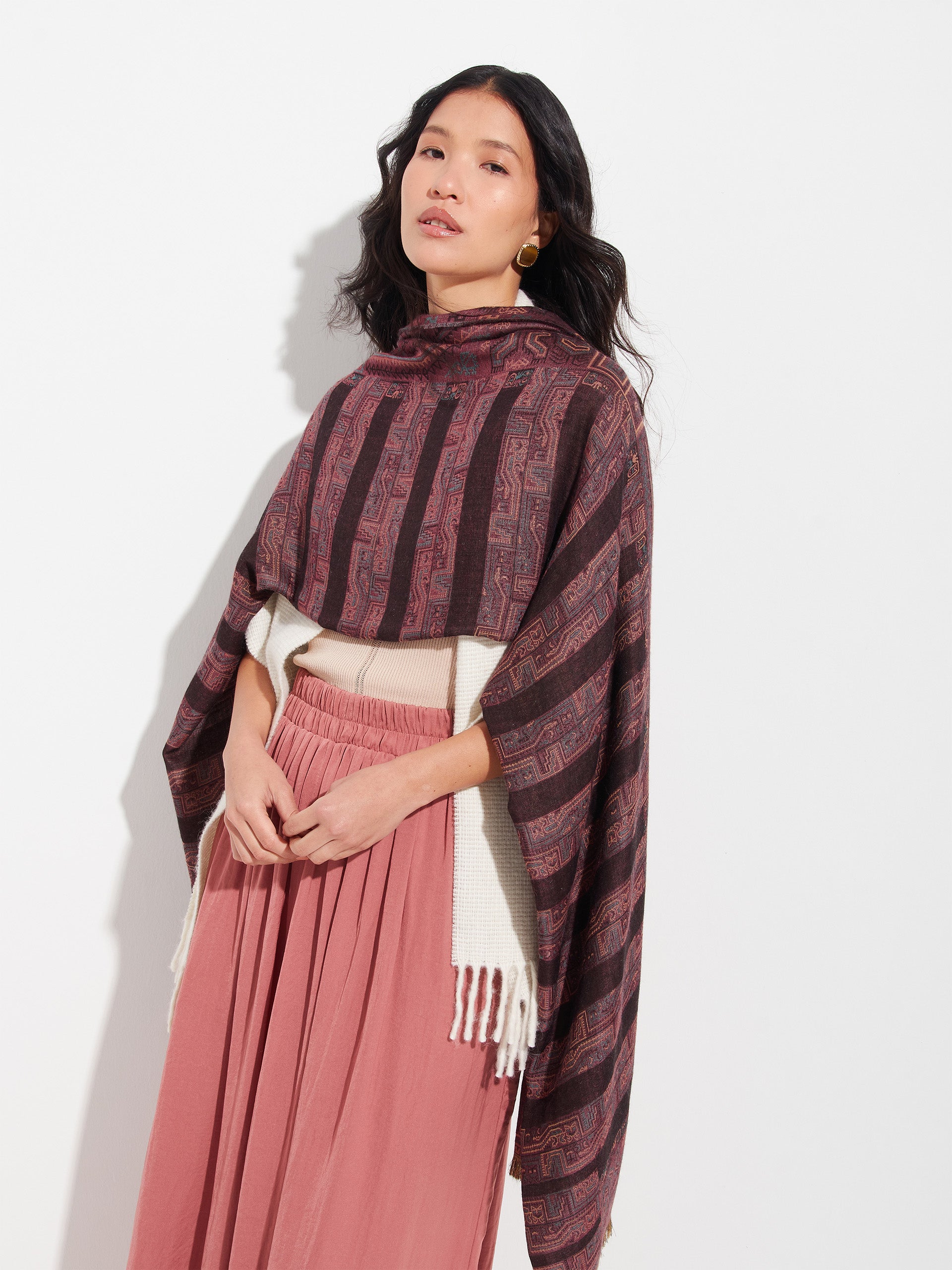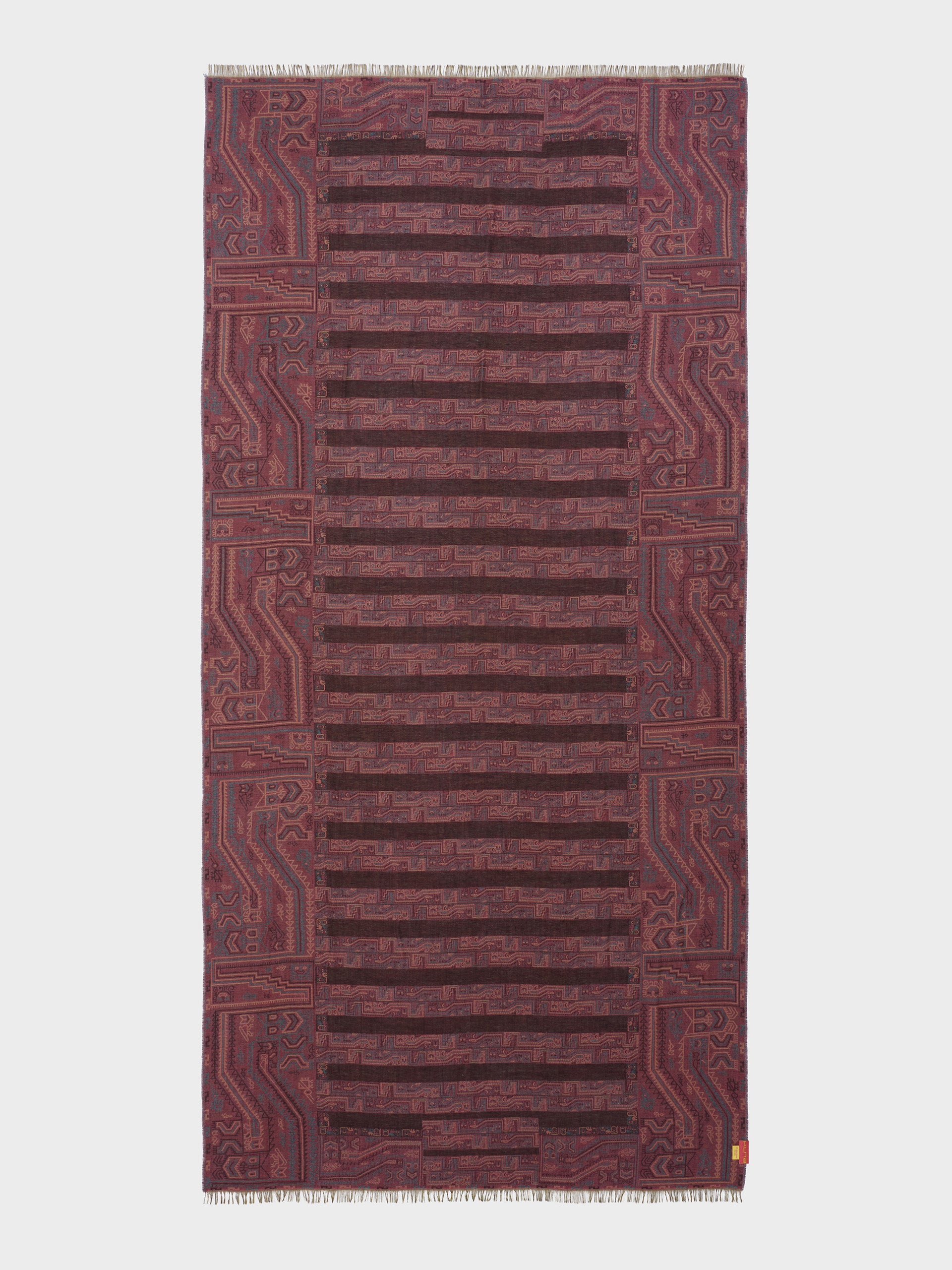 Estola Paracas 19 en tonalidad marrón, elaborada en 50% Royal alpaca y 50% seda, con técnica Jacquard en doble tela e inserción de trama oculta. Con una medida de 200/196 x 93 cm, es una prenda reversible, inspirada en la Cultura Paracas, que transmite la herencia ancestral mediante un diseño con profundo significado cultural. Colección en homenaje a los 100 años del Museo Larco. | Material predominante: Royal Alpaca y Seda