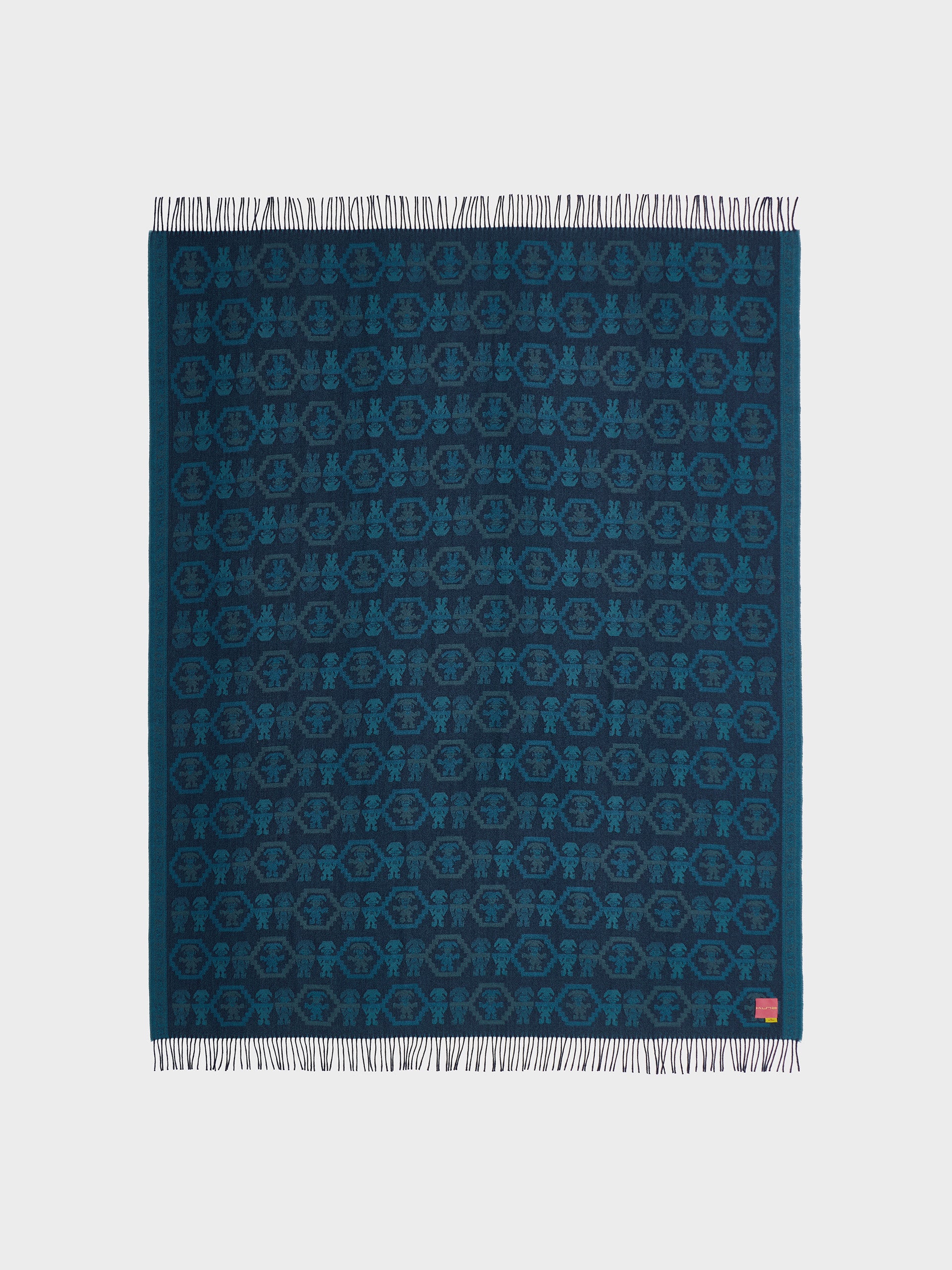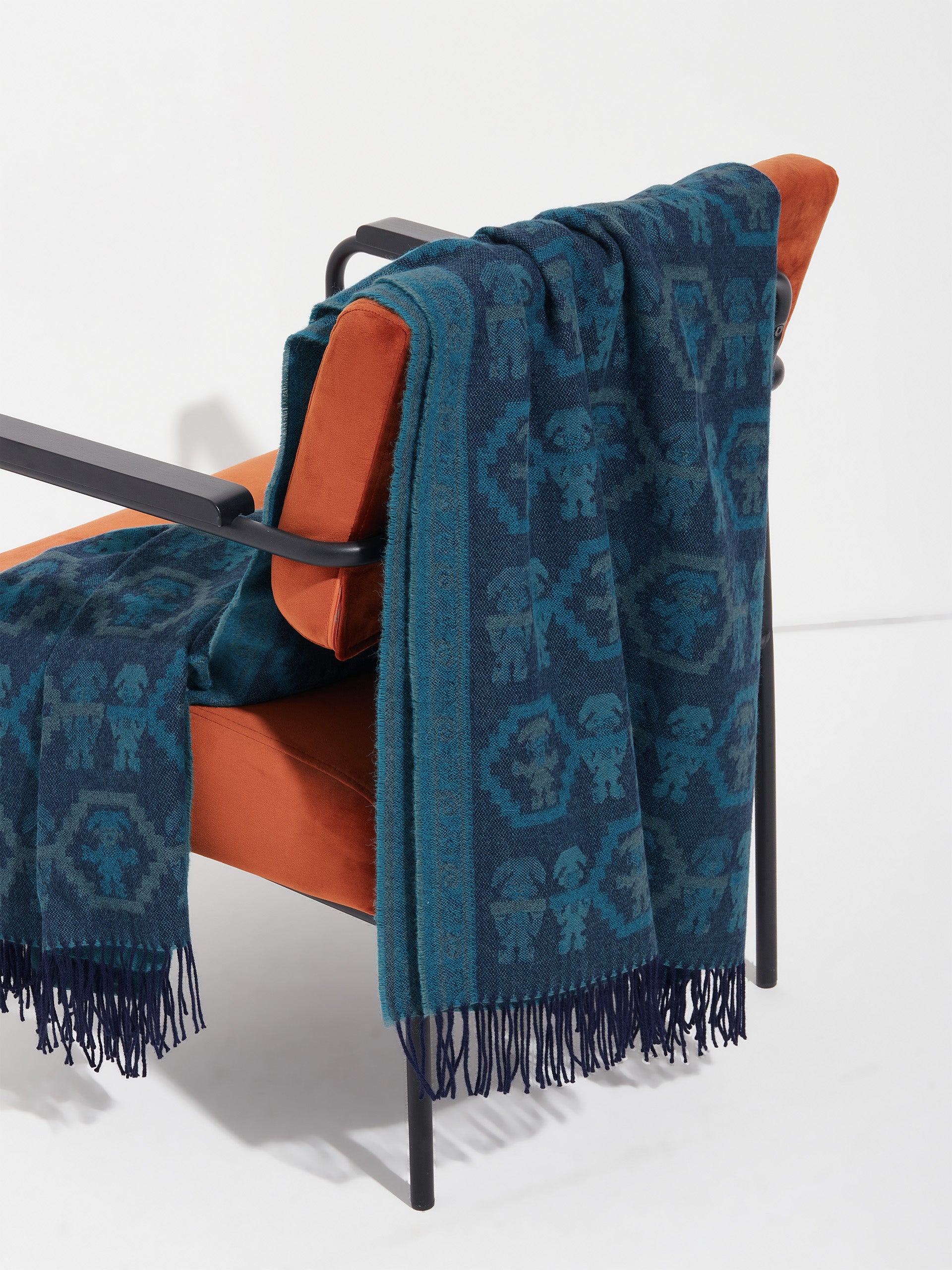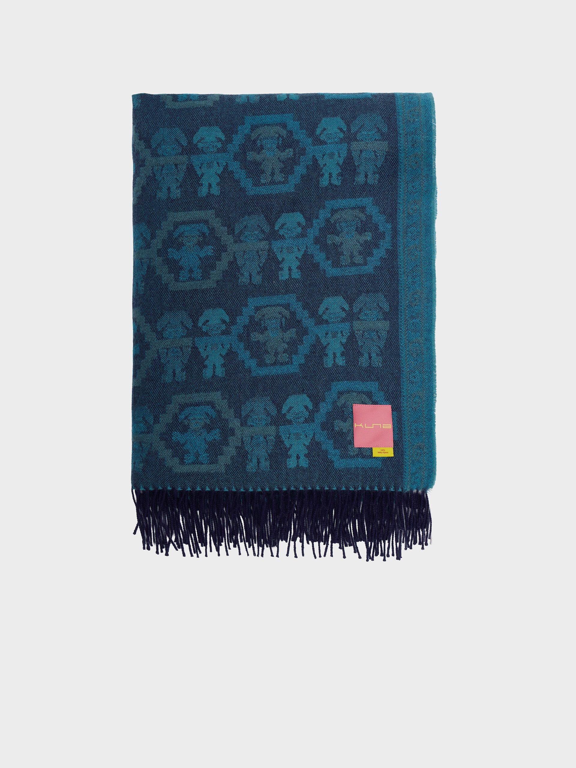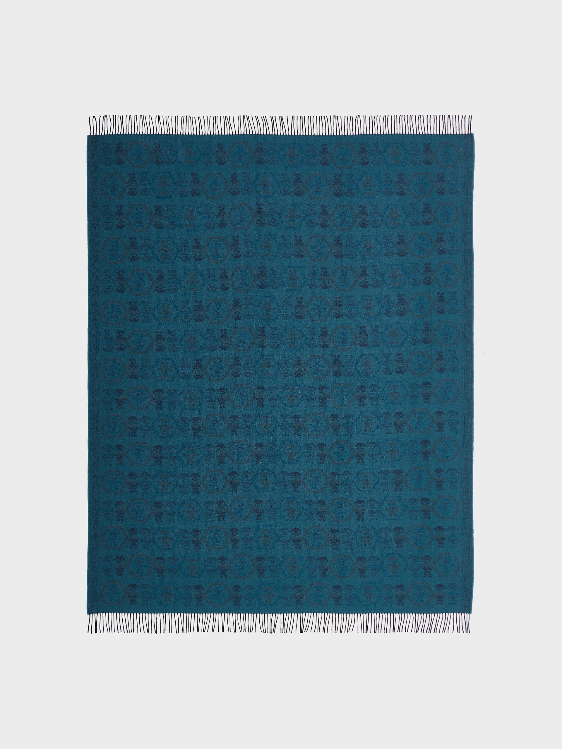 Manta Chimu 13 en tonalidad turqueza, elaborada en 100% baby alpaca con técnica Jacquard en doble cara. Con una medida de 200/184 x 145 cm, está inspirada en la Cultura Chimú, que transmite la herencia ancestral mediante un diseño con profundo significado cultural. | Material predominante: Baby Alpaca