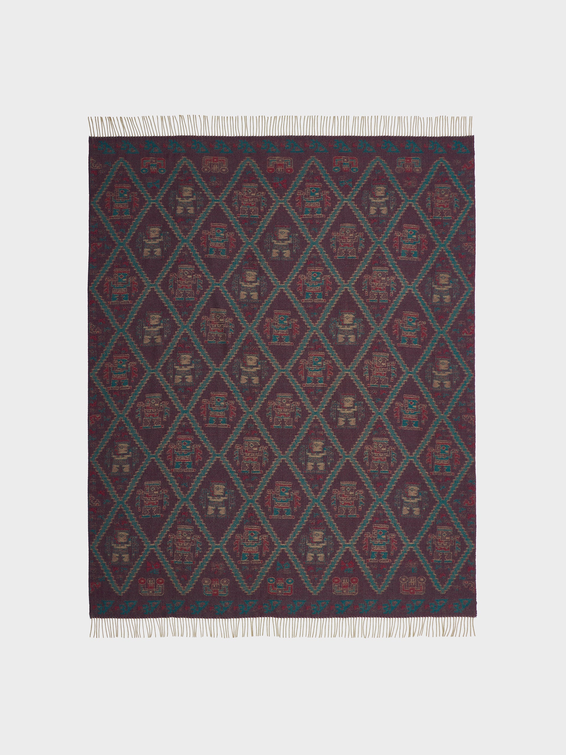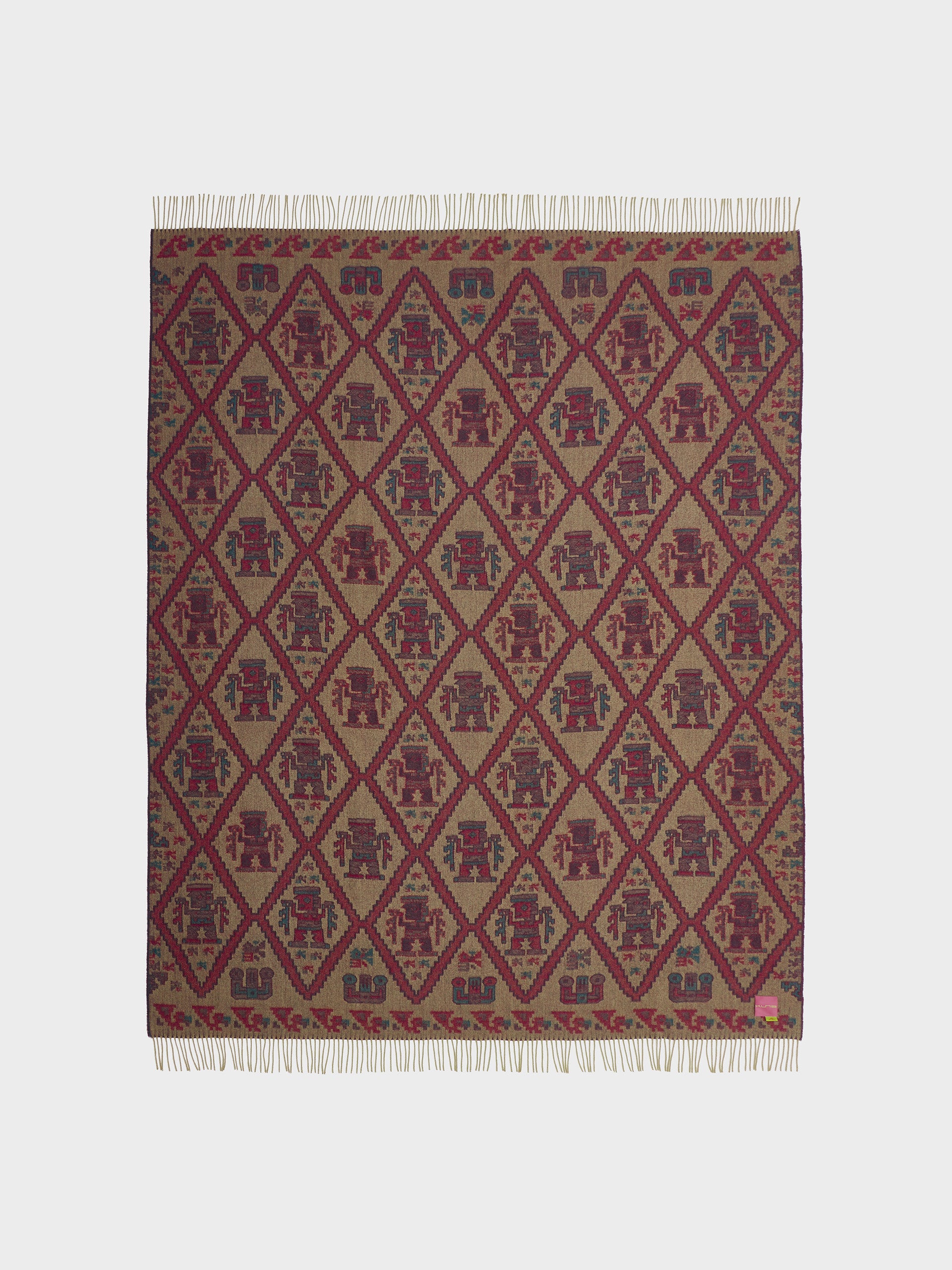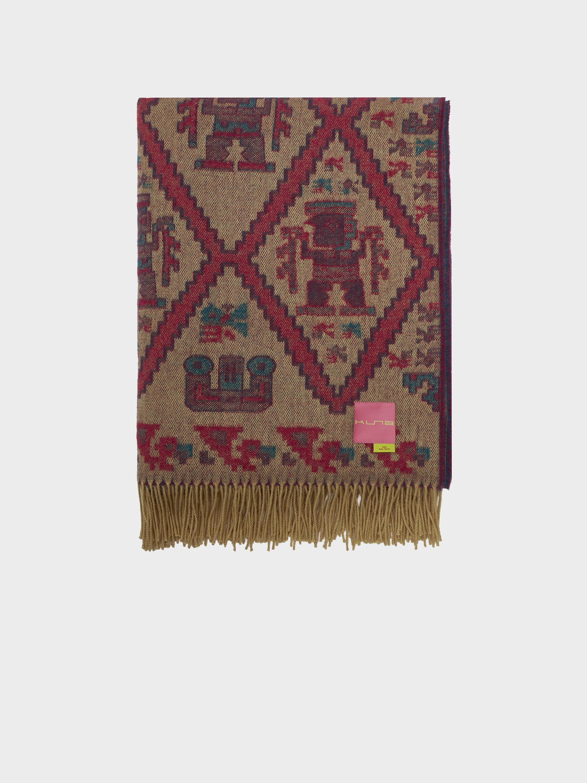Manta Mochica 2 en tonalidad amarillo, elaborada en 100% baby alpaca con técnica Jacquard en doble cara. Con una medida de 200/184 x 145 cm, está inspirada en la Cultura Mochica, que reinterpreta el legado ancestral en un diseño inspirado en la cultura originaria. | Material predominante: Baby Alpaca