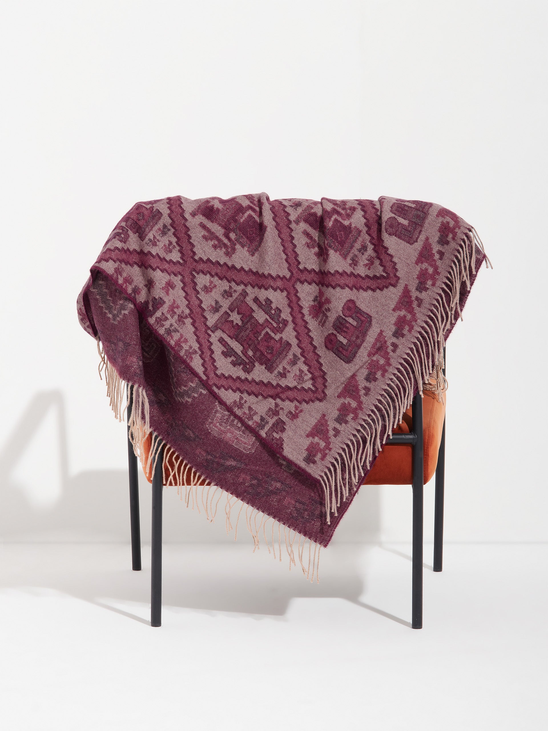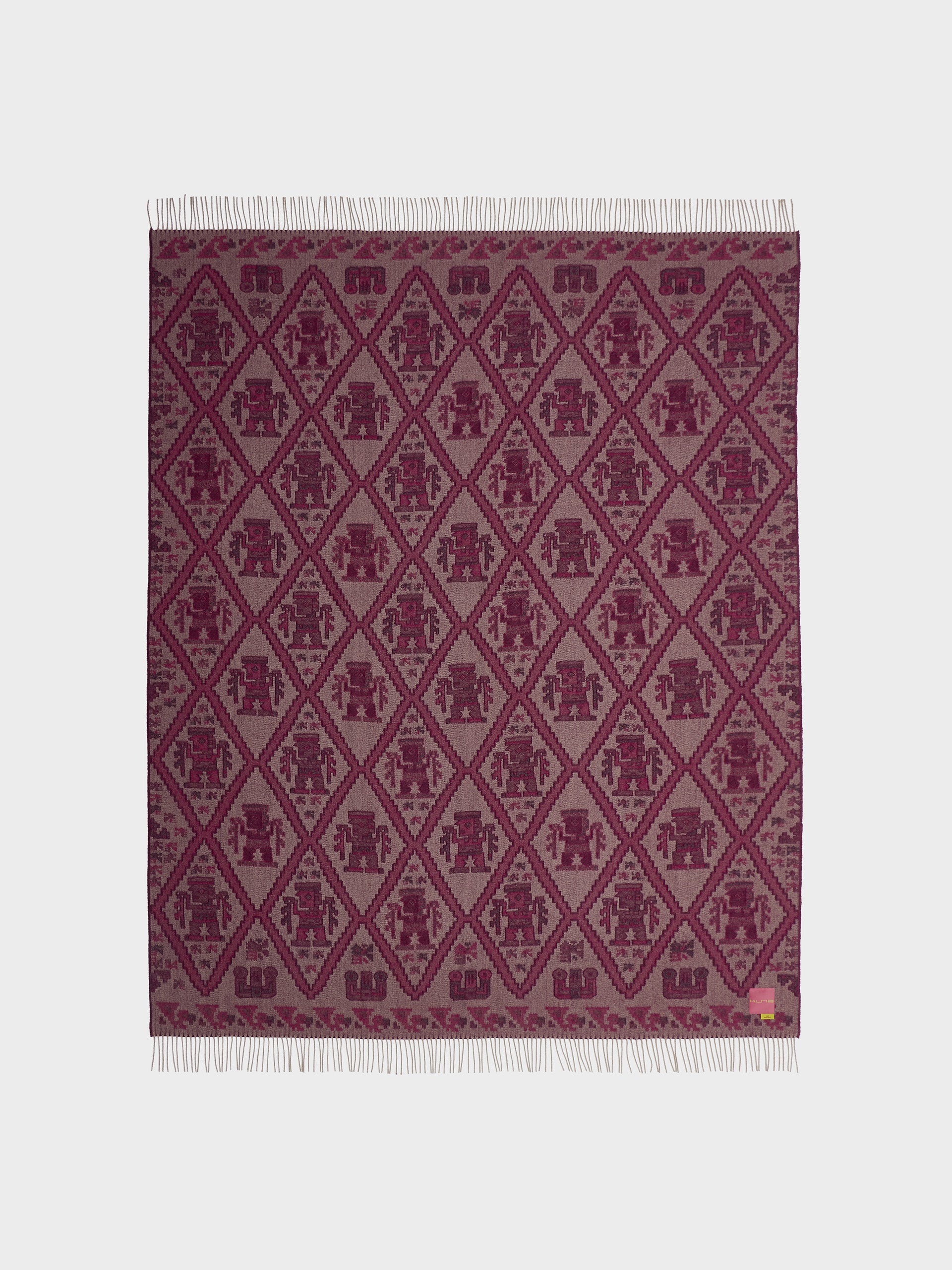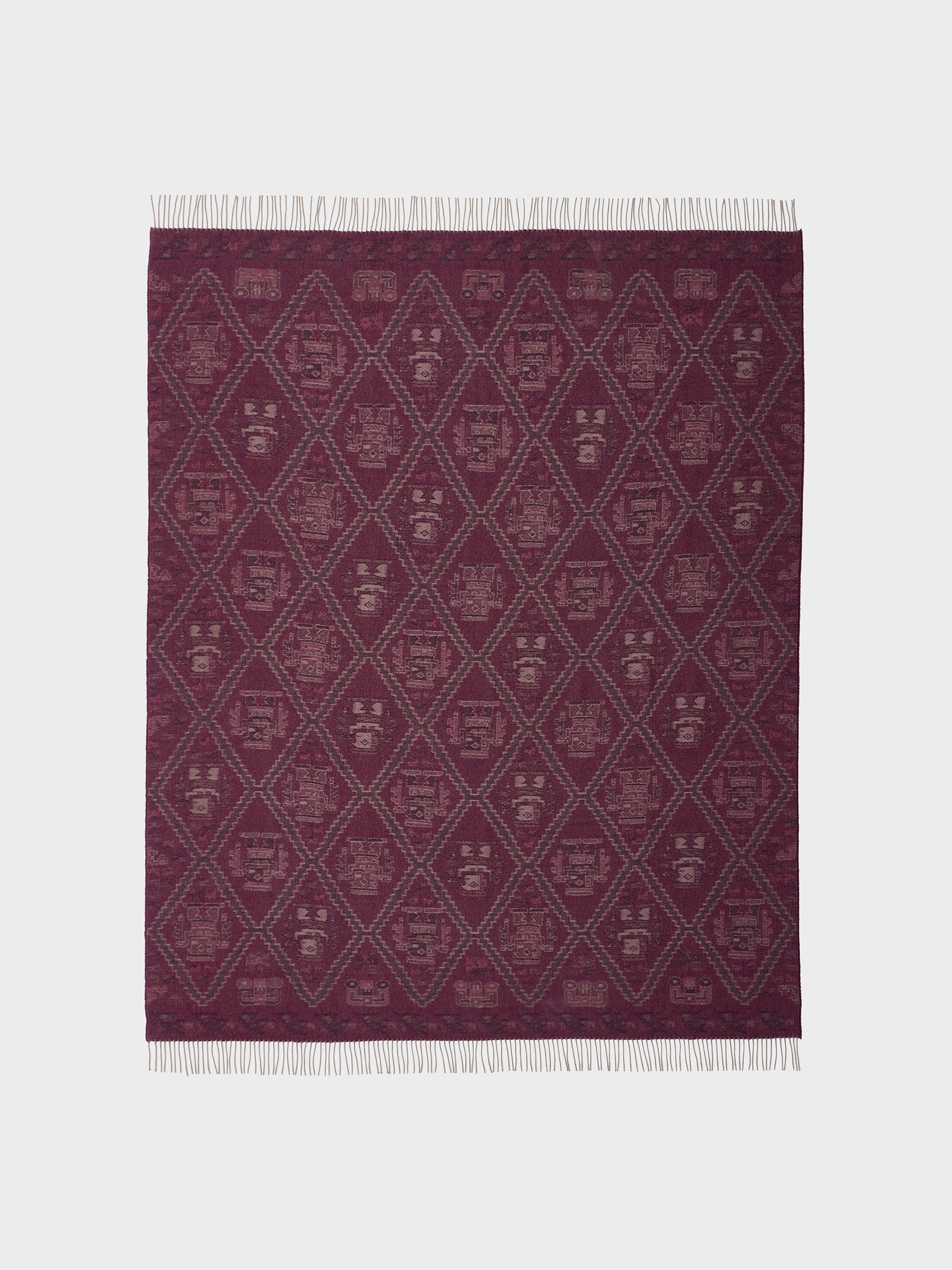 Manta Mochica 2 en tonalidad guinda, elaborada en 100% baby alpaca con técnica Jacquard en doble cara. Con una medida de 200/184 x 145 cm, está inspirada en la Cultura Mochica, que reinterpreta el legado ancestral en un diseño inspirado en la cultura originaria. Colección en homenaje a los 100 años del Museo Larco. | Material predominante: Baby Alpaca