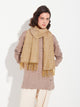 Estola Zabila en tonalidad amarillo, elaborada en baby alpaca, seda y lino. Presenta líneas horizontales en panamá sobre fondo tafetán y acabado desflecado. Su textura ligera y su diseño rayado aportan un toque de distinción. | Material predominante: Lino