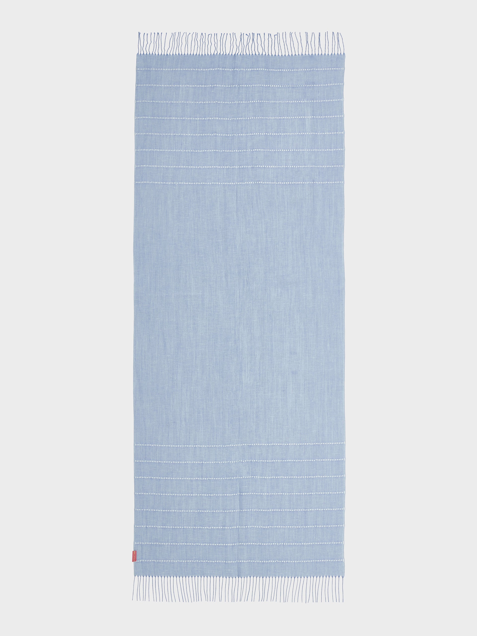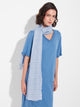 Estola Zabila en tonalidad celeste, elaborada en baby alpaca, seda y lino. Presenta líneas horizontales en panamá sobre fondo tafetán y acabado desflecado. Su textura ligera y su diseño rayado aportan un toque de distinción. | Material predominante: Lino