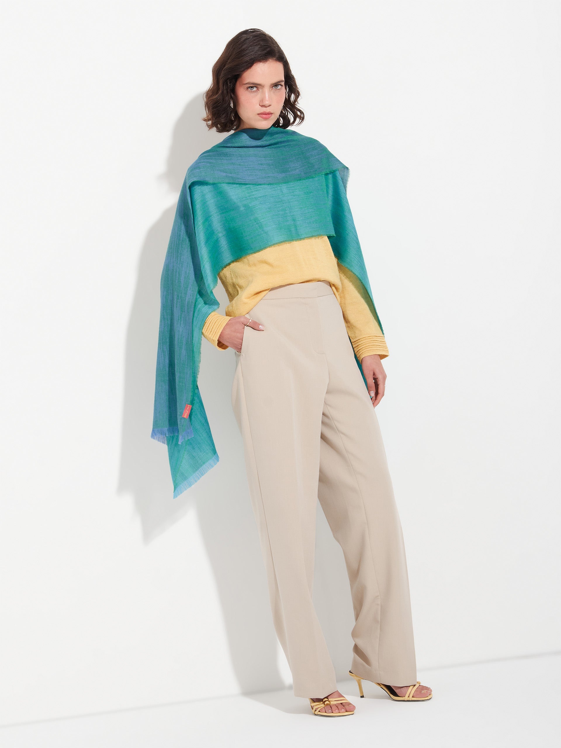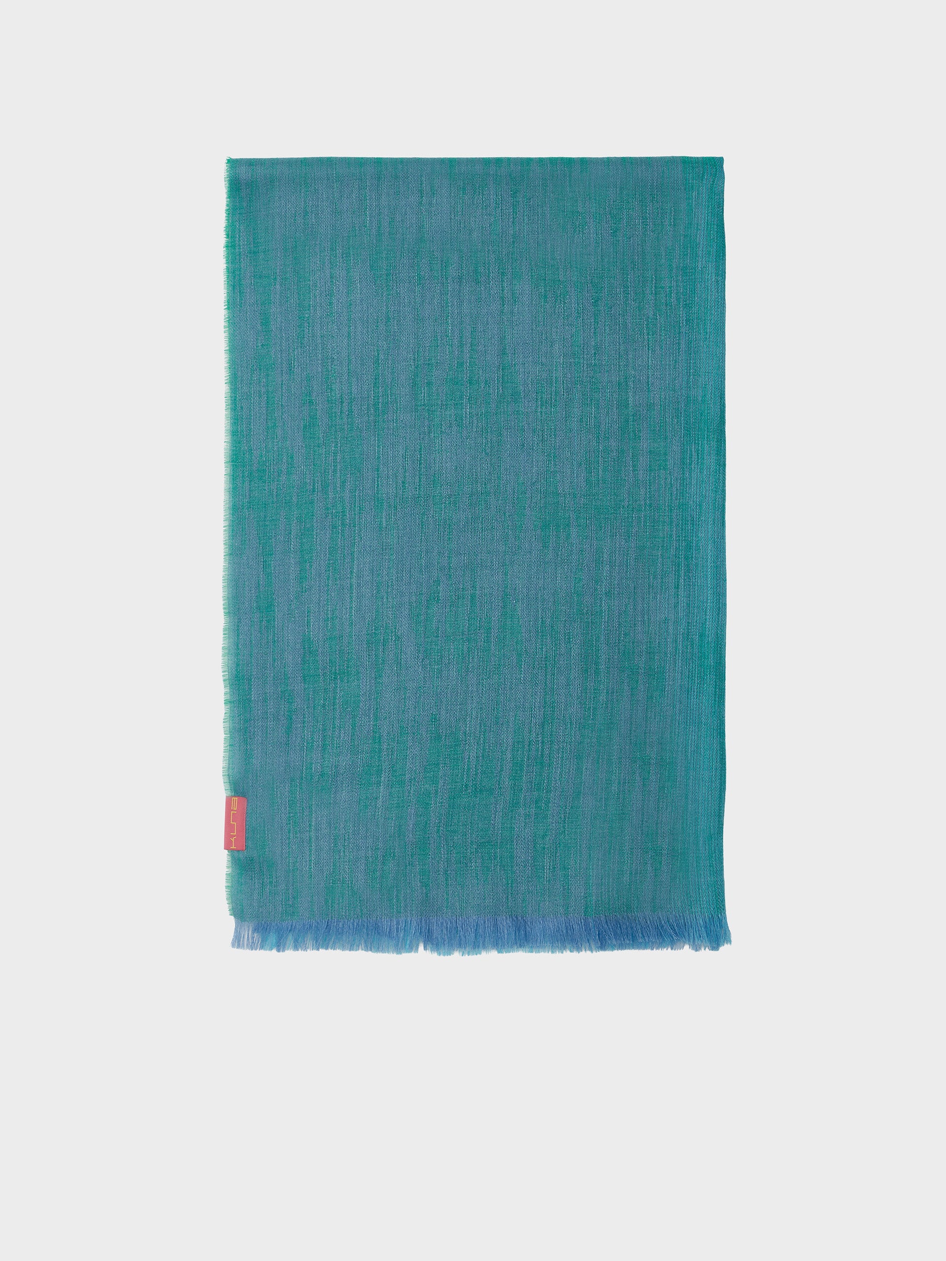 Estola Zankov en tonalidad verde, confeccionada en baby alpaca y seda. Presenta un diseño jaspeado desflecado en tejido satín jacquard, que aporta textura y movimiento. Ideal para complementar con elegancia cualquier atuendo. | Material predominante: Baby Alpaca