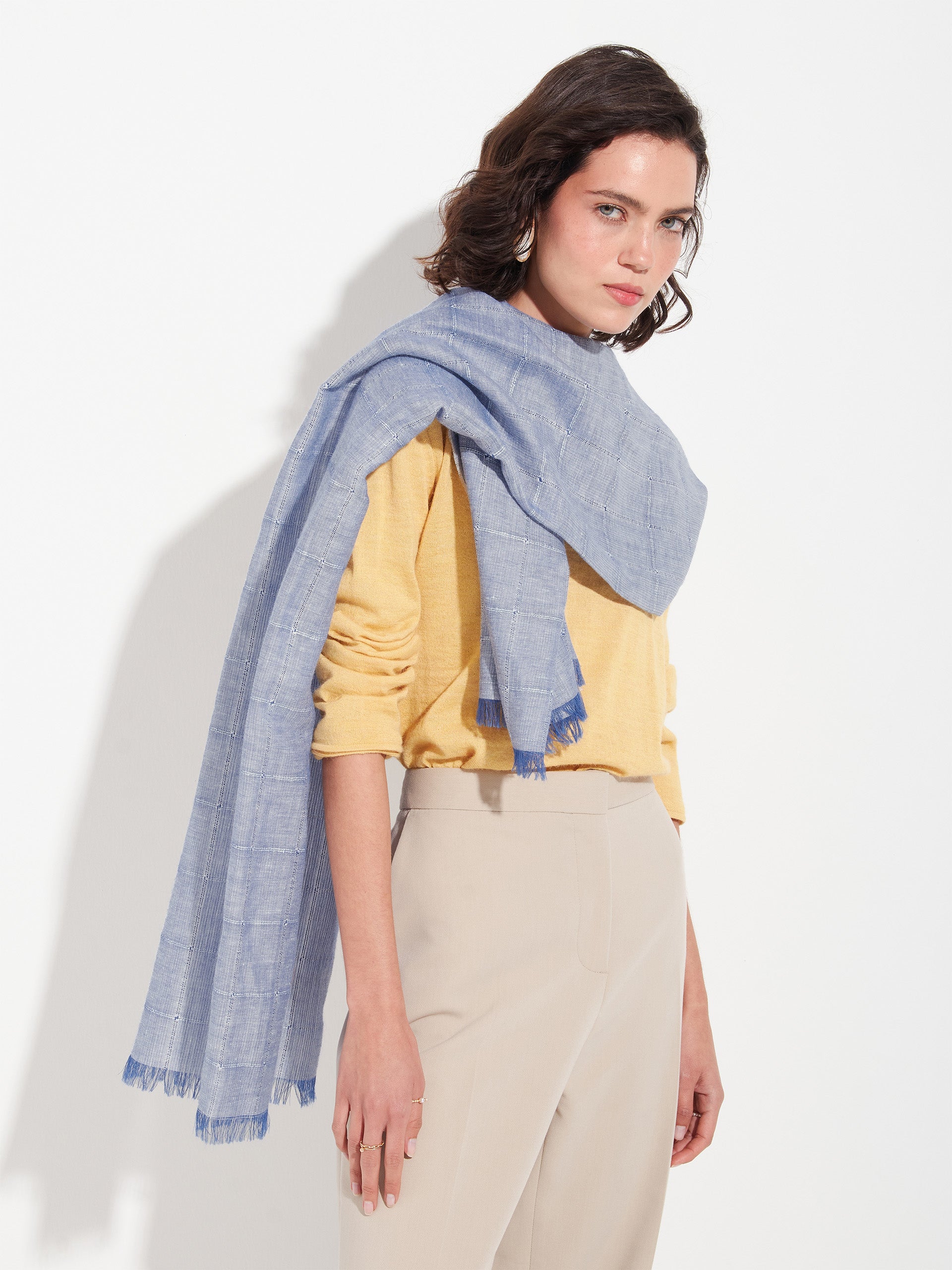 Estola Zoda en tonalidad azul, elaborada en una mezcla de baby alpaca, seda y lino. Presenta un diseño a cuadros en panamá y tafetán con acabado desflecado, que combina ligereza, frescura y estilo artesanal. | Material predominante: Baby Alpaca