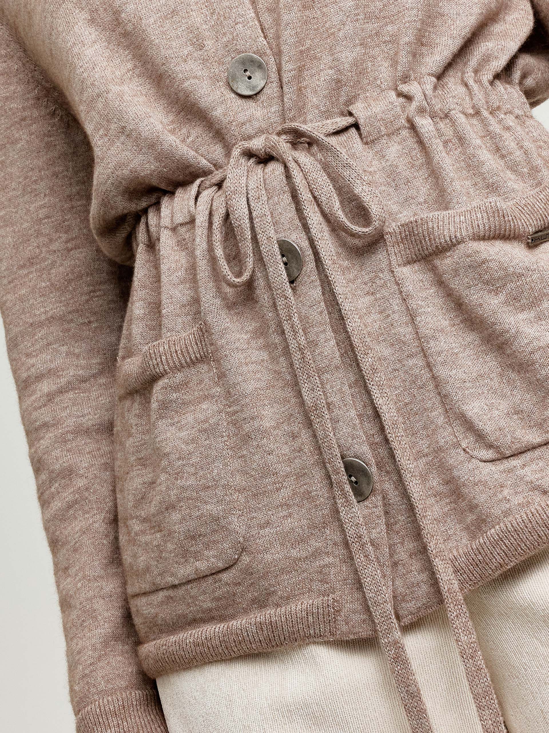 Beautiful cardigan made with organic cotton and baby alpaca. The Wallis cardigan is a minimalist garment with a shirt-style collar, a jersey gathered detail at the waist, providing a unique drape with a romantic style. A classic garment in two characteristic colors of the collection. | Predominant material: Cotton & Baby Alpaca
