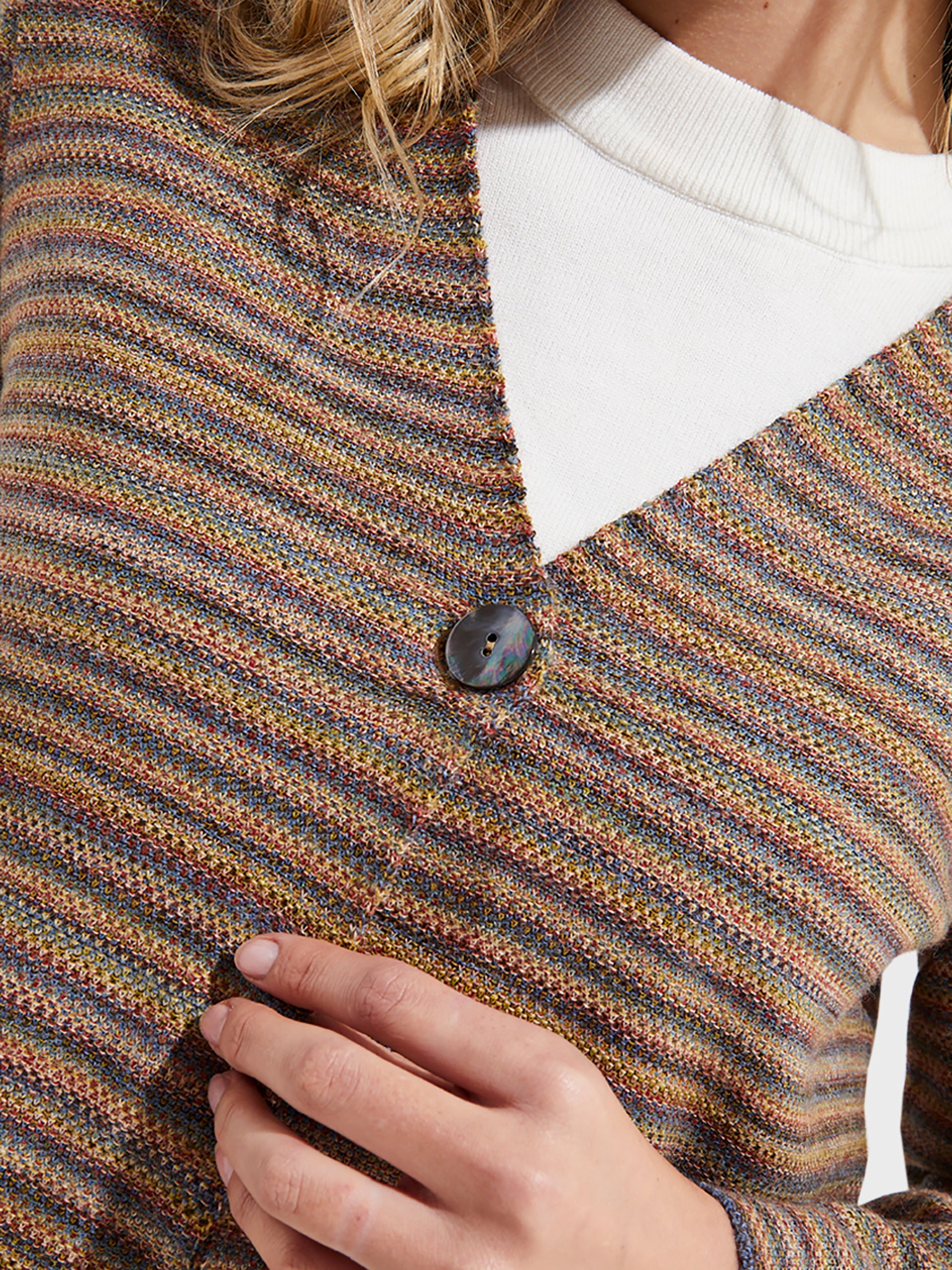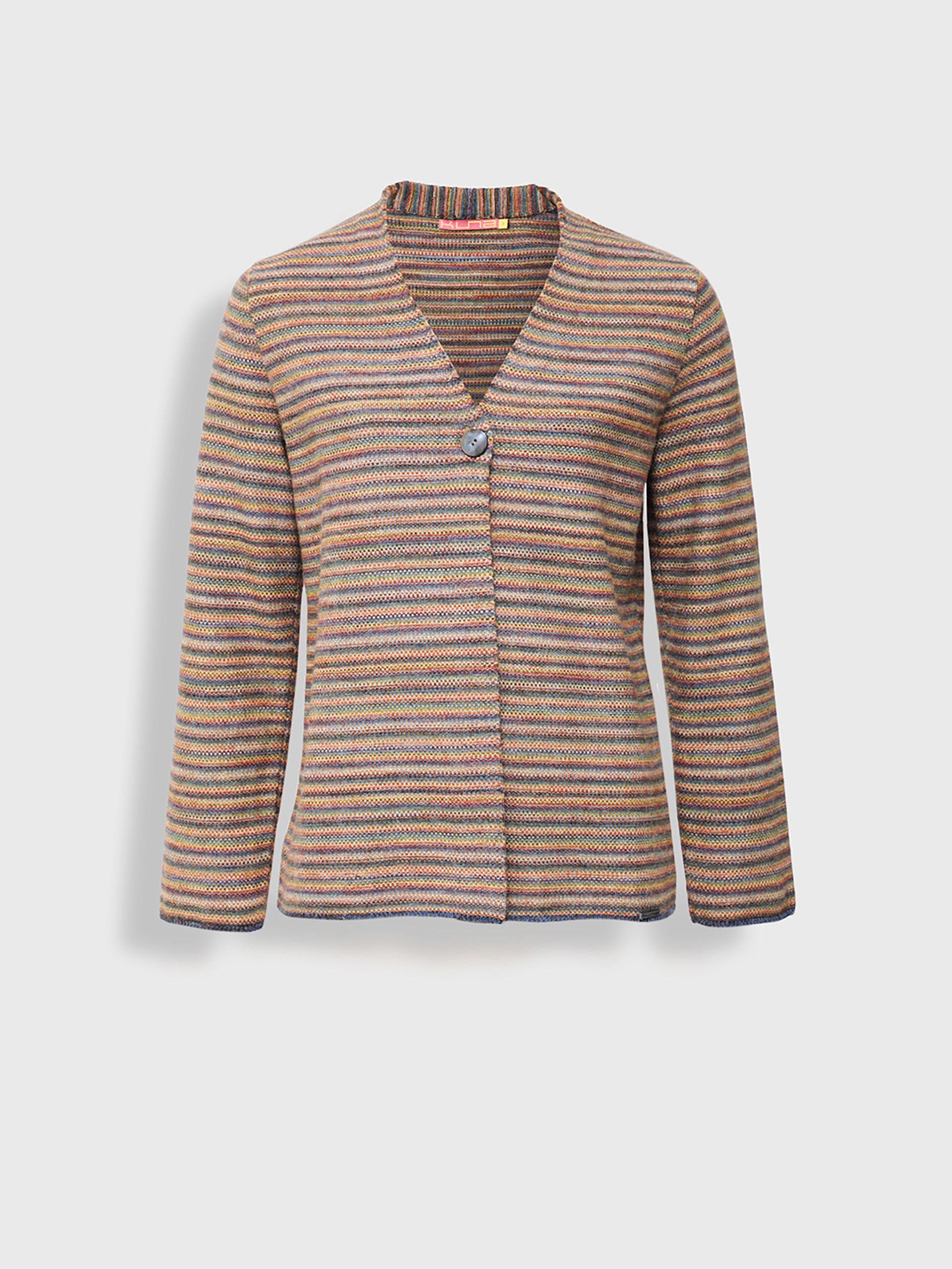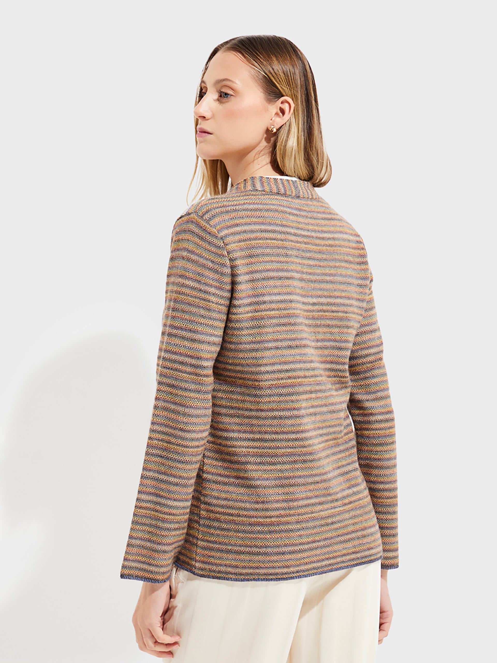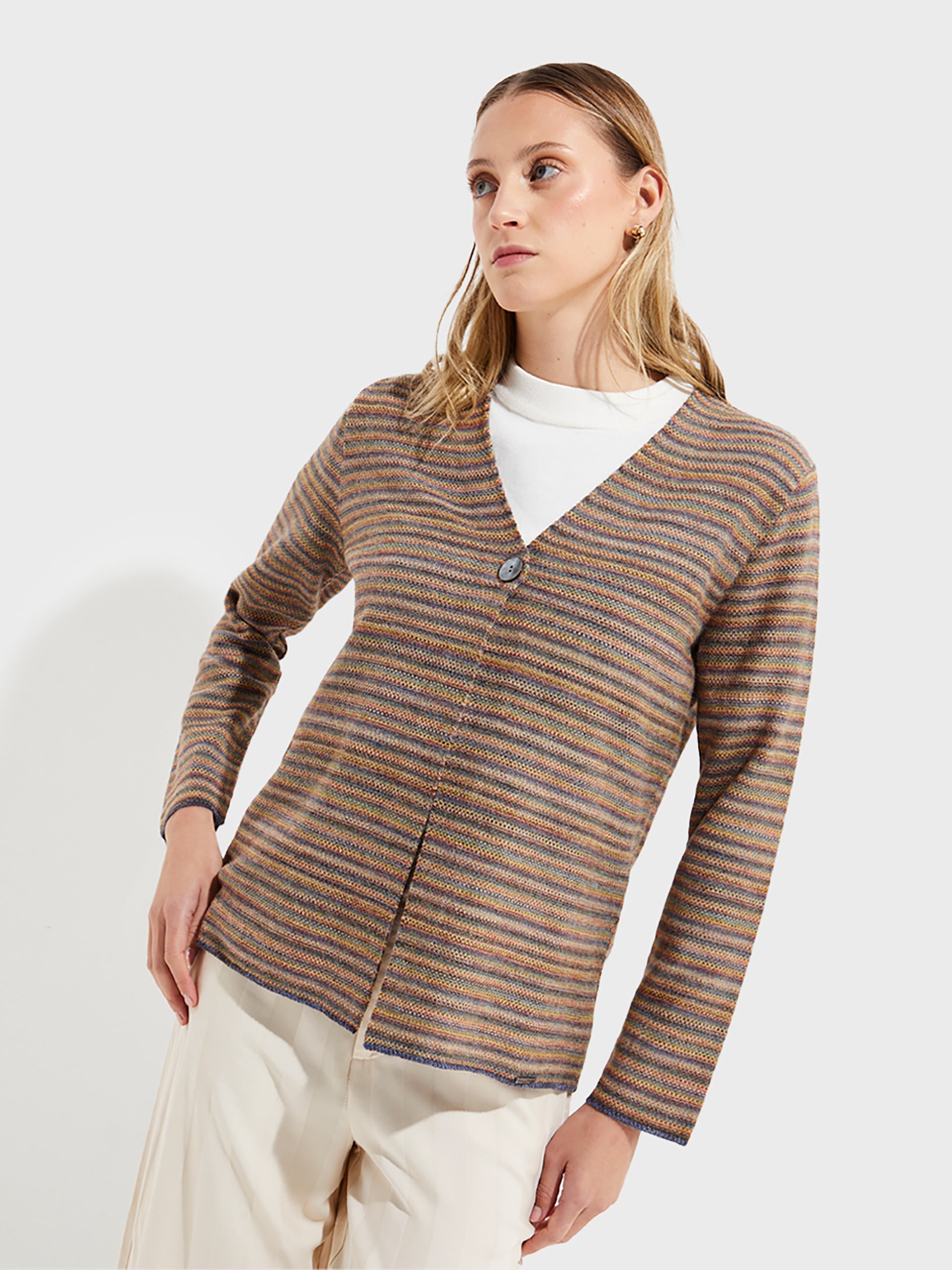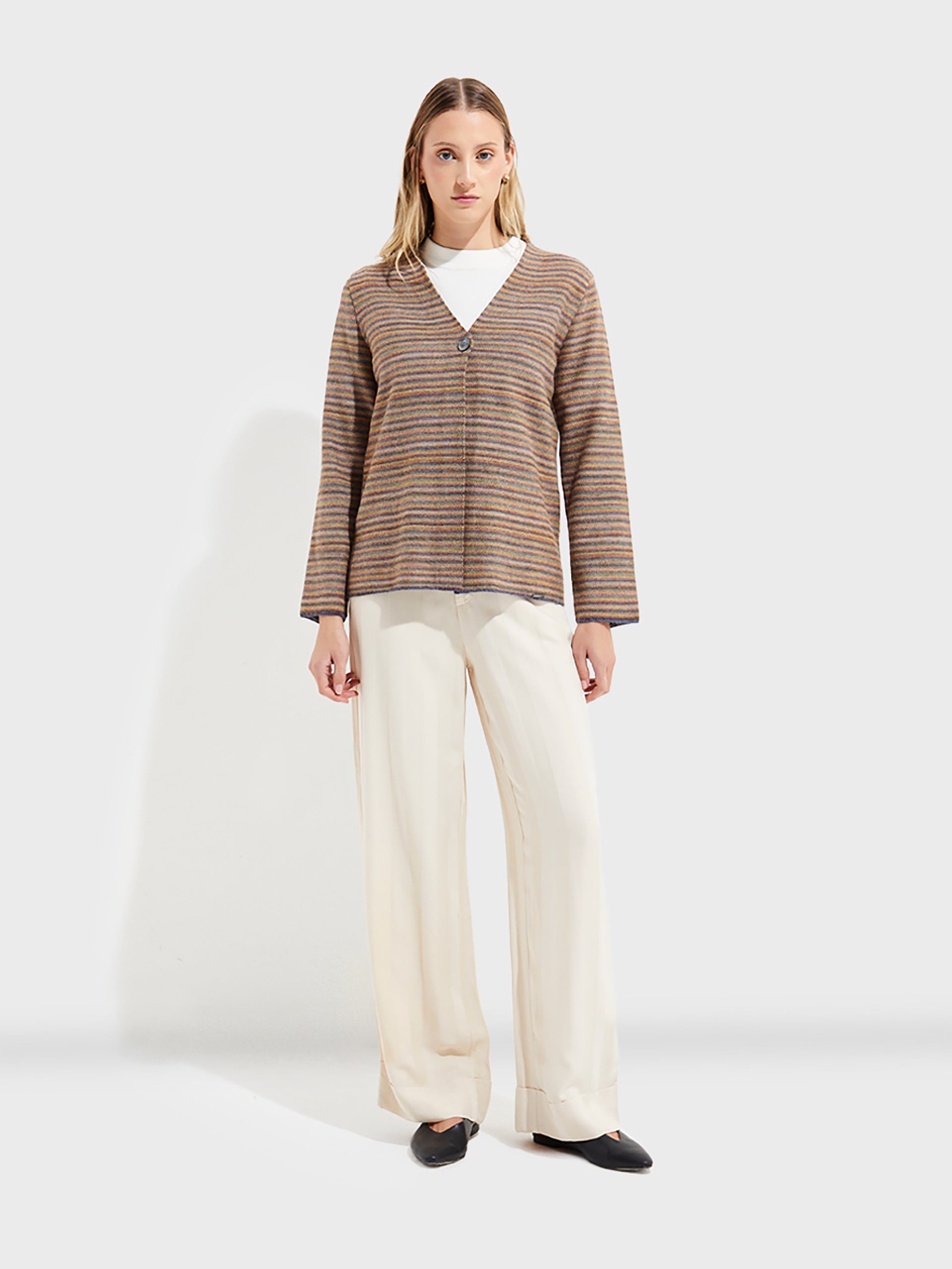 Nuestro cardigan Yudith de diseño a rayas es una pieza que no puede faltar en tu guardarropa este invierno. Puedes combinarlo fácilmente de acuerdo a la ocasión. Encuentra este diseño único en dos hermosas tonalidades. Elaborado en su totalidad de fina fibra de baby alpaca. | Material predominante: Baby Alpaca