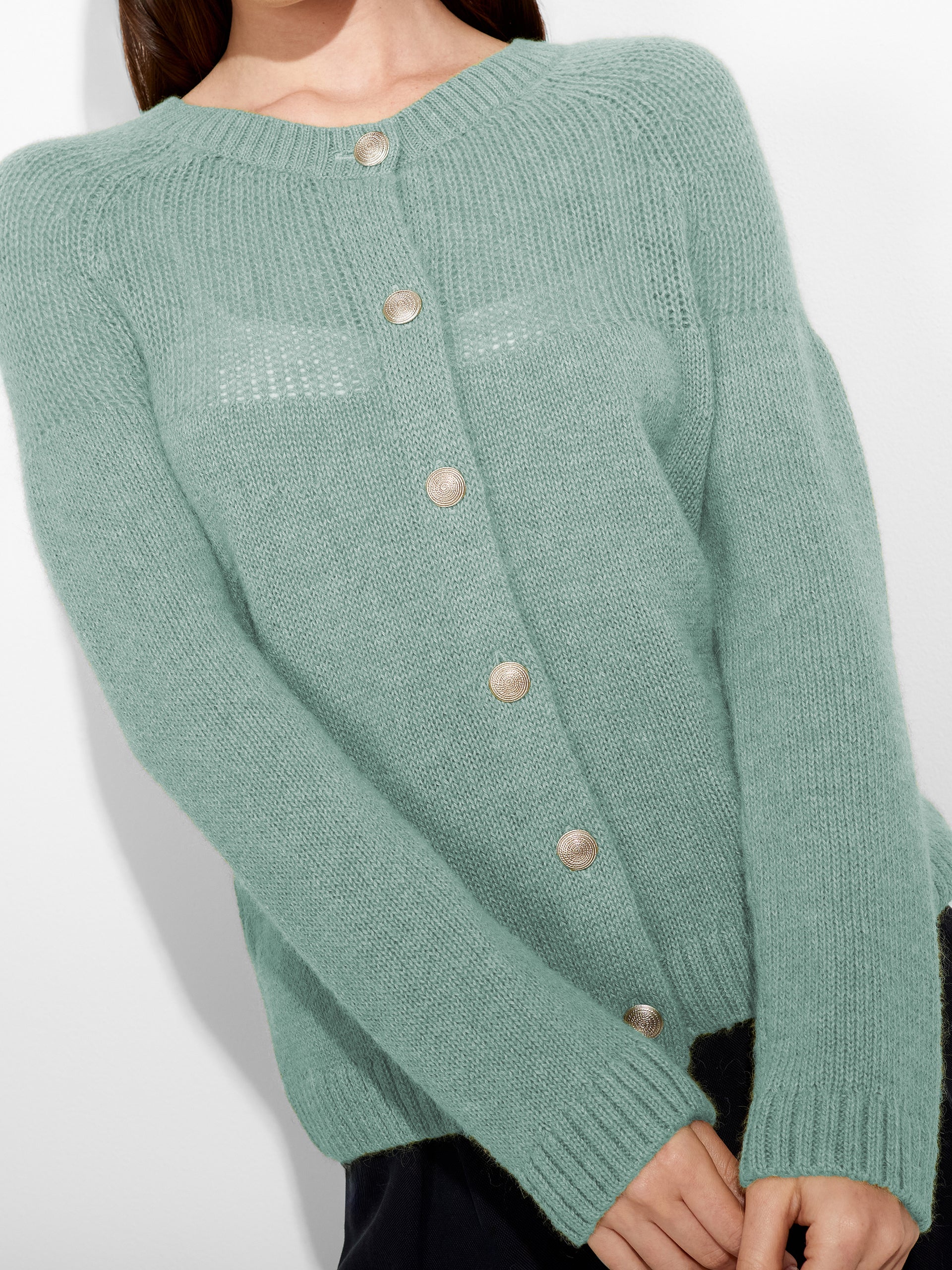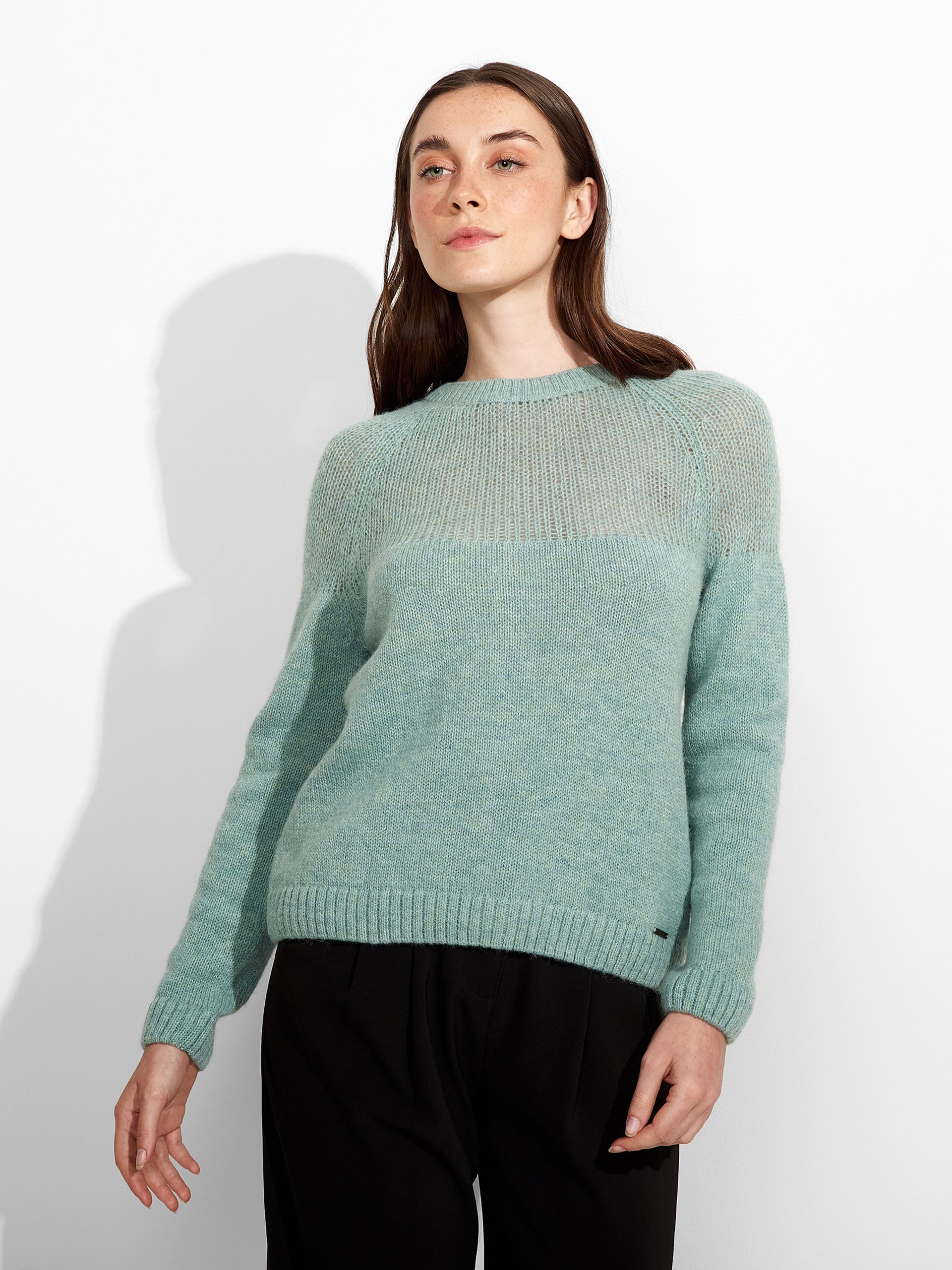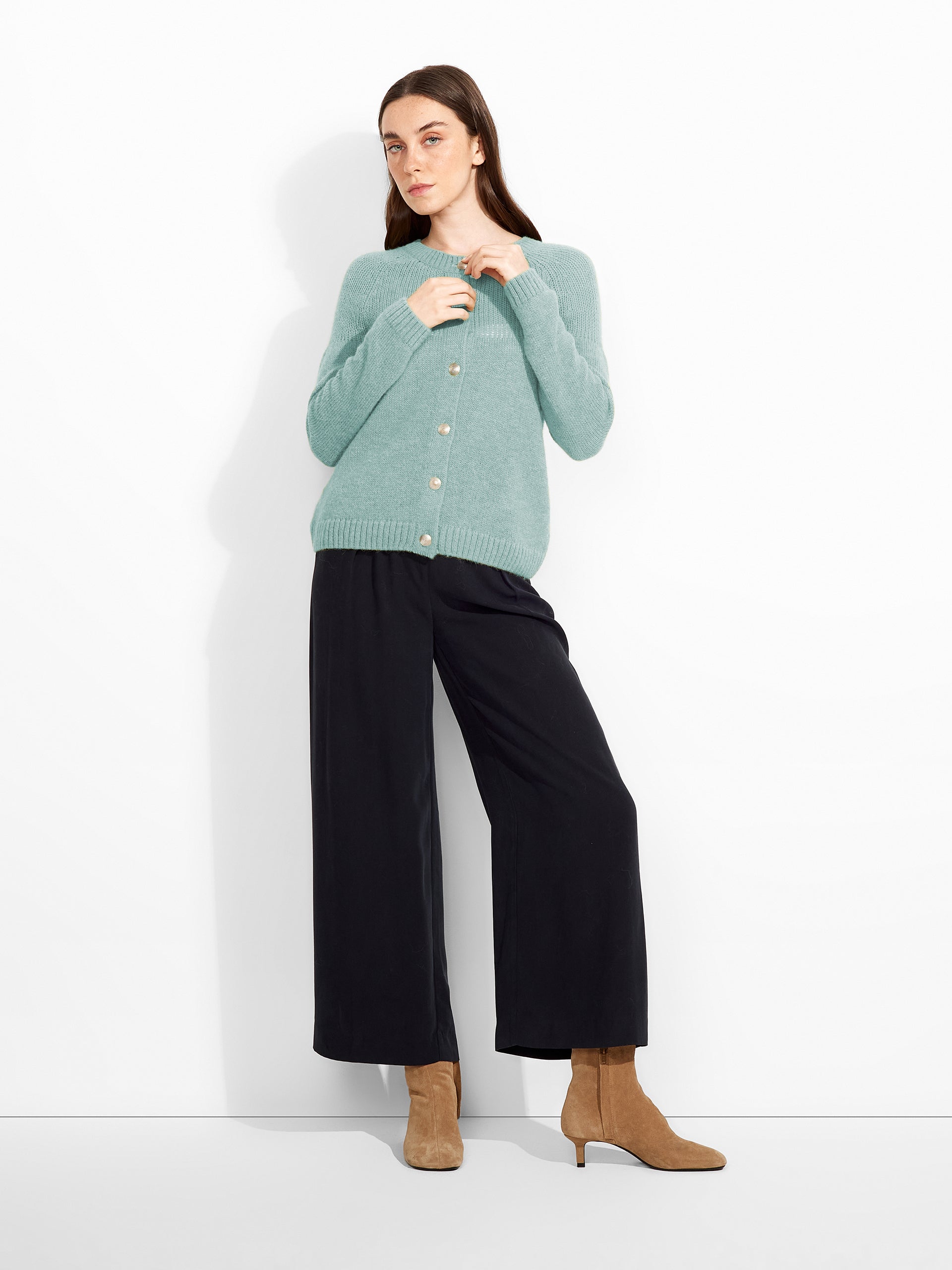 Suéter Zabine en tonalidad celeste, convertible en suéter o cárdigan, con cuello redondo cerrado. Presenta botones que permiten su transformación. Confeccionado en baby alpaca, brinda calidez y suavidad. | Material predominante: Baby Alpaca