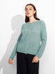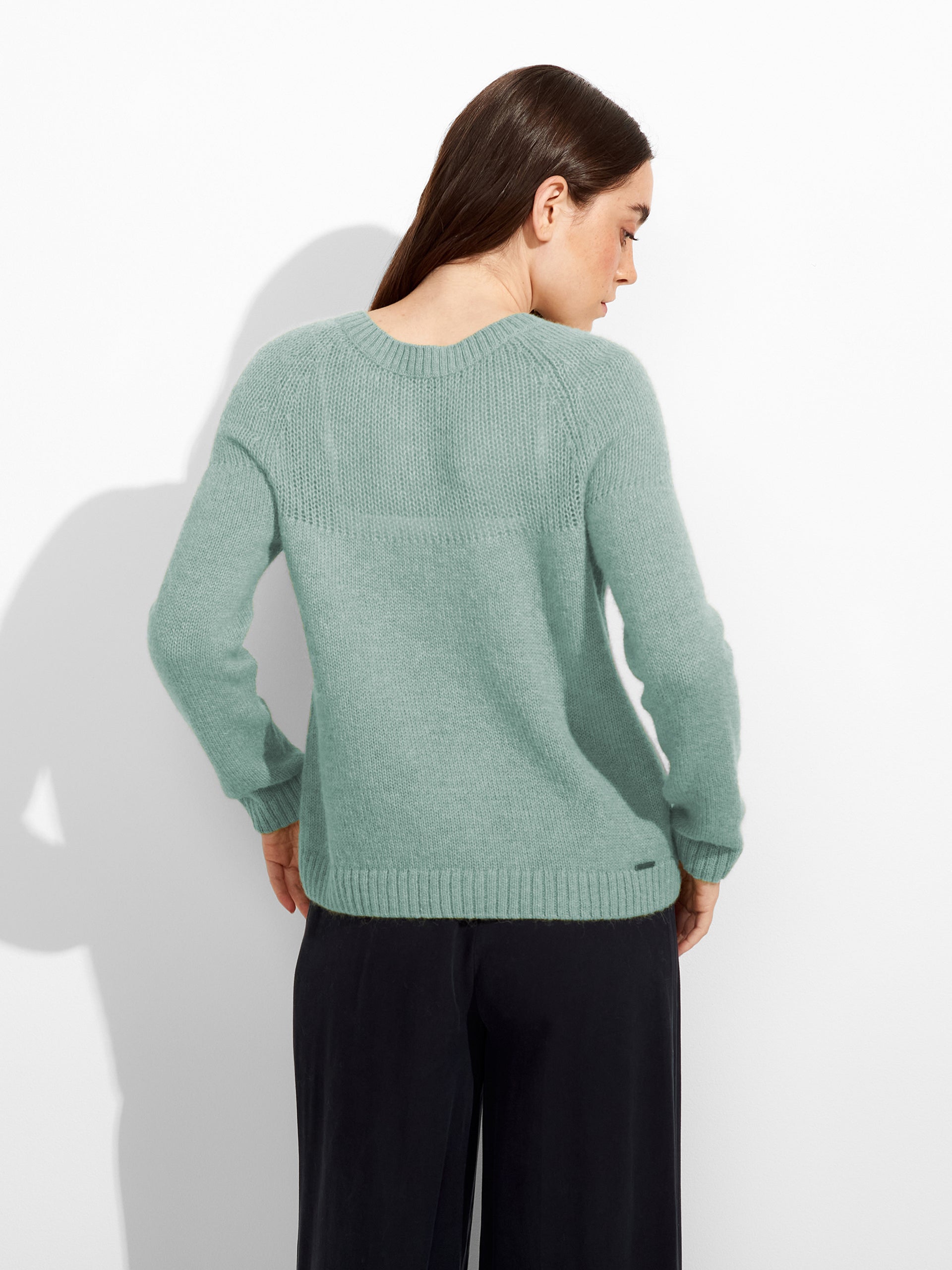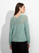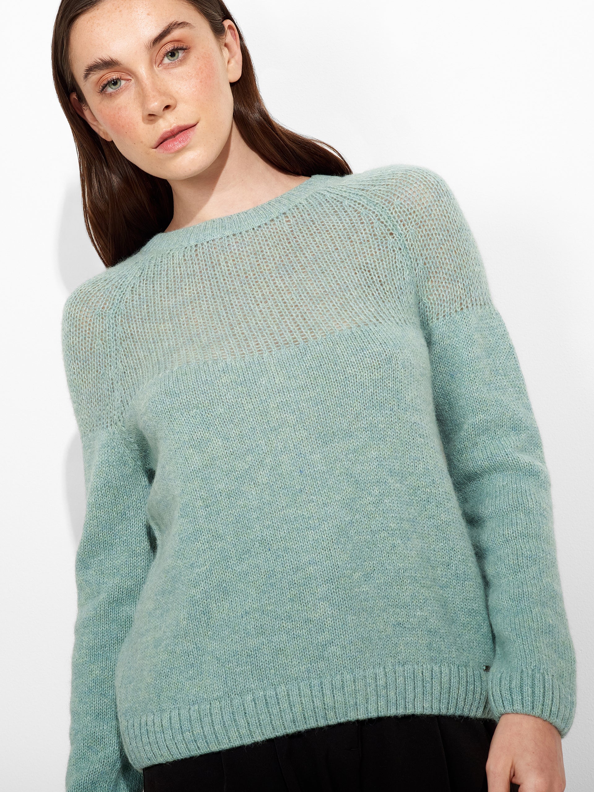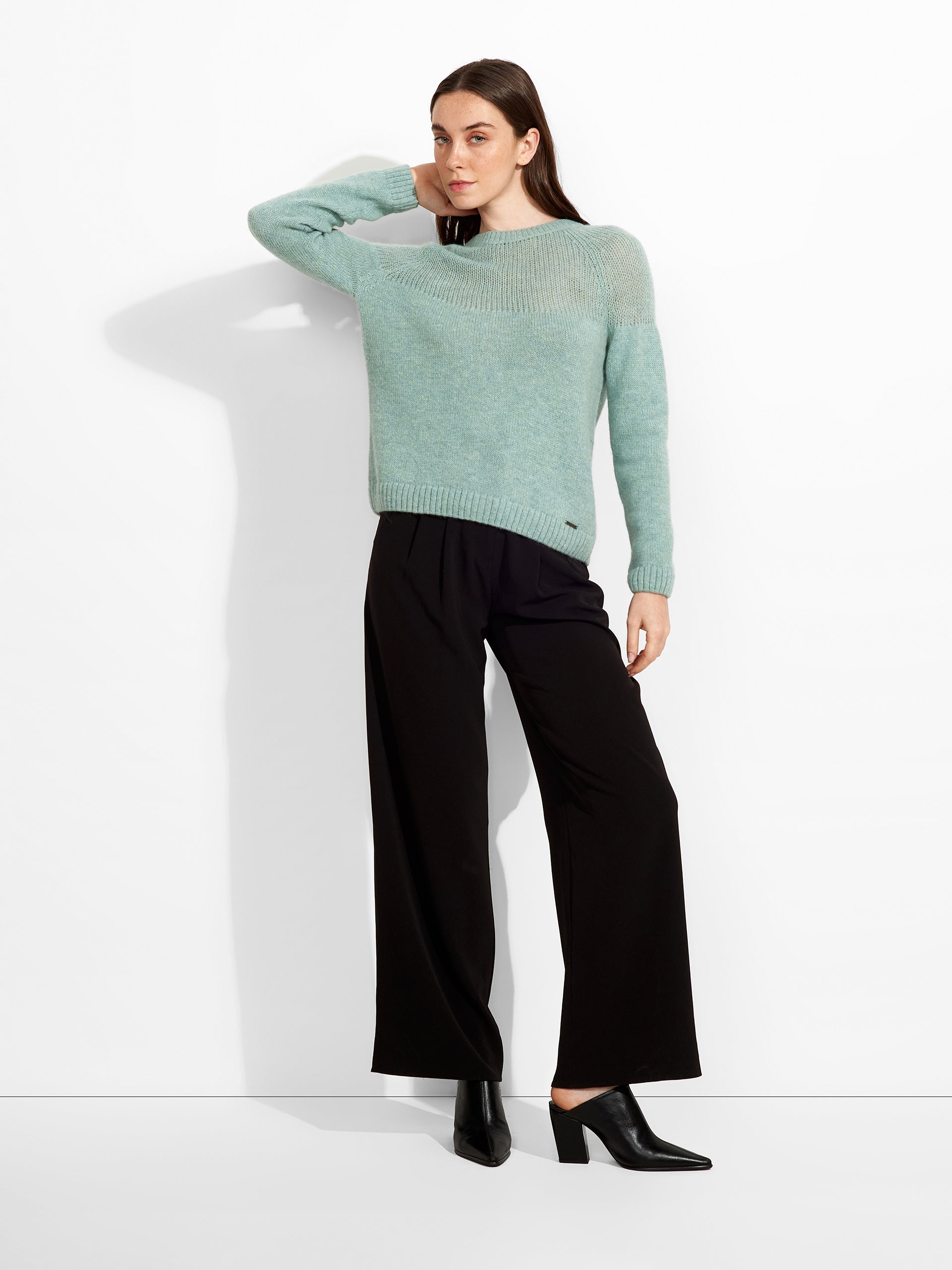 Suéter Zabine en tonalidad celeste, convertible en suéter o cárdigan, con cuello redondo cerrado. Presenta botones que permiten su transformación. Confeccionado en baby alpaca, brinda calidez y suavidad. | Material predominante: Baby Alpaca