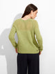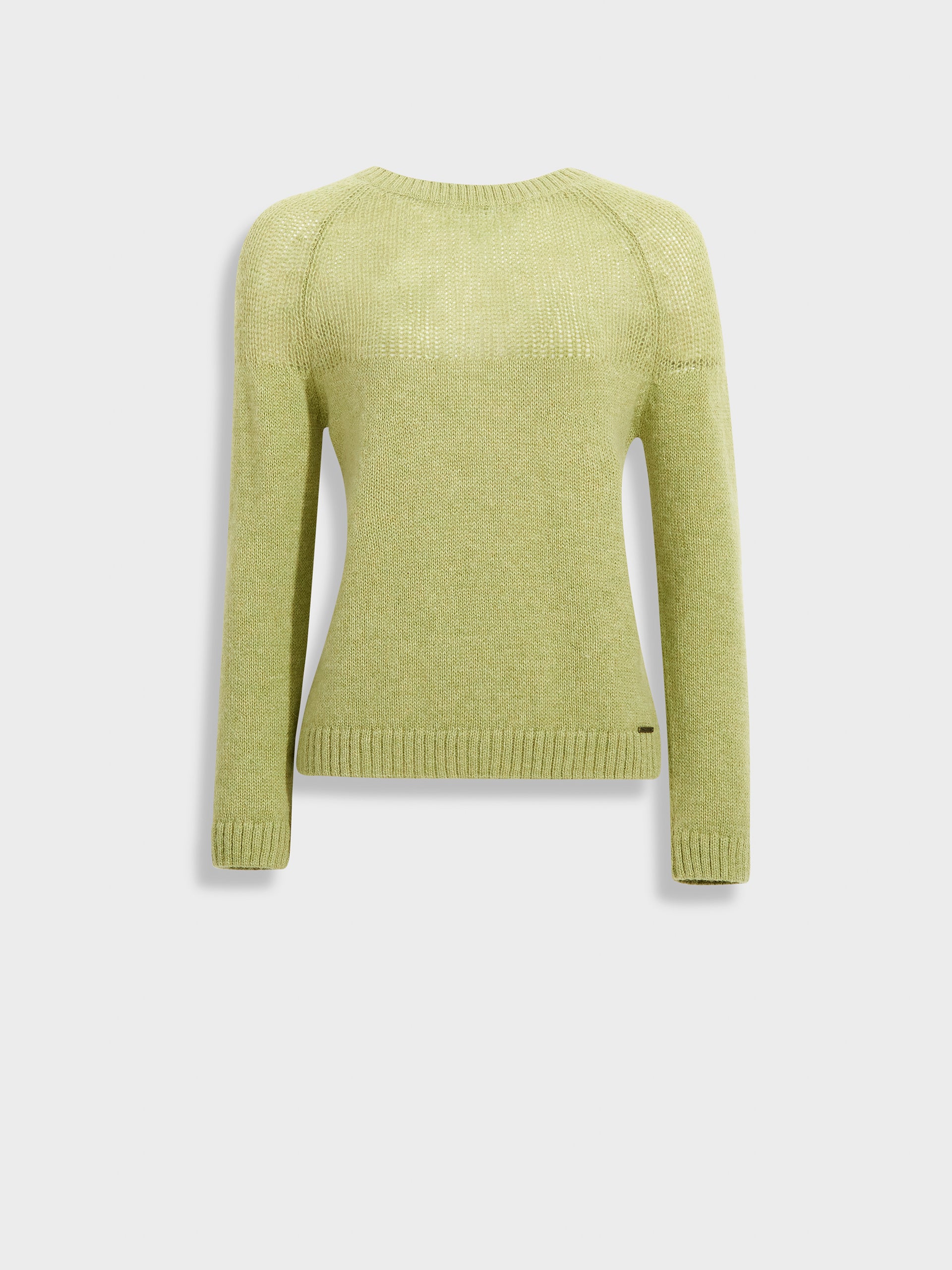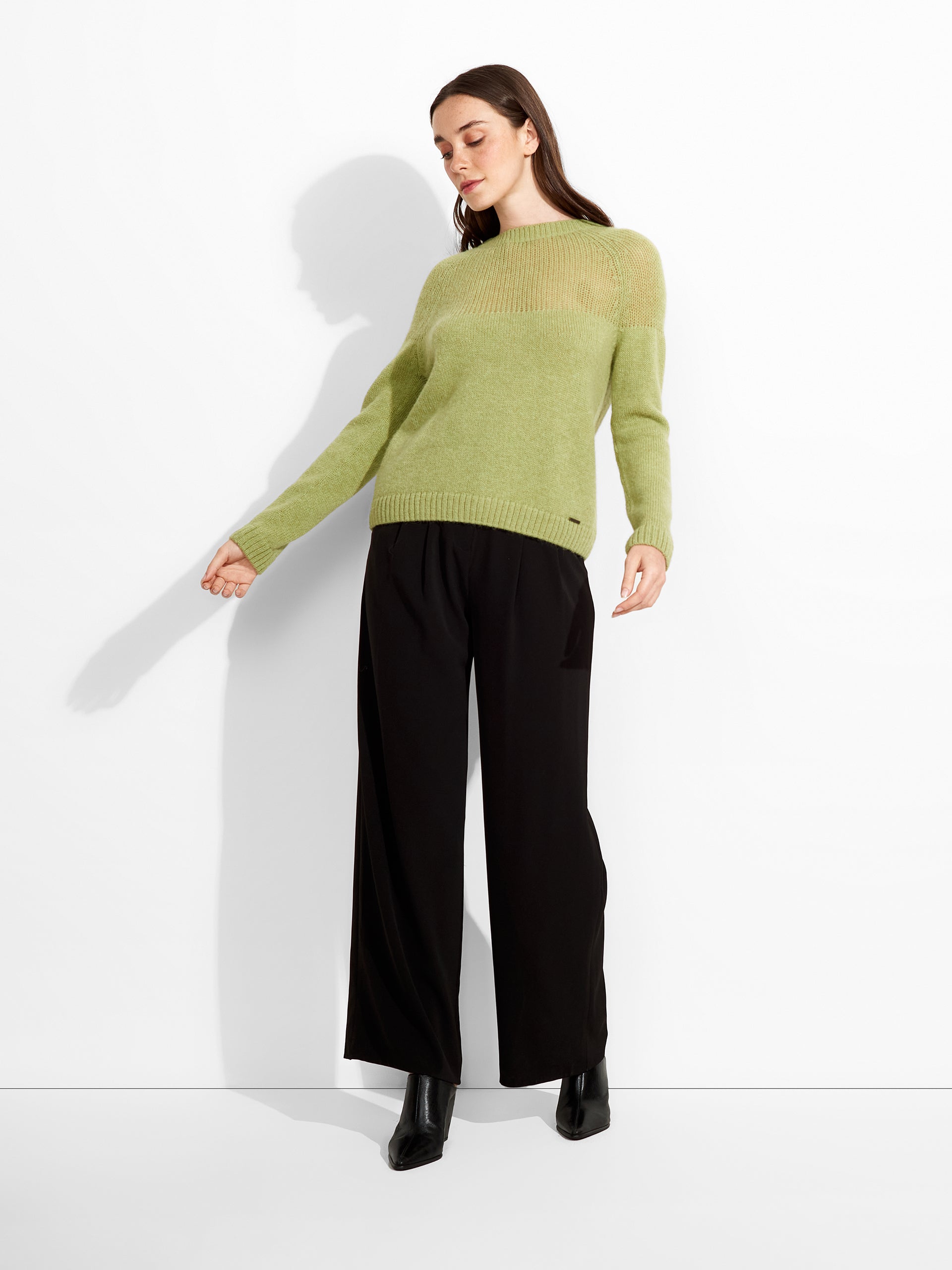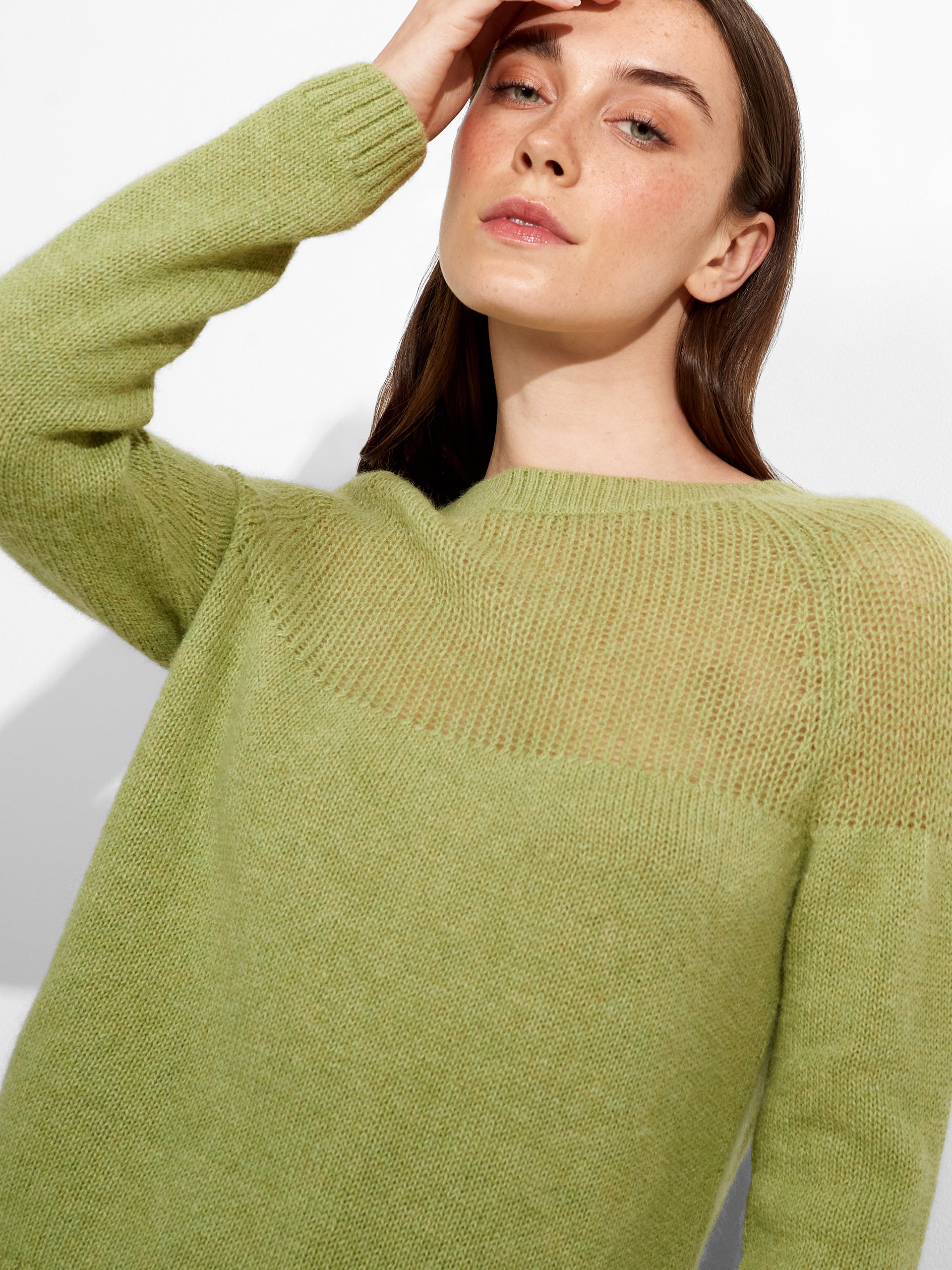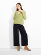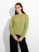 Suéter Zabine en tonalidad verde, convertible en suéter o cárdigan, con cuello redondo cerrado. Presenta botones que permiten su transformación. Confeccionado en baby alpaca, brinda calidez y suavidad. | Material predominante: Baby Alpaca