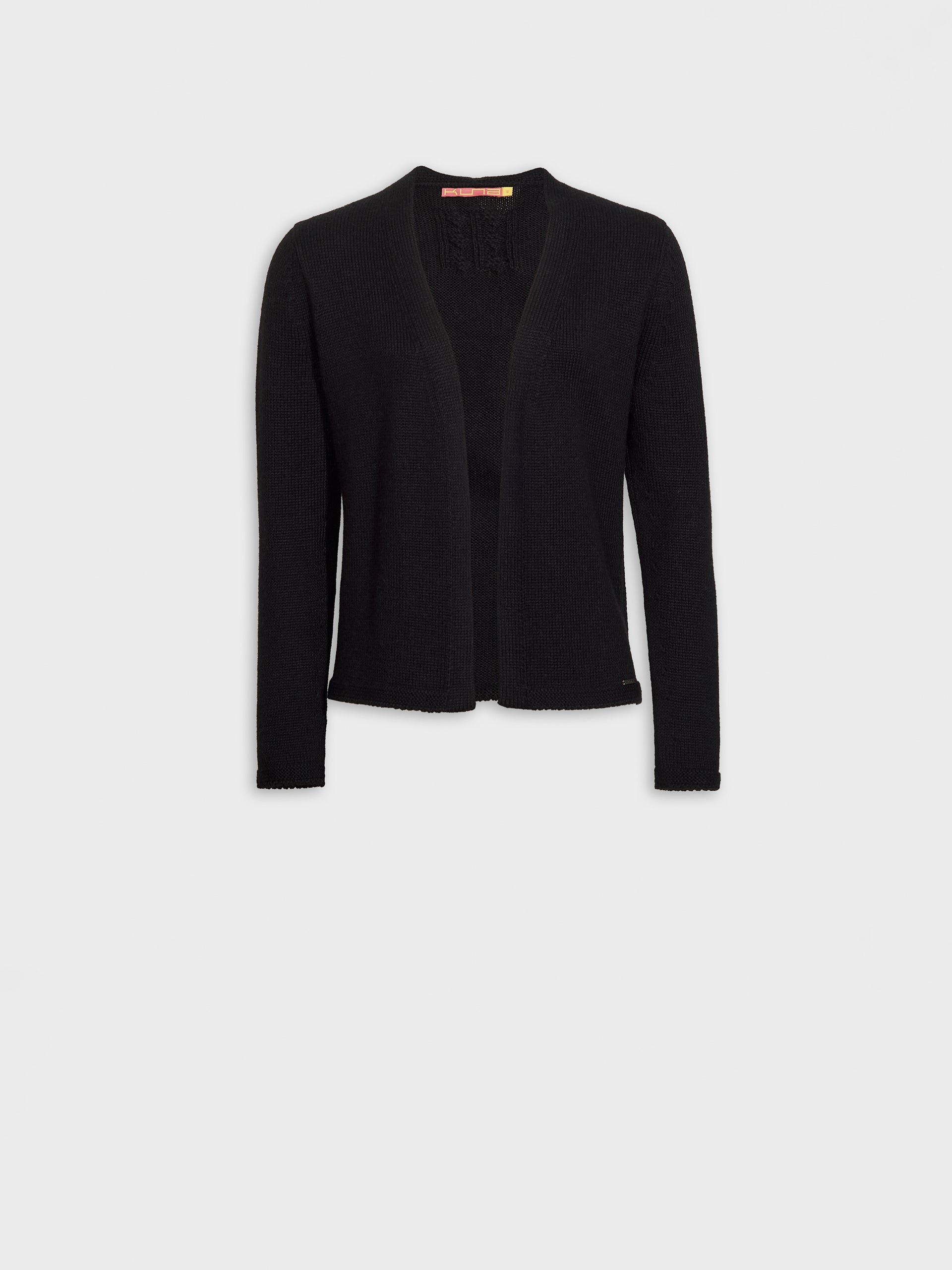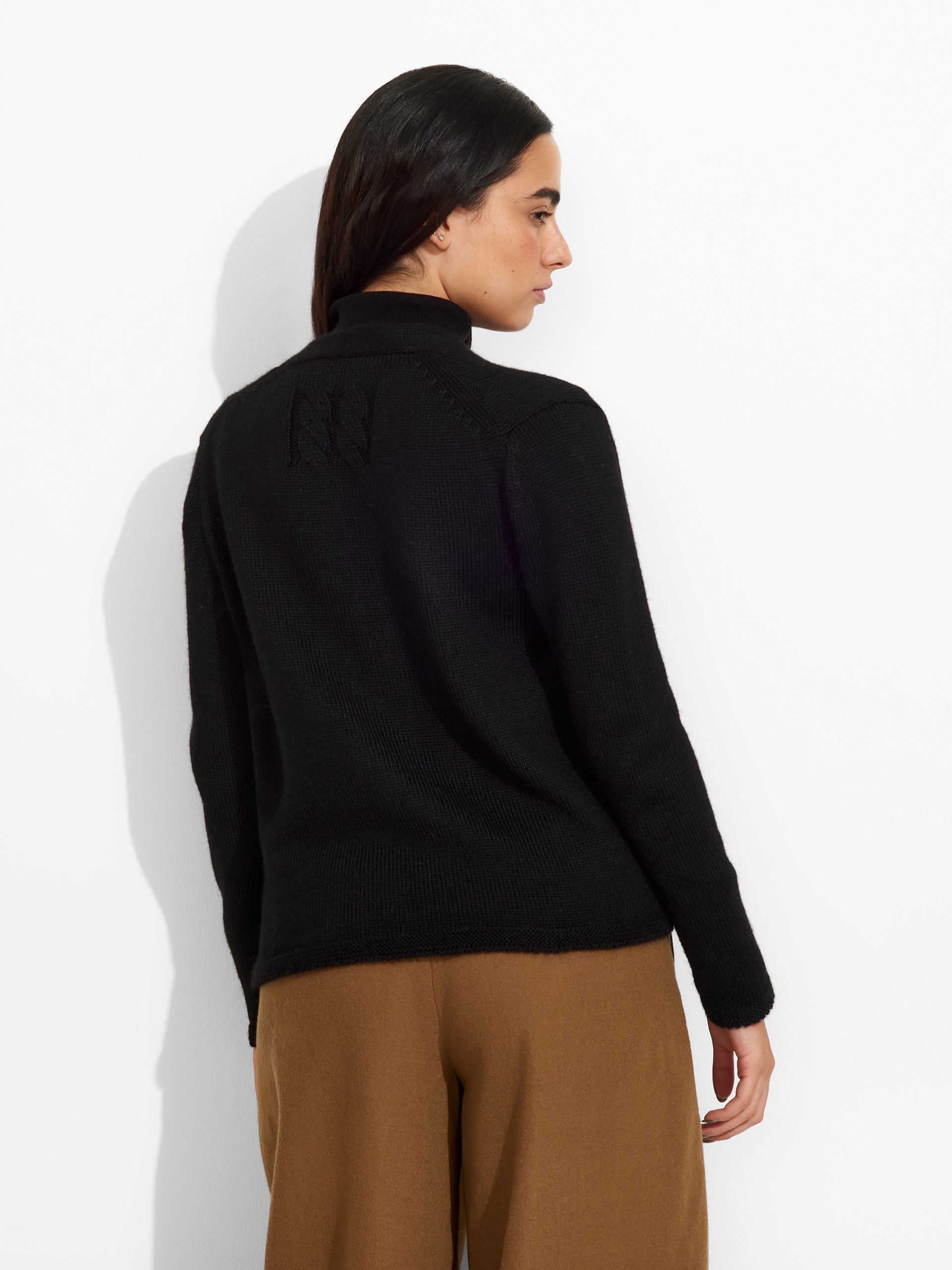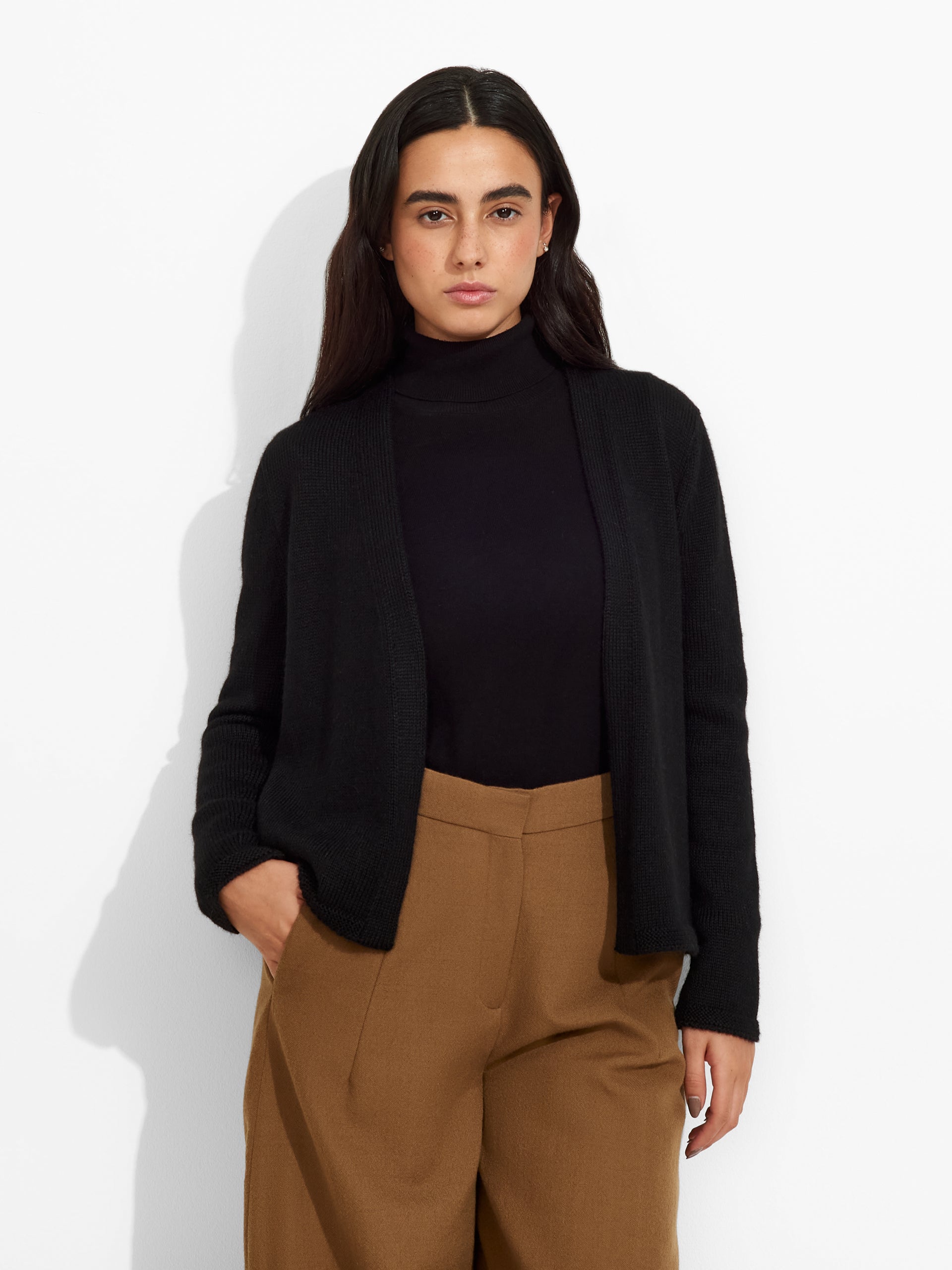 Cardigan Zafiro en tonalidad negro de punto llano con silueta fluida y relajada. Confeccionado en baby alpaca, brinda calidez y suavidad. | Material predominante: Baby Alpaca