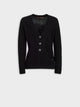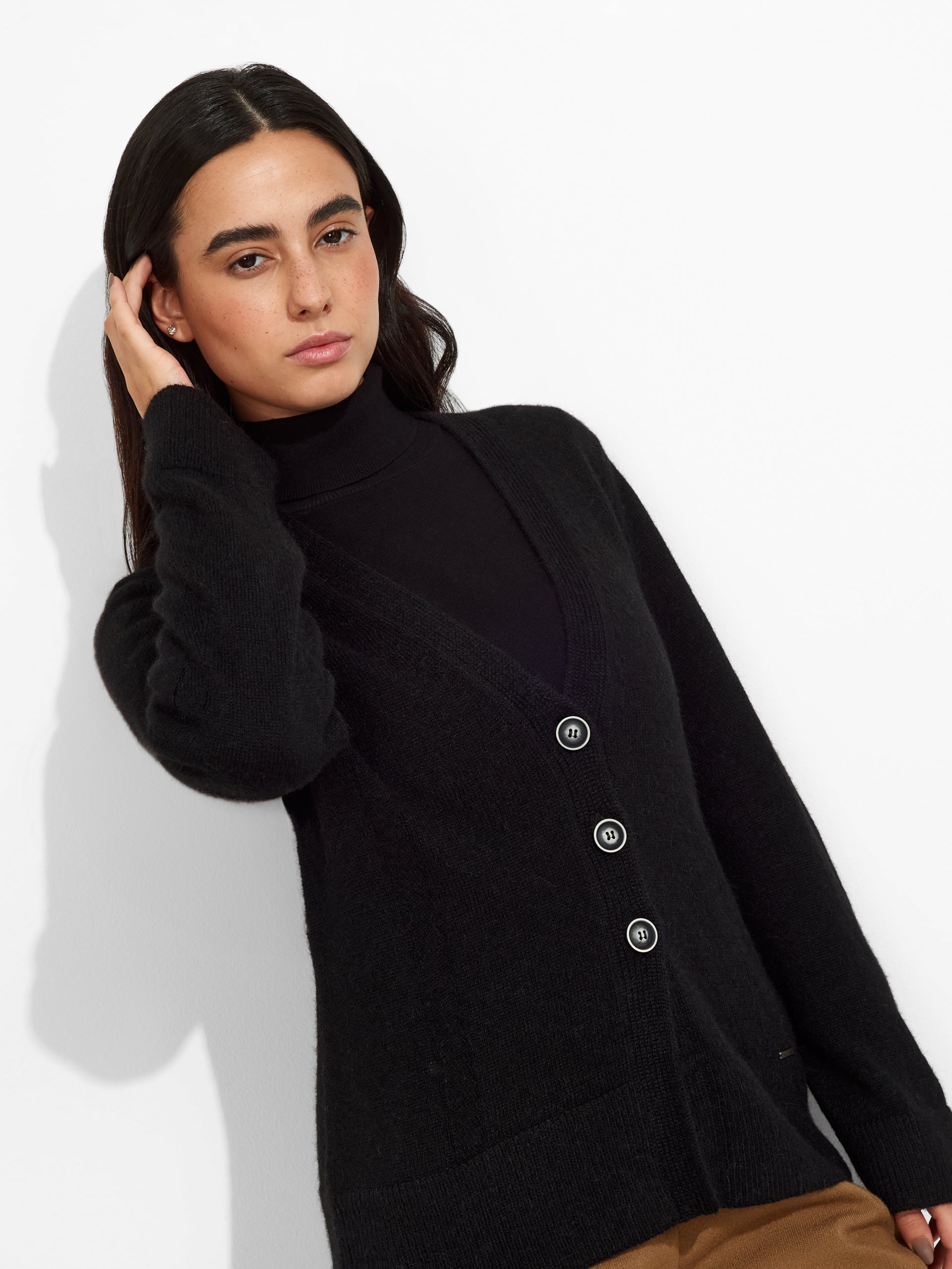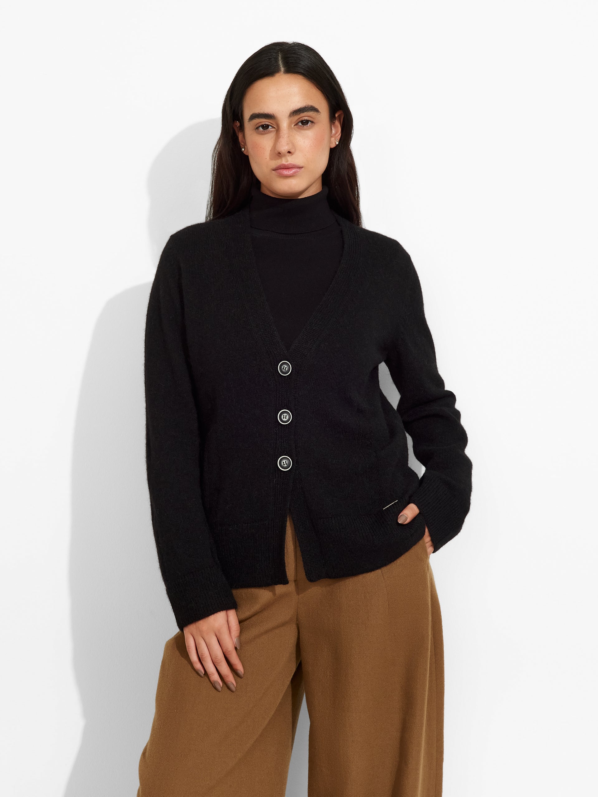 Cárdigan Zia en tonalidad negro, de corte clásico con botones, escote en "V". Confeccionado en baby alpaca, brinda calidez y suavidad. | Material predominante: Baby Alpaca
