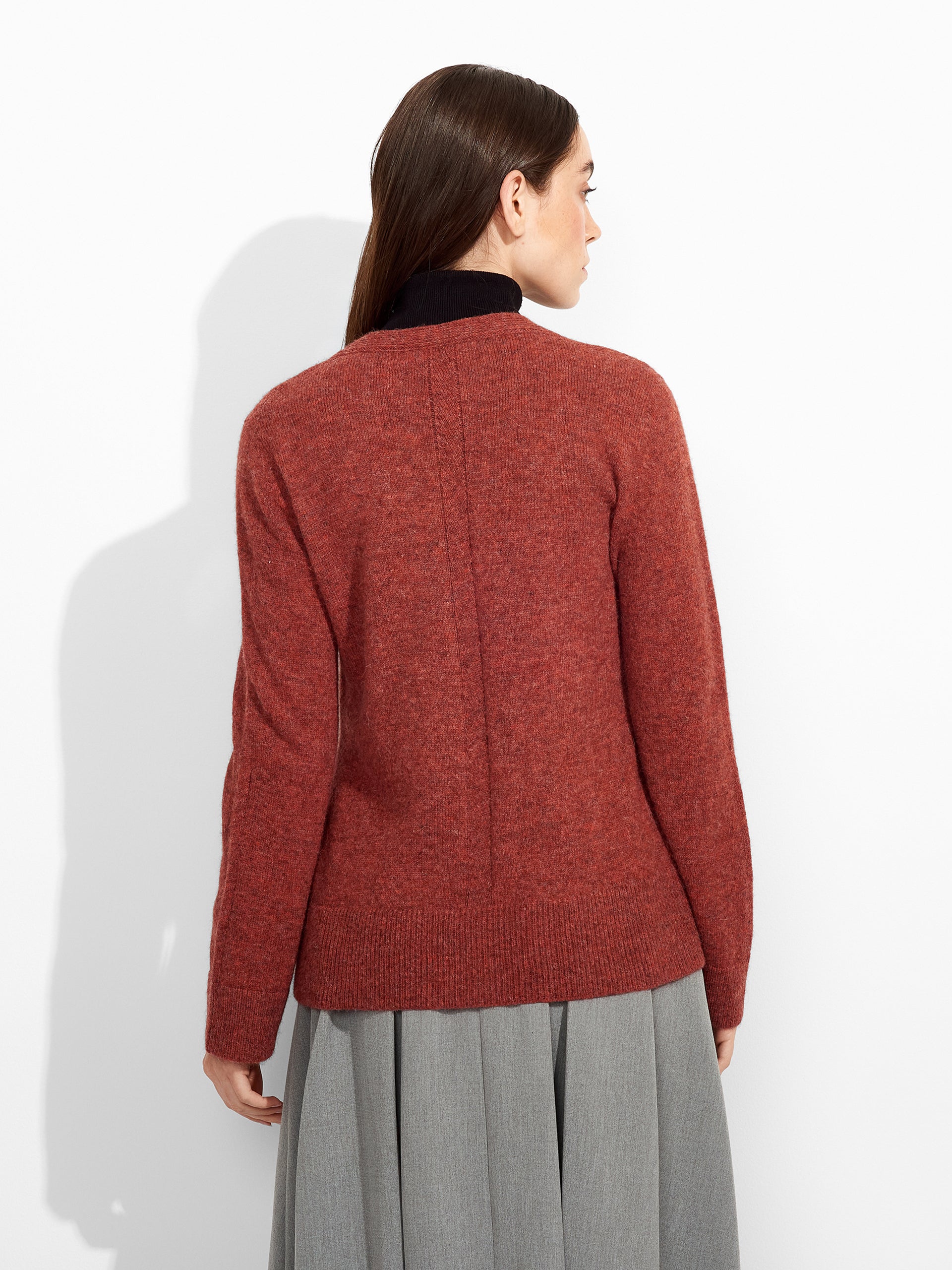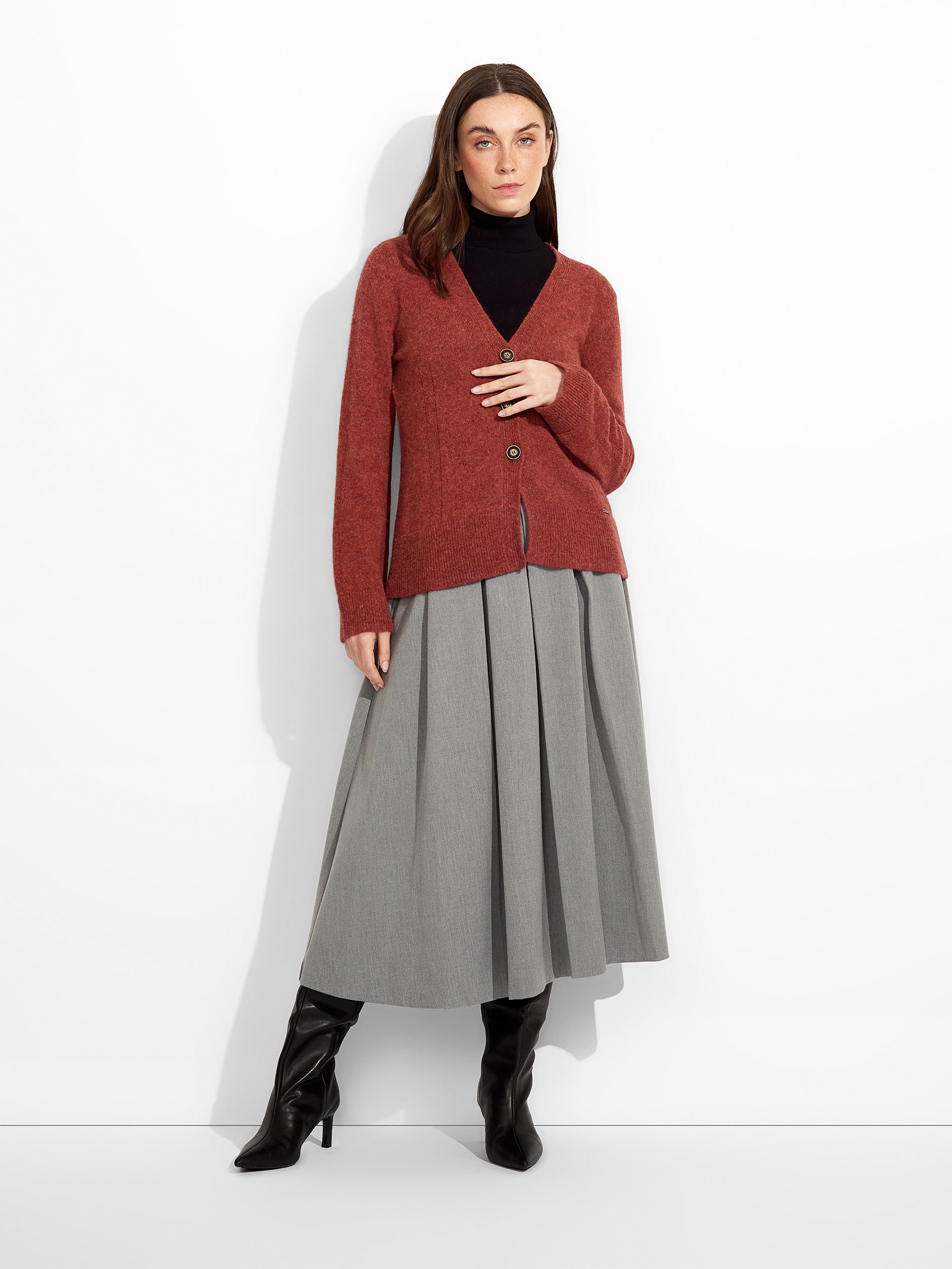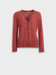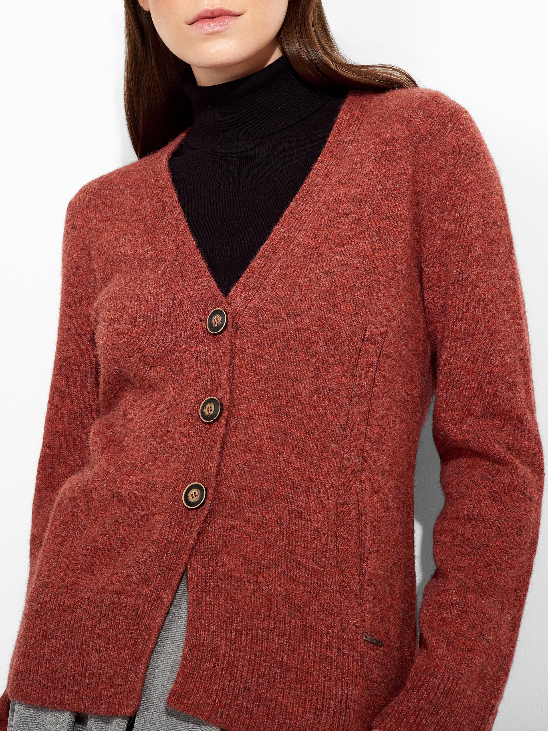 Cárdigan Zia en tonalidad rojo, de corte clásico con botones, escote en "V". Confeccionado en baby alpaca, brinda calidez y suavidad. | Material predominante: Baby Alpaca