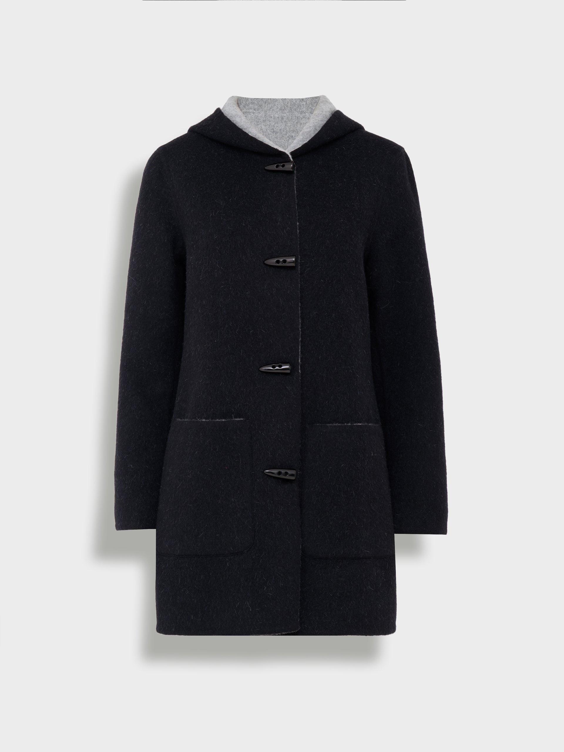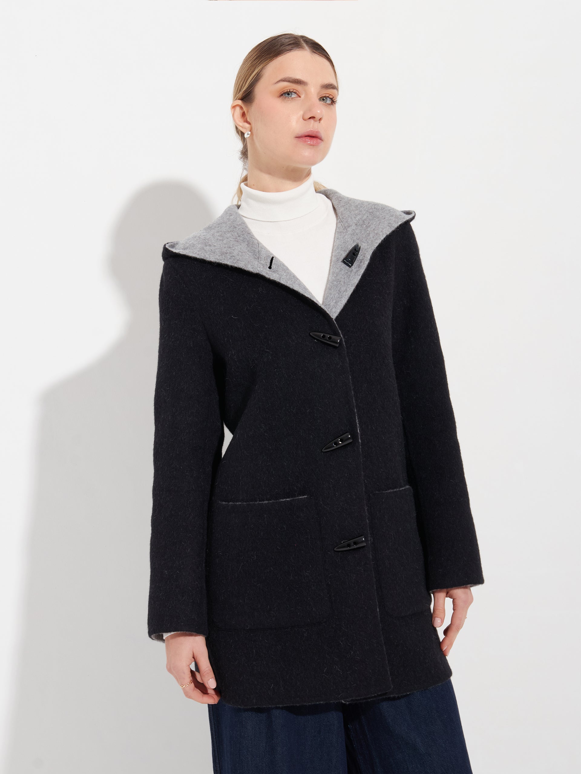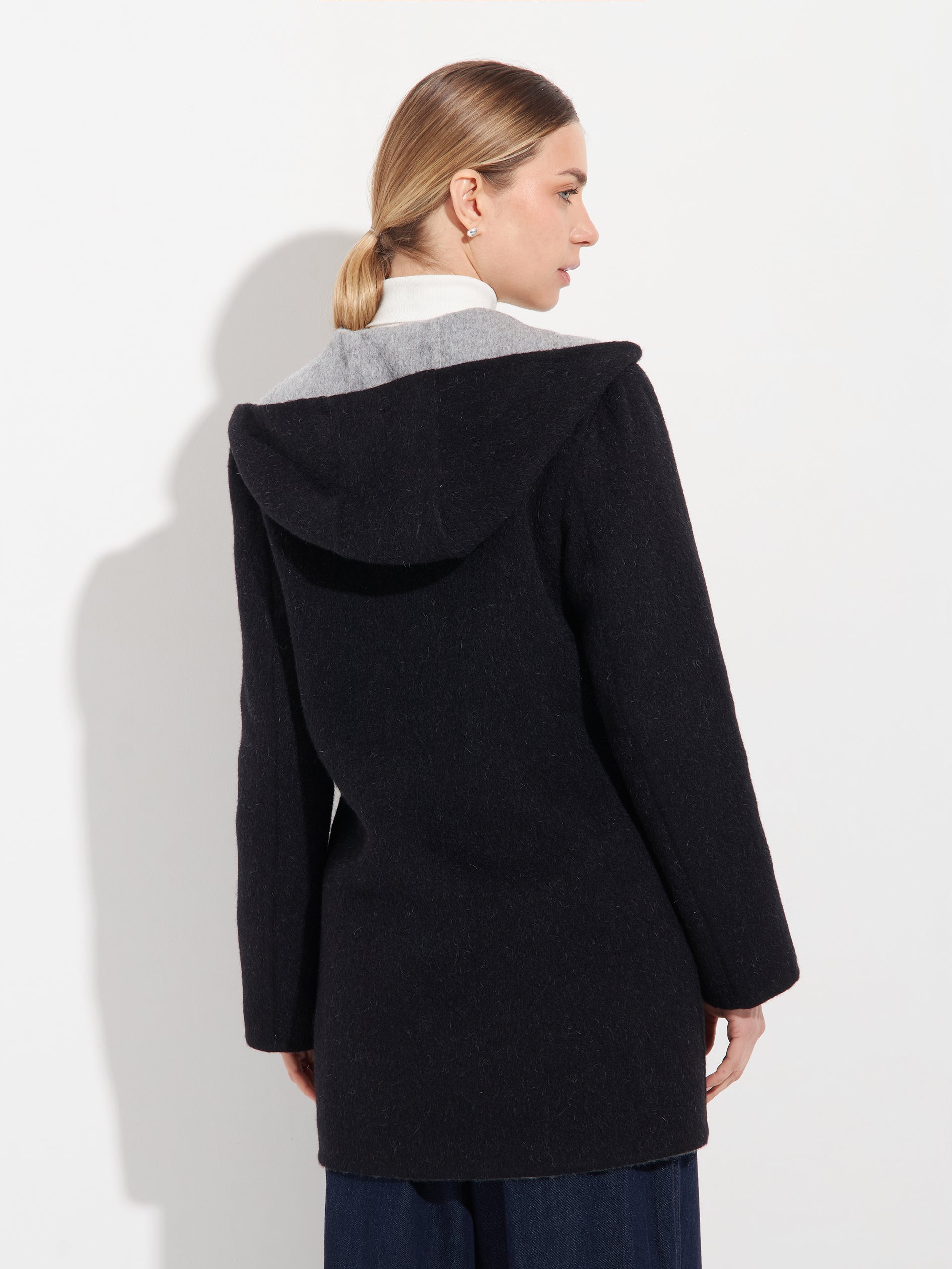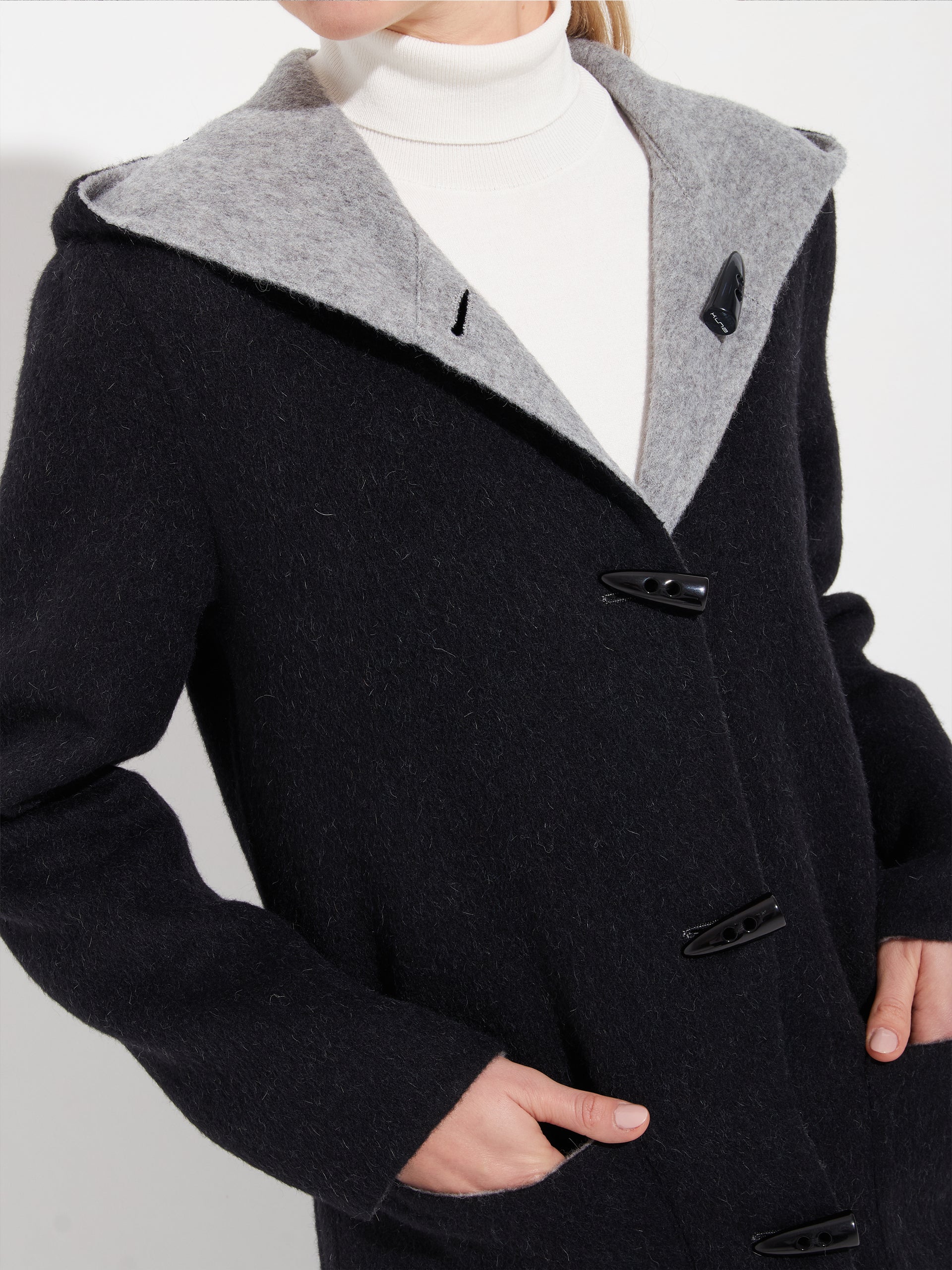 Abrigo Alaia en tonalidad negro, presenta una silueta envolvente con capucha, botones de poliester tipo cacho y bolsillos de parche frontales. Su diseño reversible lo hace versátil. Confeccionado en una mezcla de baby alpaca y lana. | Material predominante: Baby Alpaca