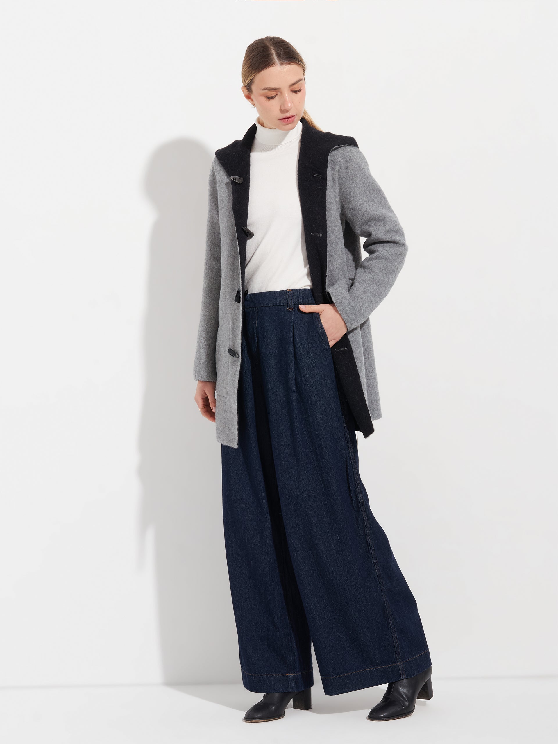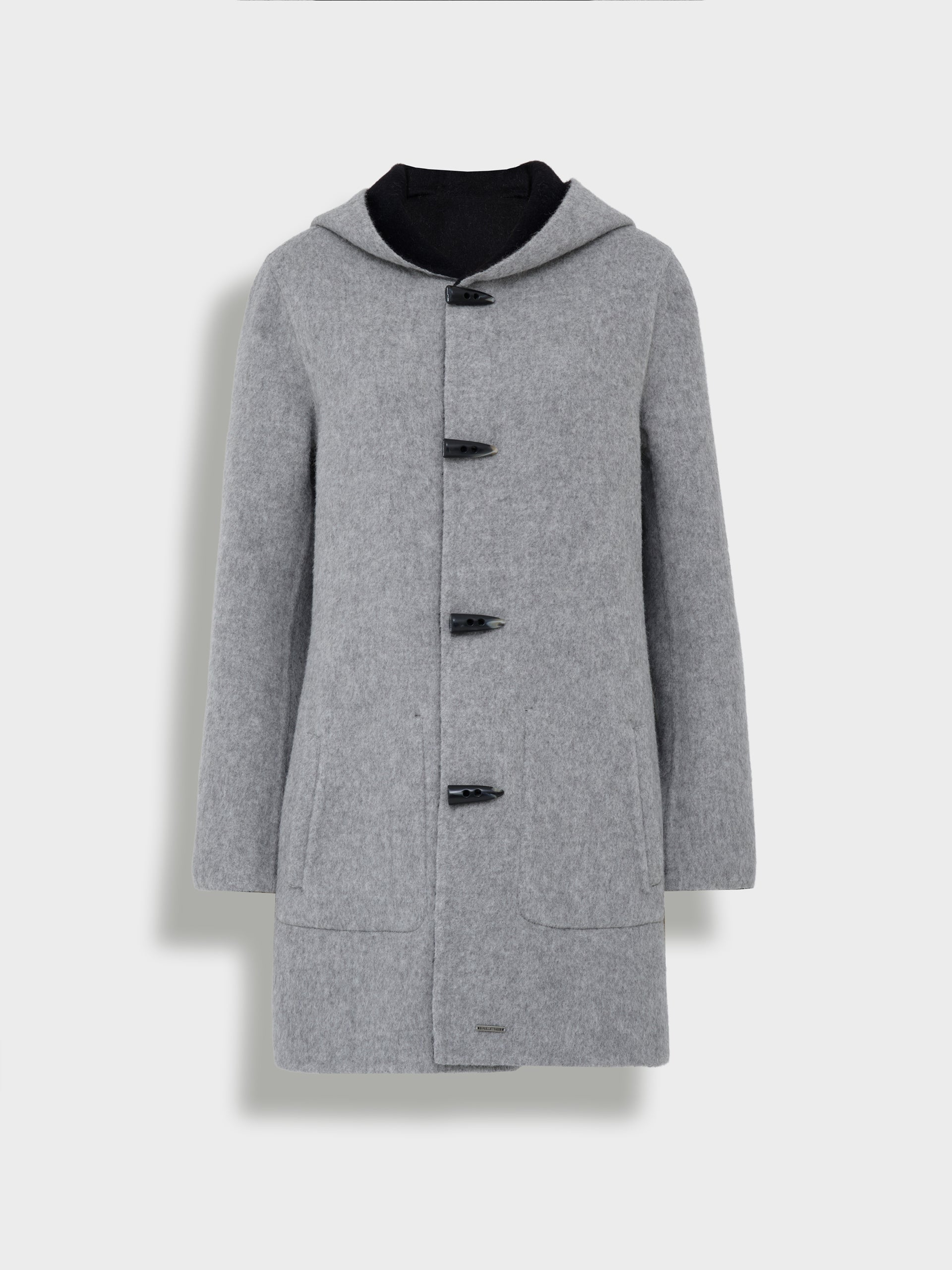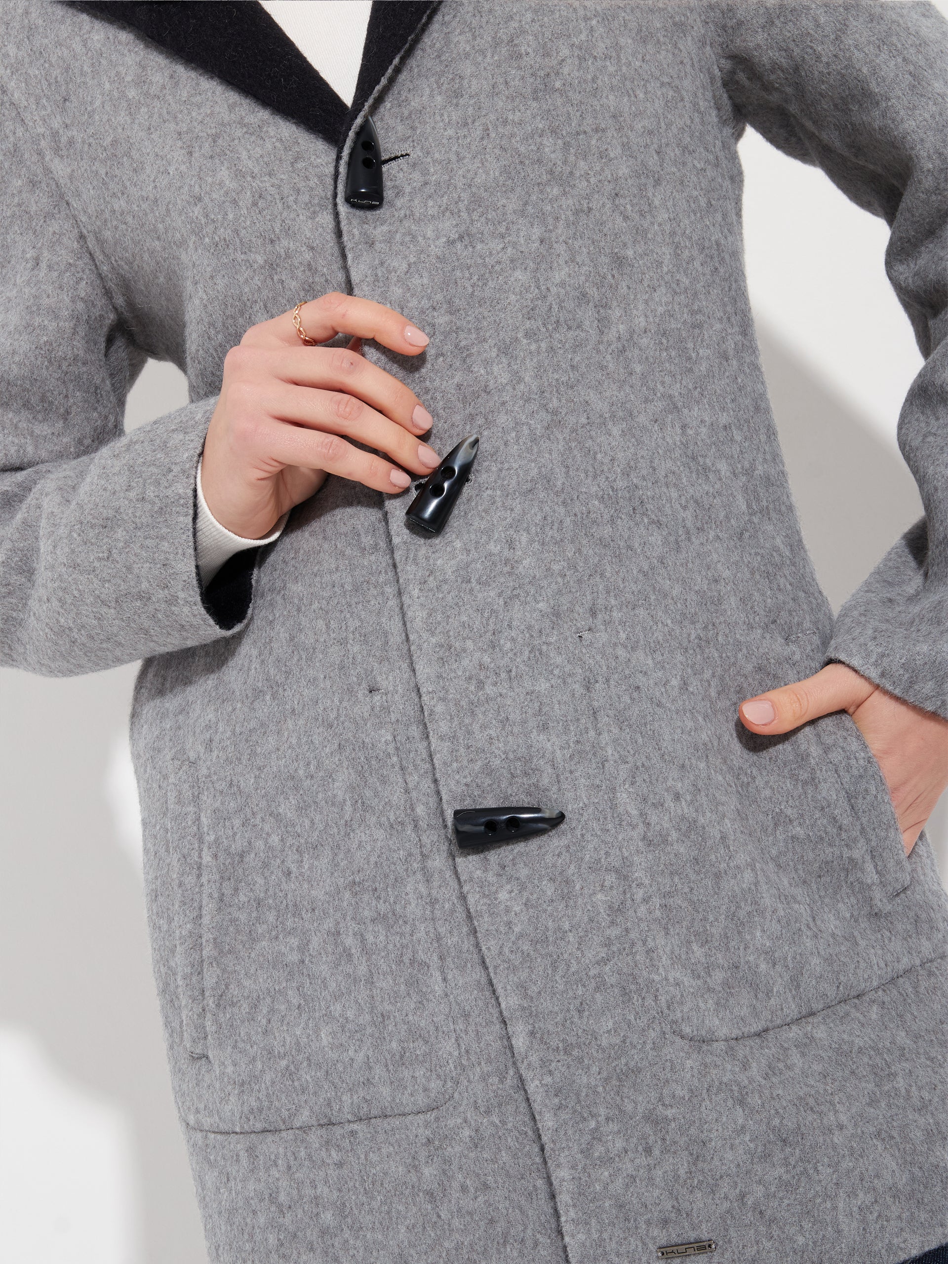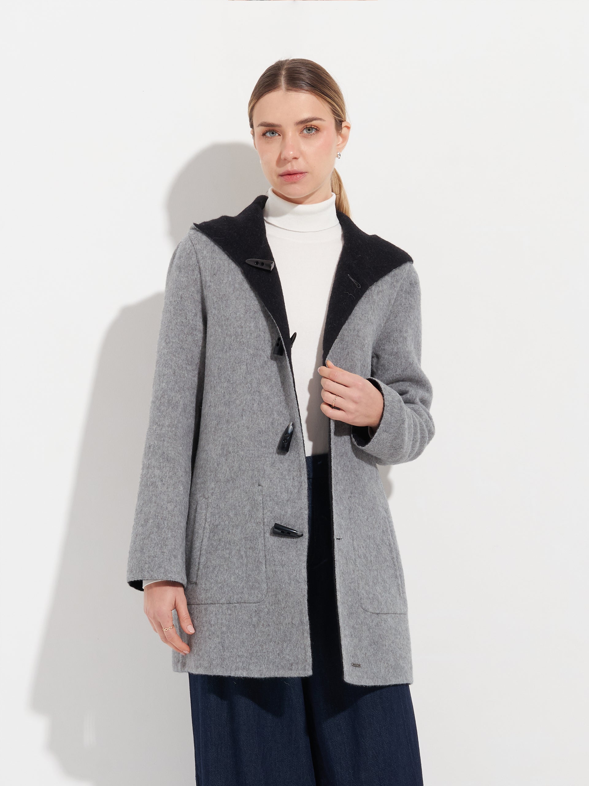 Abrigo Alaia en tonalidad negro, presenta una silueta envolvente con capucha, botones de poliester tipo cacho y bolsillos de parche frontales. Su diseño reversible lo hace versátil. Confeccionado en una mezcla de baby alpaca y lana. | Material predominante: Baby Alpaca