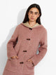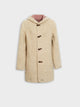 Abrigo Alaia en tonalidad rosado, presenta una silueta envolvente con capucha, botones de poliester tipo cacho y bolsillos de parche frontales. Su diseño reversible lo hace versátil. Confeccionado en una mezcla de baby alpaca y lana. | Material predominante: Baby Alpaca