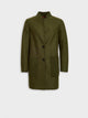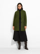 Abrigo Zybil en tonalidad verde, destaca por su diseño sin forro y cuello mao. Presenta botones de cacho y un delicado tejido en punto milano en el cuello, la espalda y los bolsillos parche. Confeccionado en una mezcla de alpaca y lana.