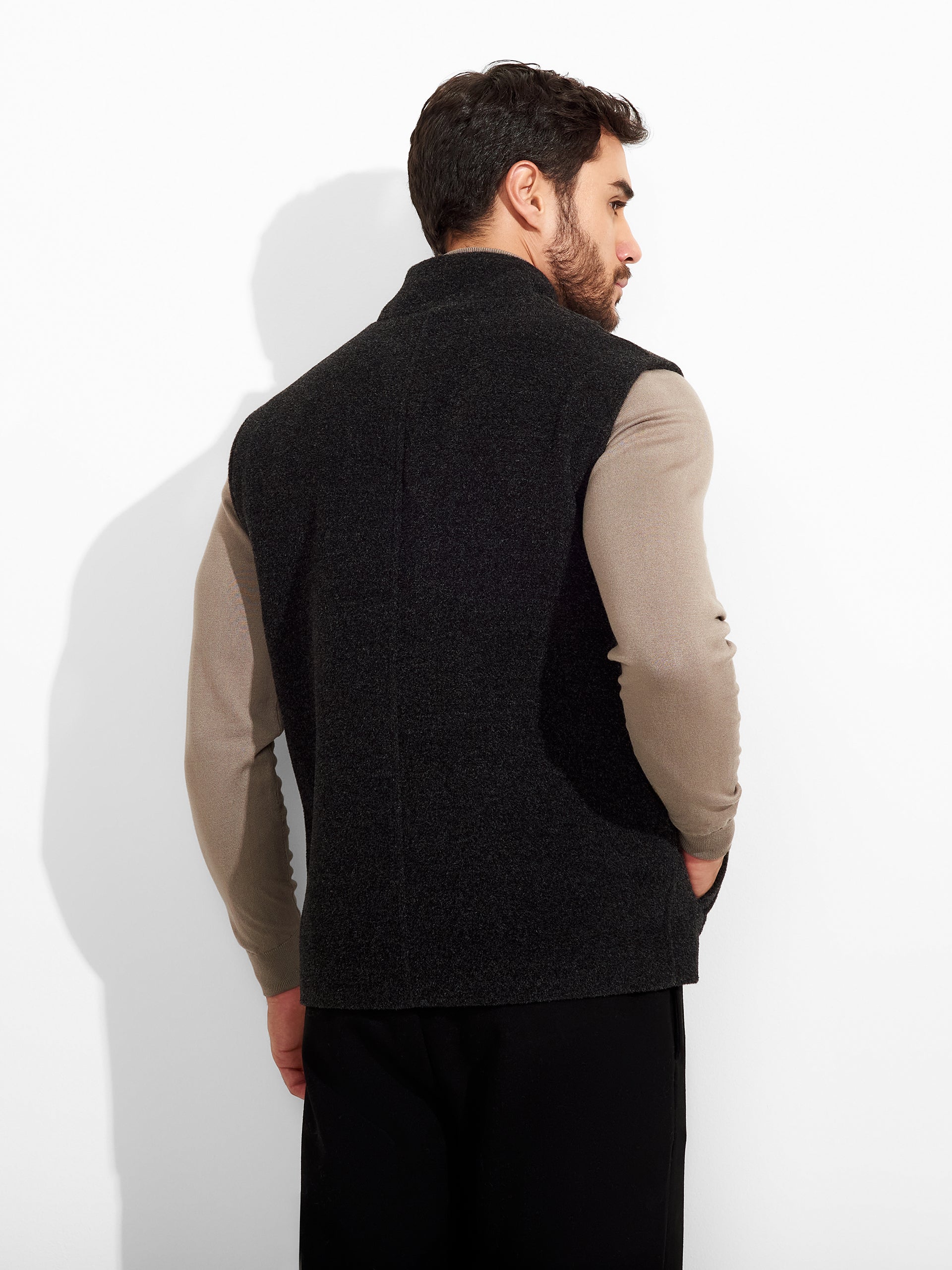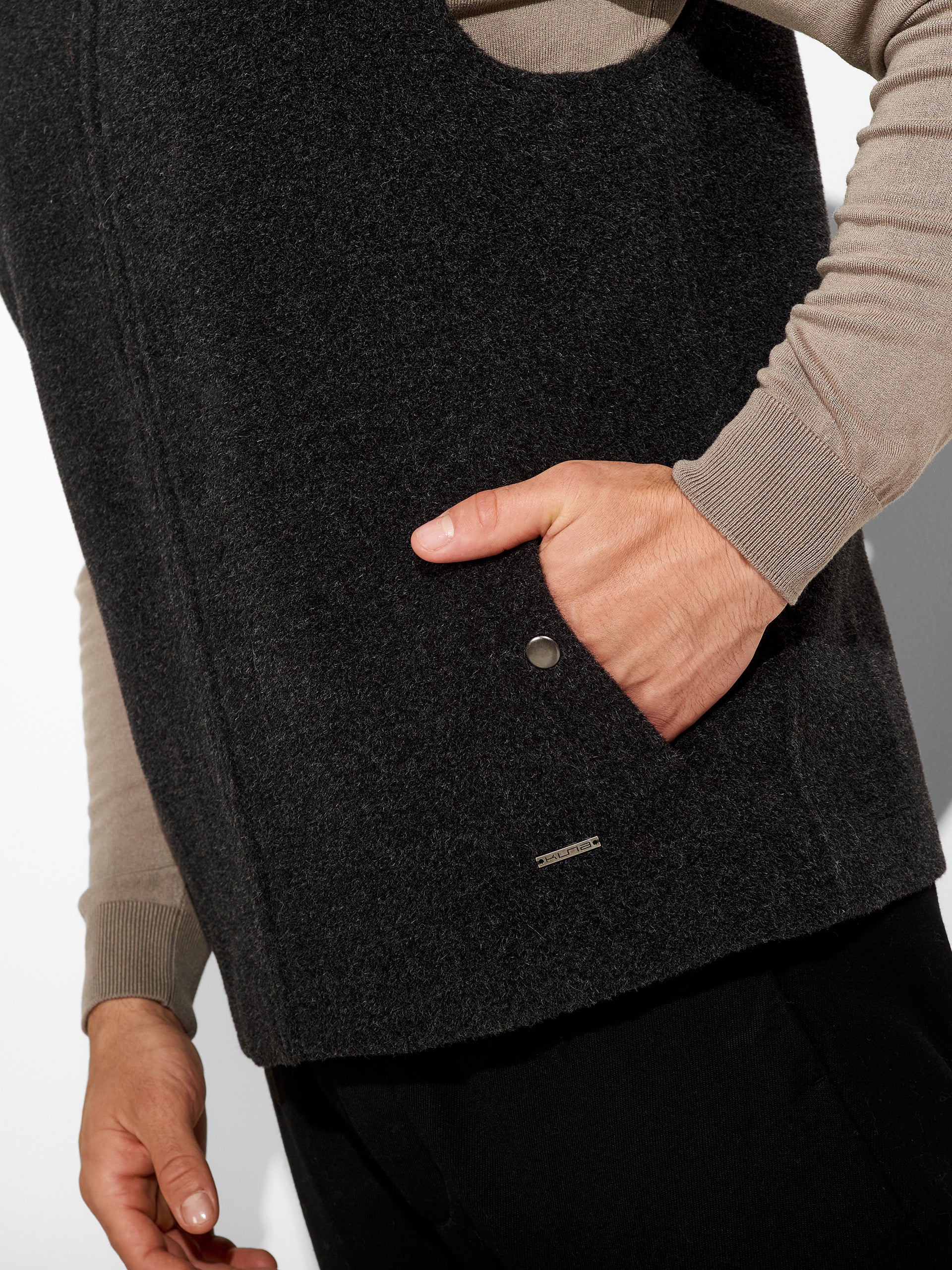 Chaleco Zunkle en tonalidad gris, presenta un diseño con cuello alto, cierre metálico y bolsillos con broches metálicos. Incorpora aplicación de algodón en tejido punto mouliné en el interior del cuello. Lleva forro interno para mayor comodidad. Confeccionado en alpaca y lana. | Material predominante: Lana