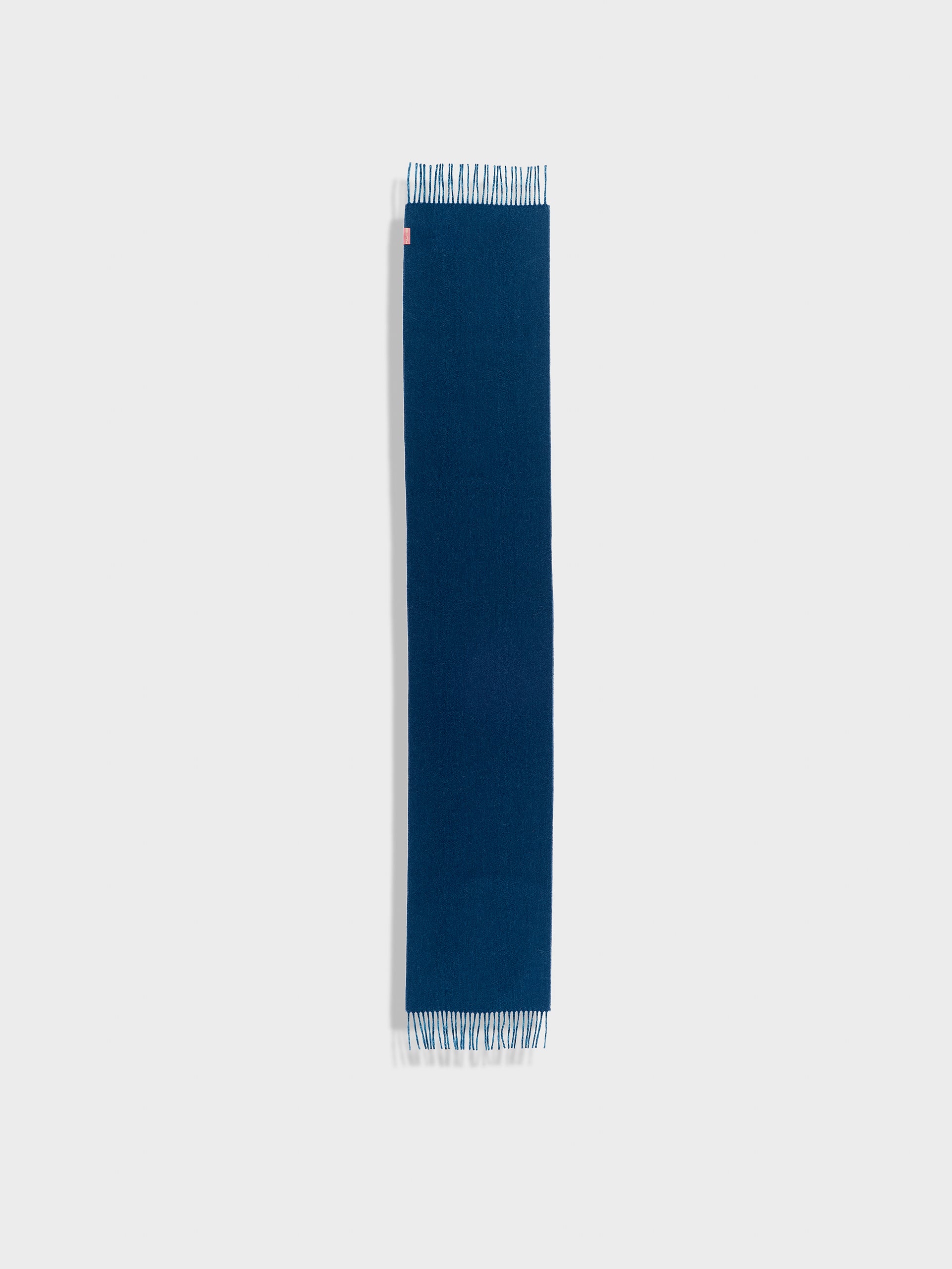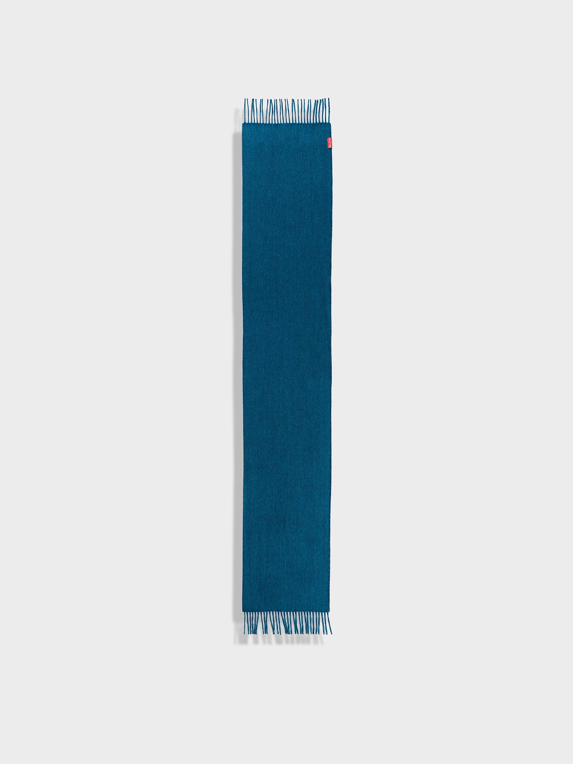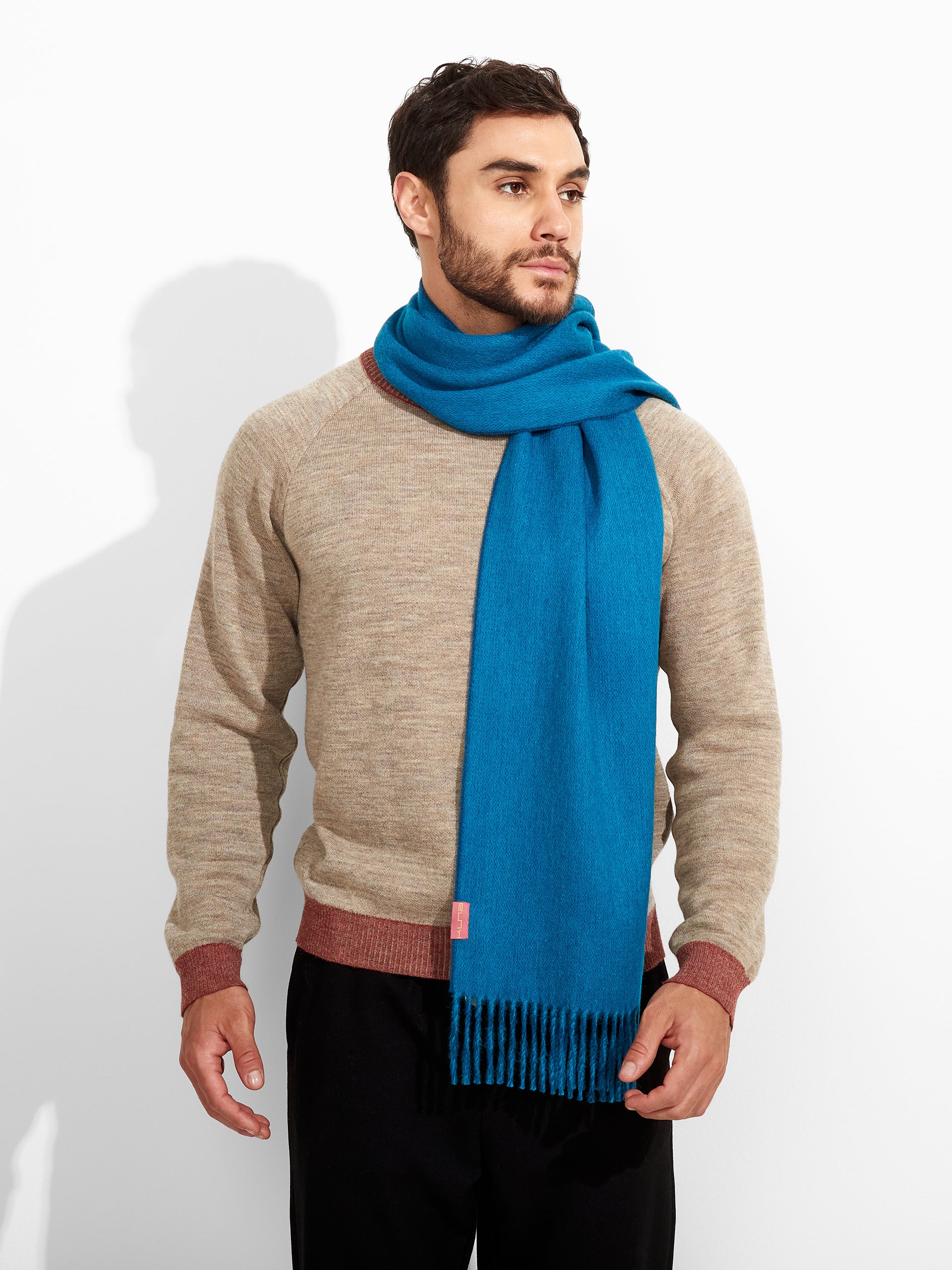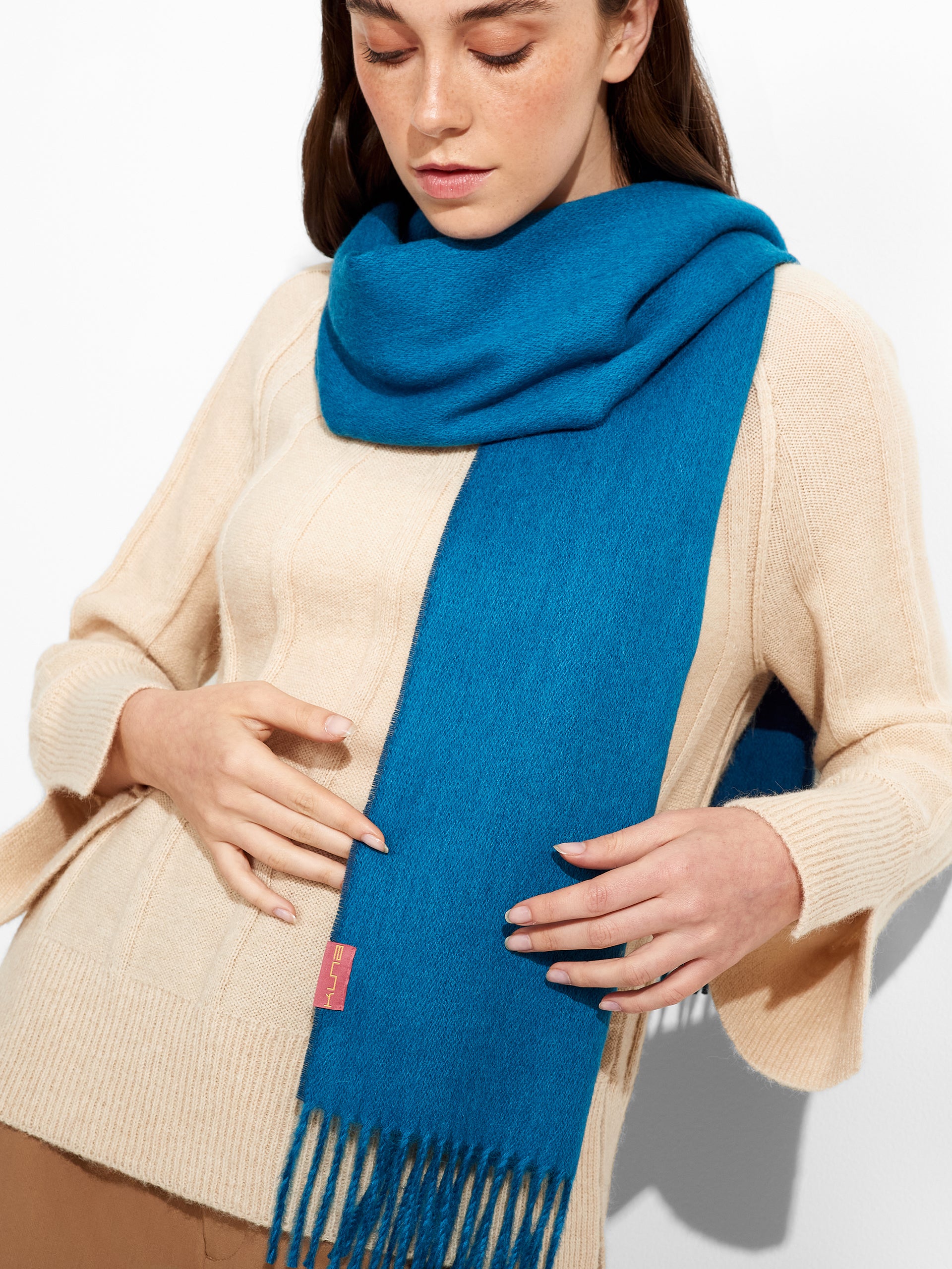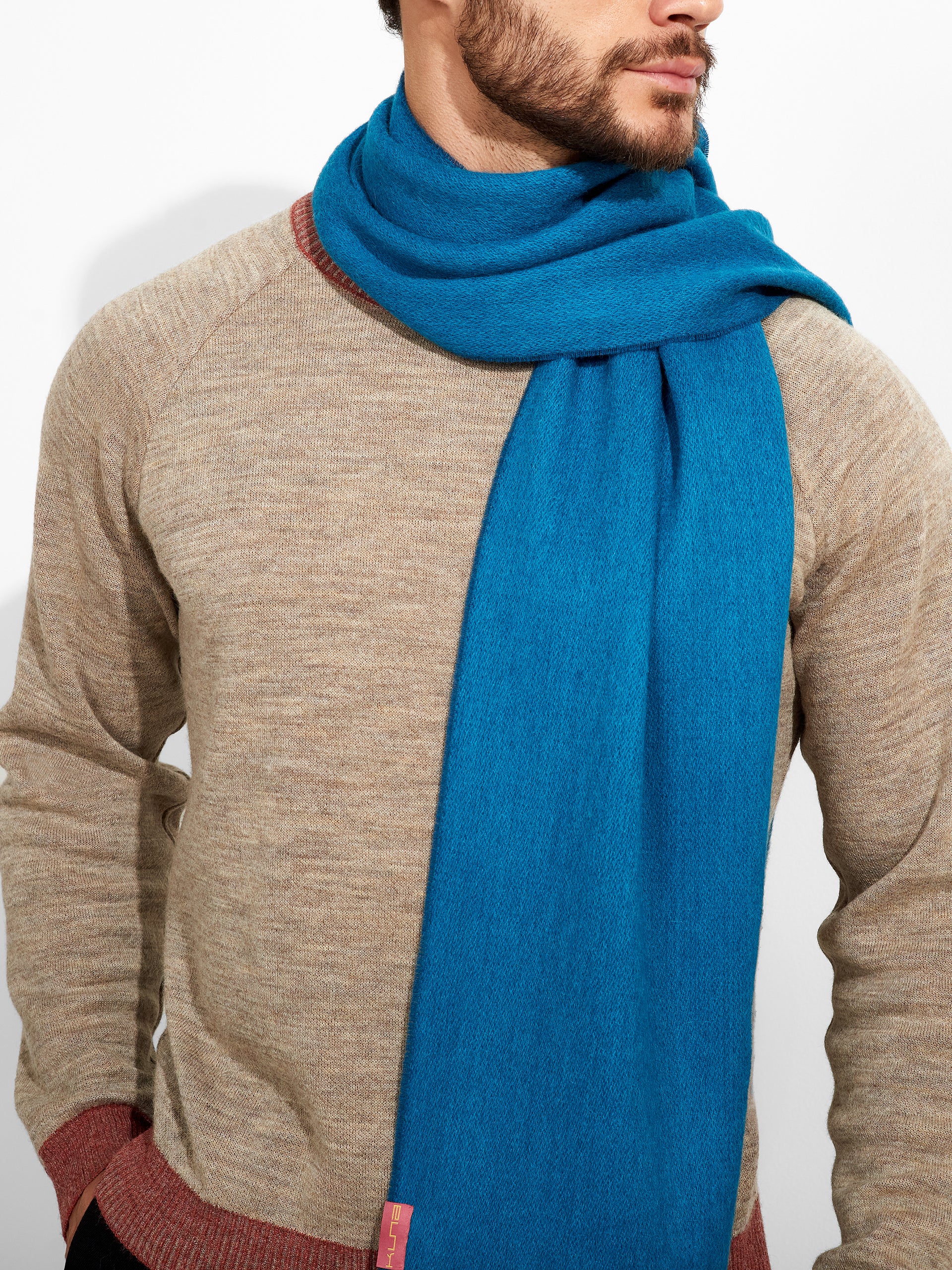 Chalina Tundra en tonalidad azul, con diseño de doble cara que resalta dos colores predominantes. Acabada con bordes de flecos gruesos. Confeccionada en baby alpaca, brinda calidez y suavidad. | Material predominante: Baby Alpaca