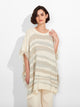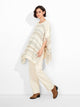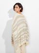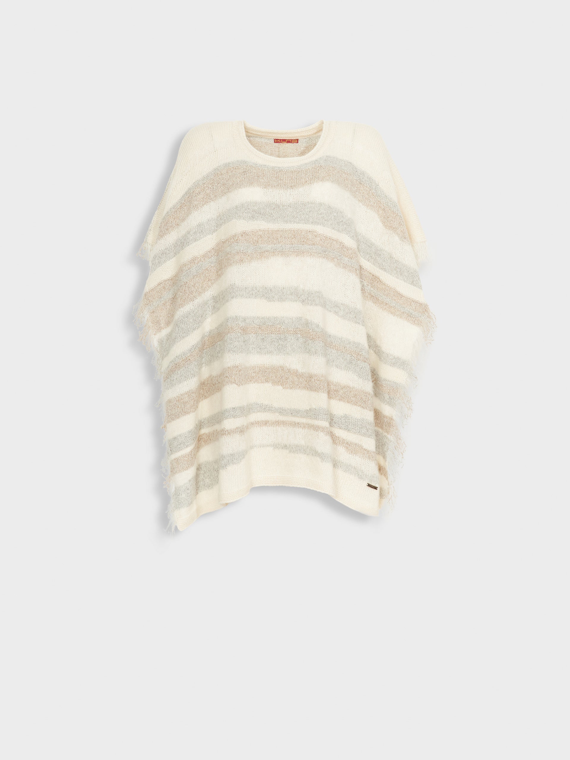 Poncho Zegovia en tonalidad ecru, con diseño de rayas horizontales y tejido de punto suelto que ofrece una caída ligera y elegante. Los bordes con flecos añaden un detalle distintivo. Confeccionado en una mezcla de baby alpaca, suri alpaca y seda para una textura suave y confortable. | Material predominante: Baby Alpaca