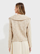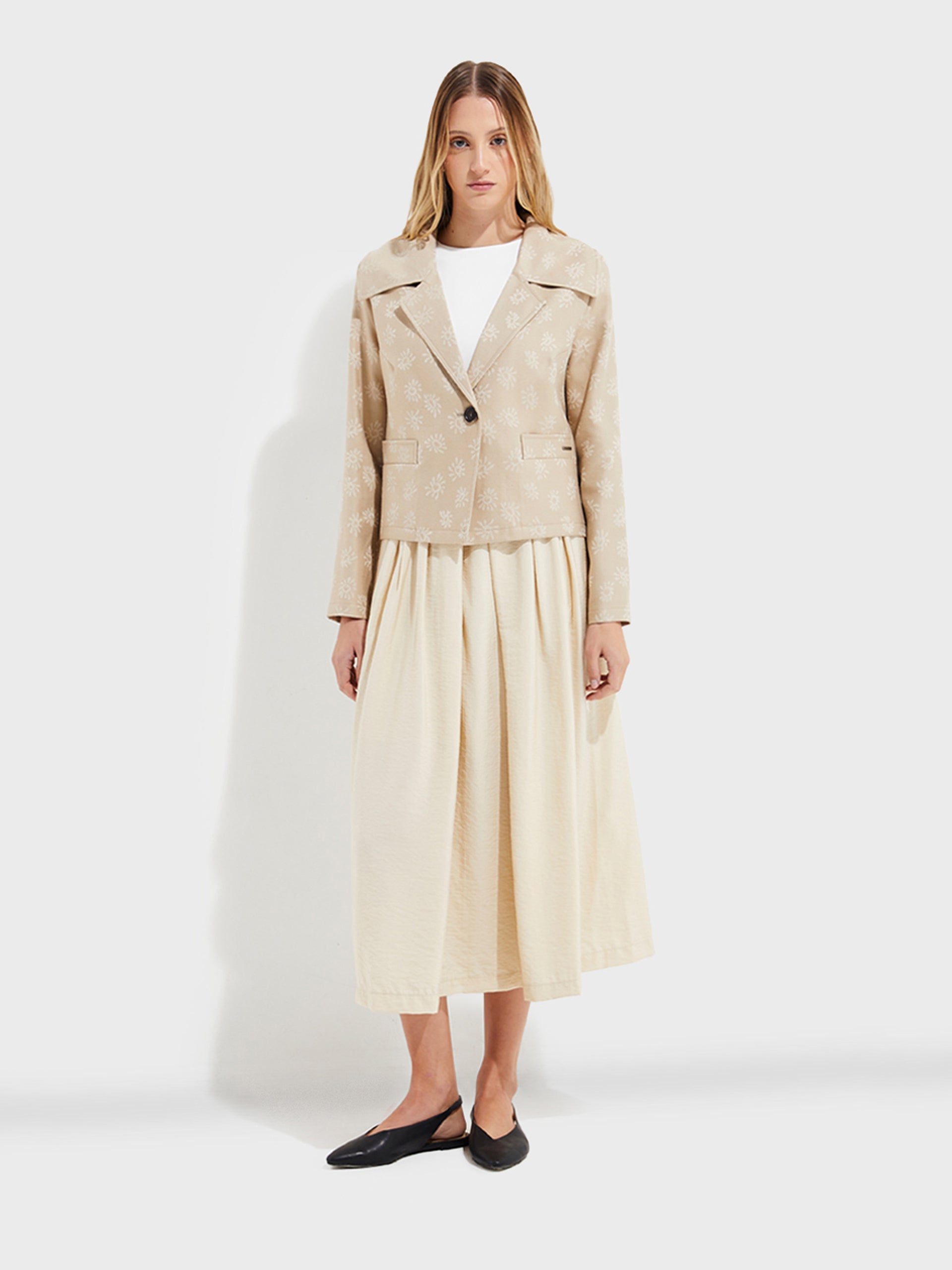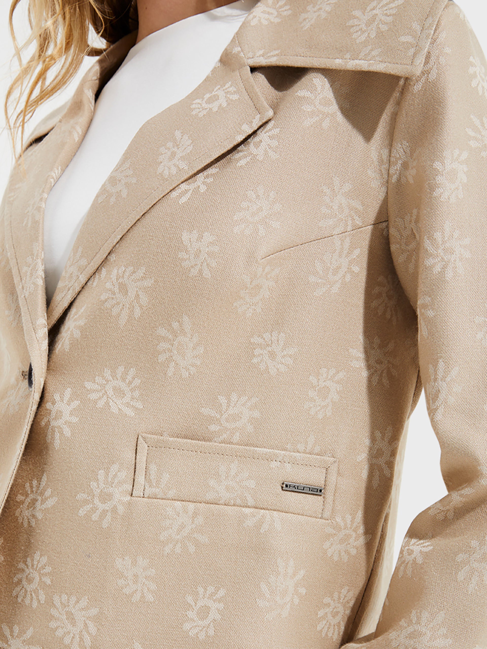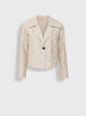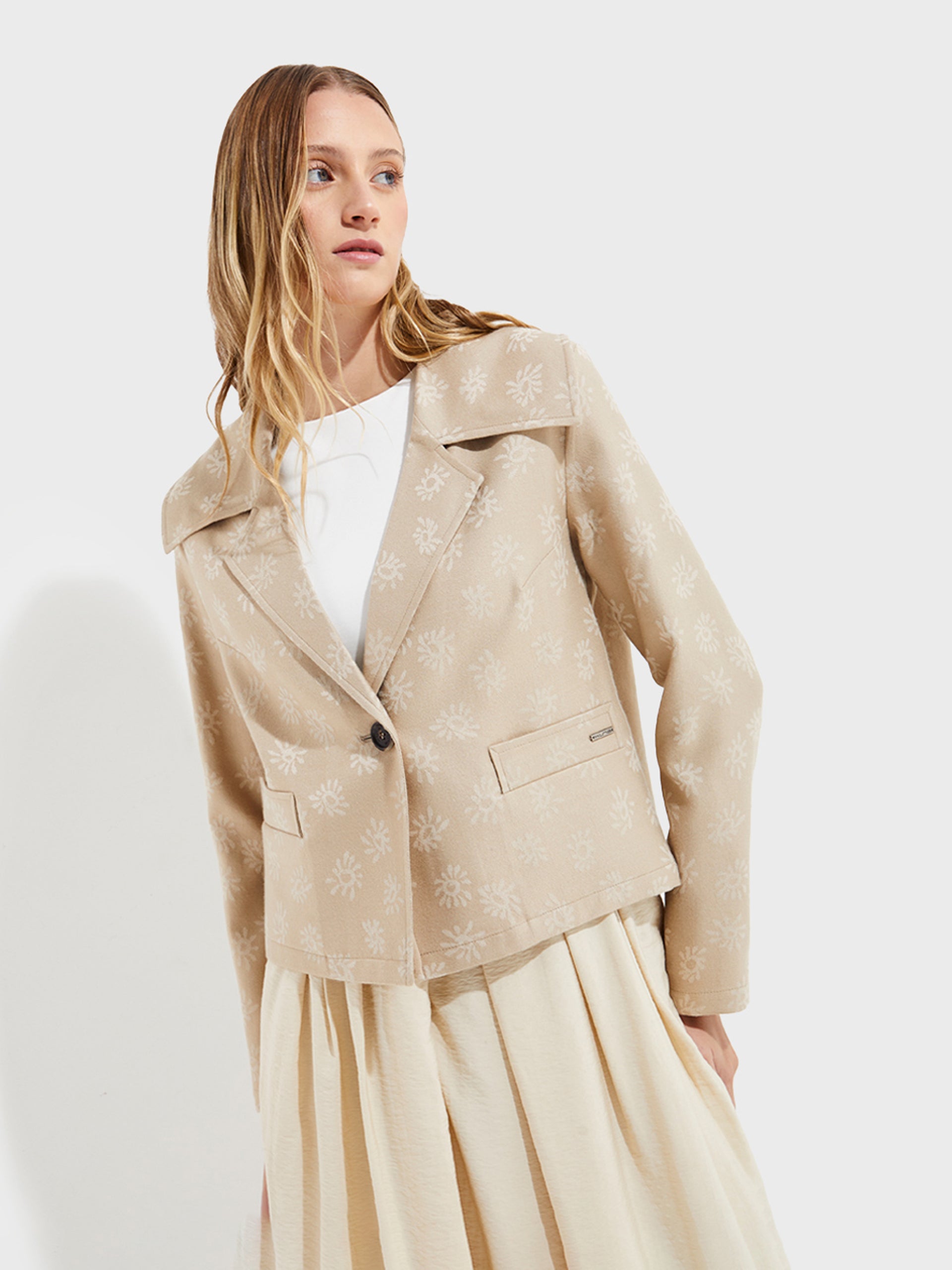 Our Ytaparica jacket, made of bamboo, baby alpaca and silk, is a garment that perfectly matches any outfit. Its classic cut and elegant floral details make it a unique piece. The wide collar towards the shoulders and with a lapel adds a sophisticated touch. | Predominant material: Bamboo