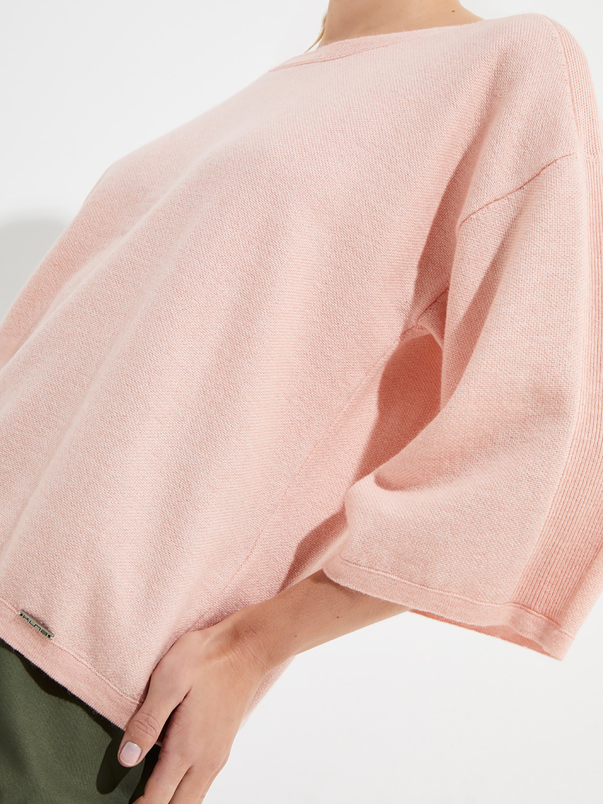 The Yolene sweater is the perfect casual piece for this season. Made from organic cotton and baby alpaca, this three-quarter sleeve sweater combines comfort and style. Available in three basic shades, it features a semi-round neck and an oversized design that gives it a relaxed look. | Predominant material: Cotton