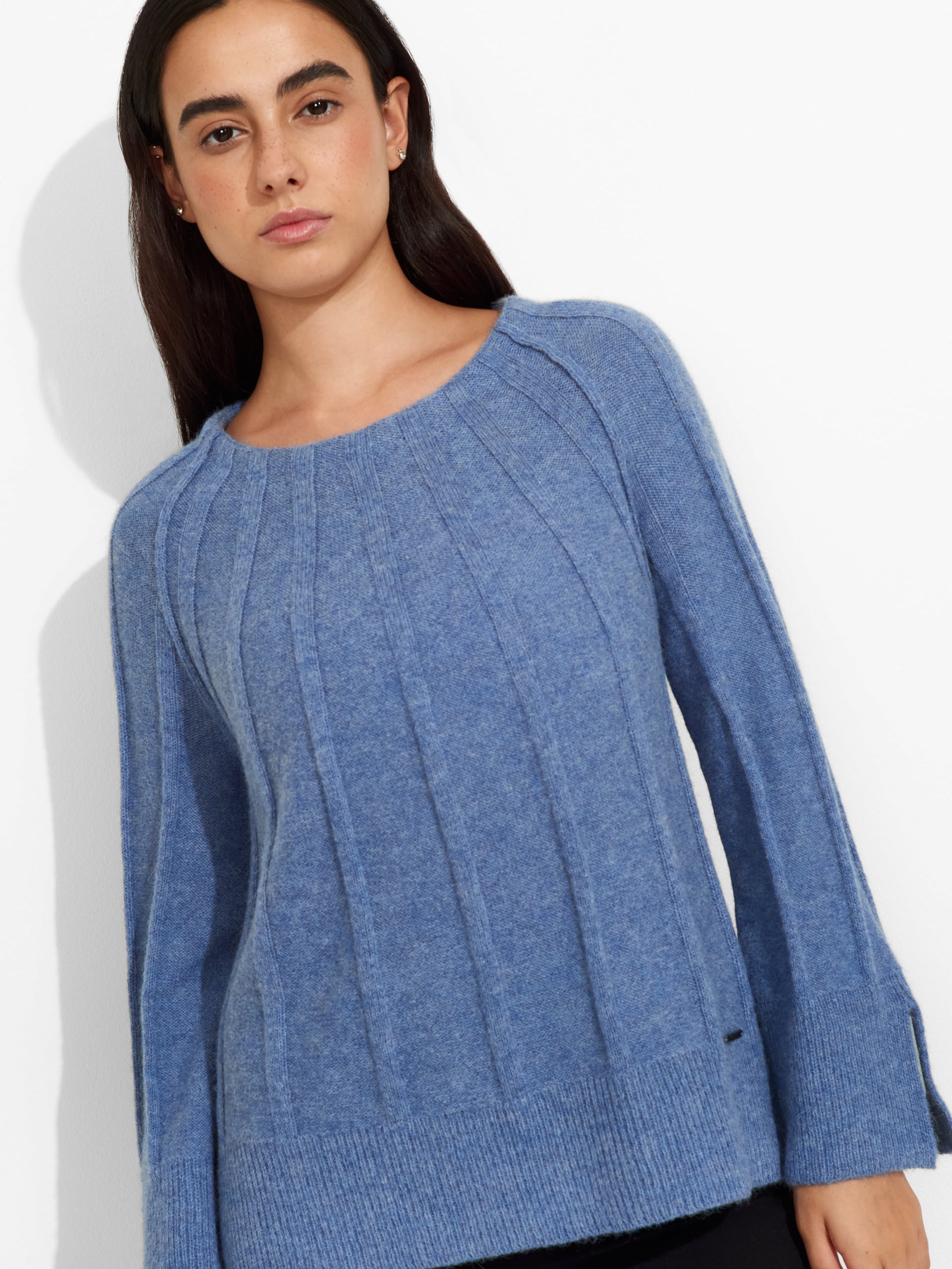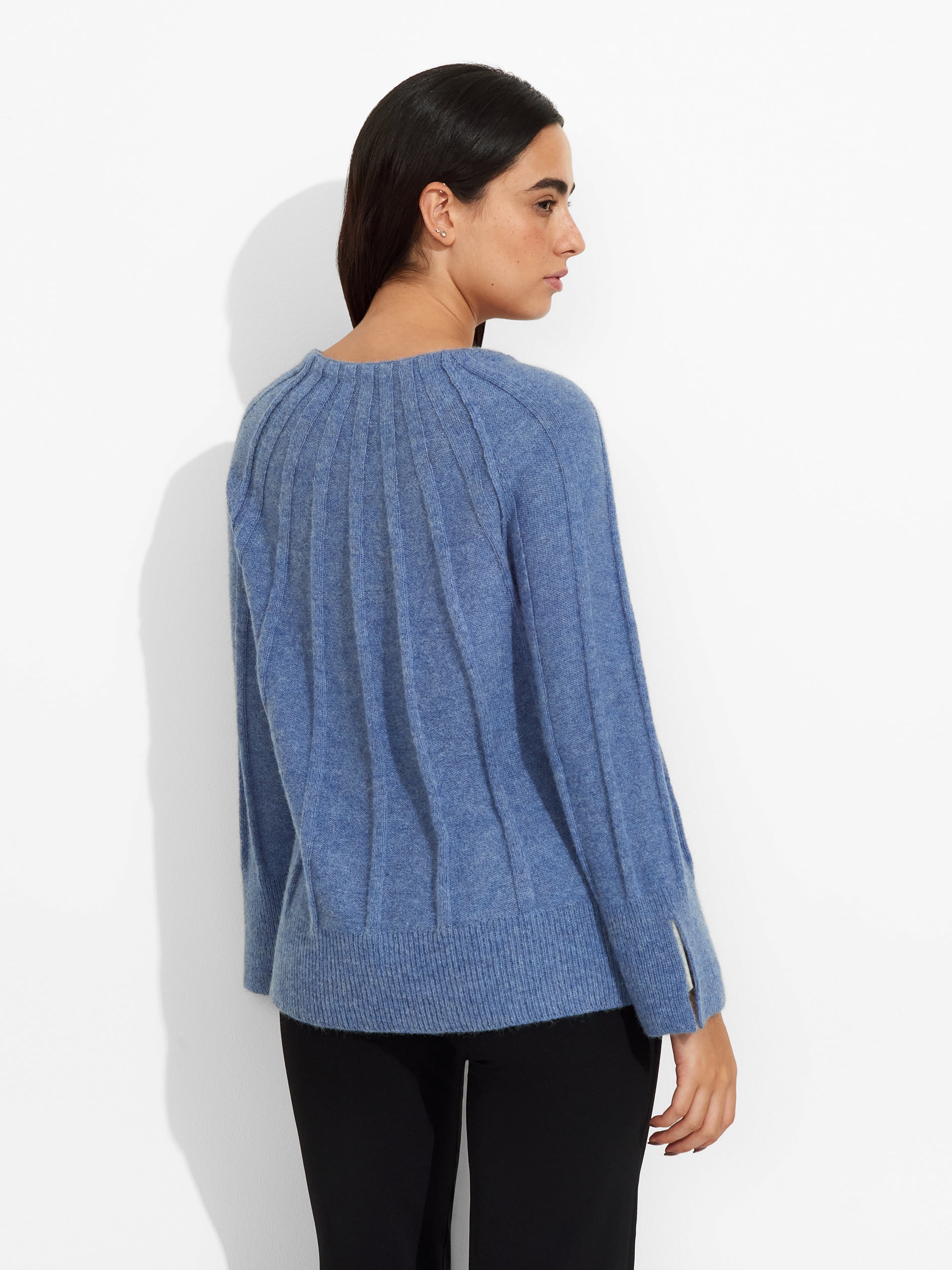 Suéter Zephir en tonalidad celeste, de silueta holgada, cuello redondo y aberturas en las mangas. Confeccionado en baby alpaca, brinda calidez y suavidad. | Material predominante: Baby Alpaca