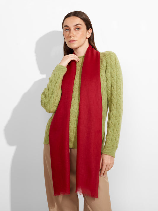Estola Alondra en tonalidad rojo, de color entero, presenta bordes con flecos finos. Confeccionada en...