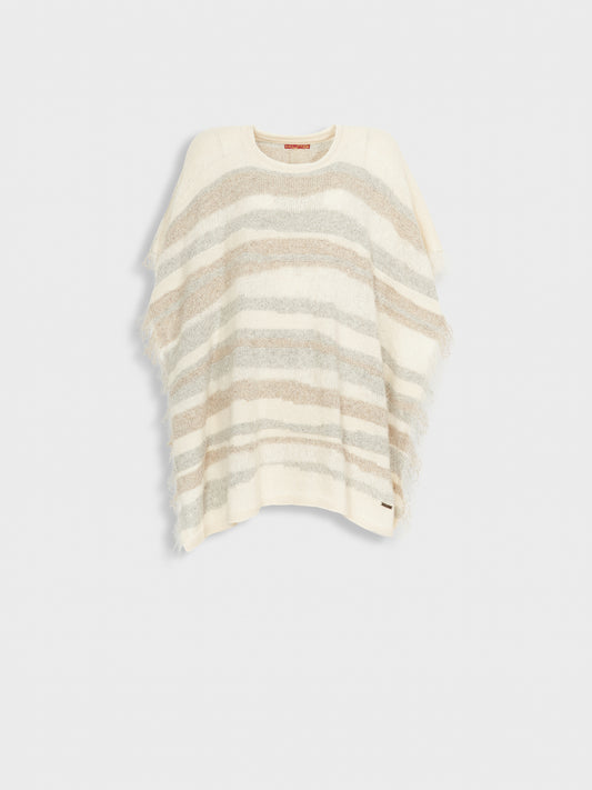 Poncho Zegovia en tonalidad ecru, con diseño de rayas horizontales y tejido de punto suelto...