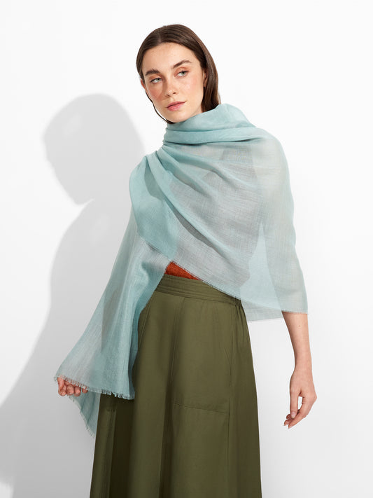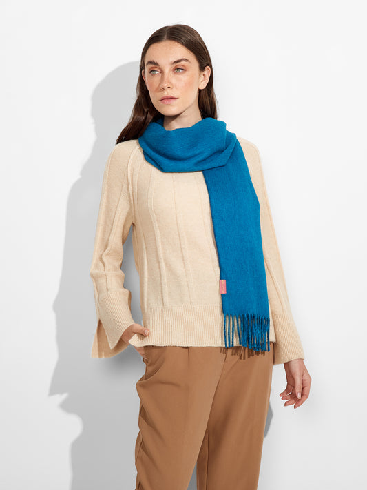 Estola Alondra en tonalidad turquesa, de color entero, presenta bordes con flecos finos. Confeccionada en...