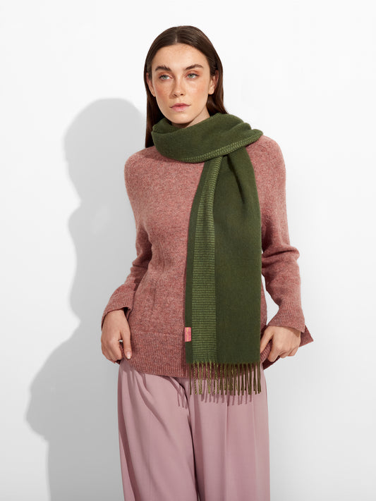 Chalina Zarick en tonalidad verde, con diseño de rayas verticales anchas. Los bordes presentan flecos...
