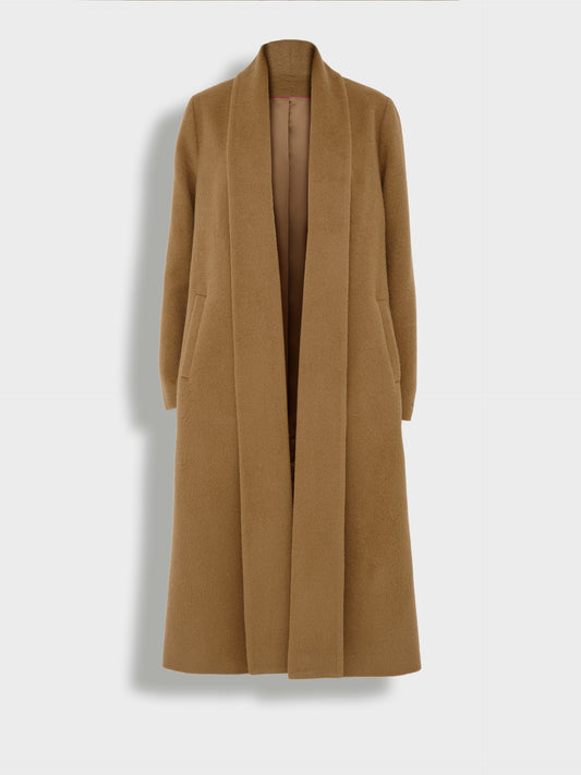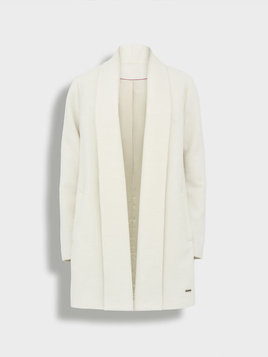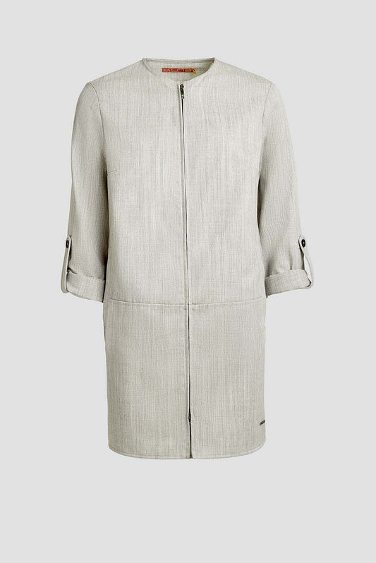 Abrigo Zen en tonalidad beige, de largo clásico y corte princesa que estiliza la silueta....