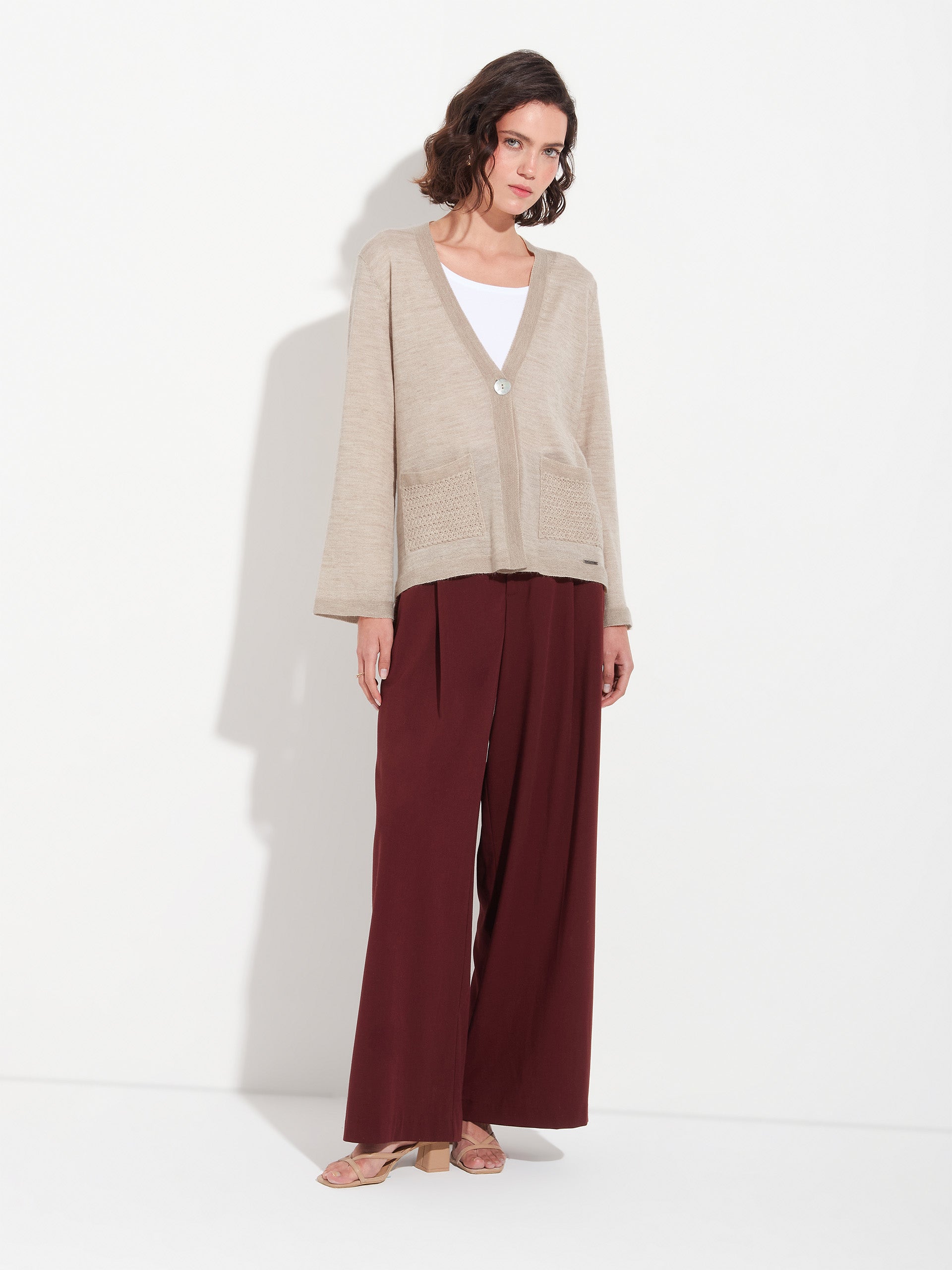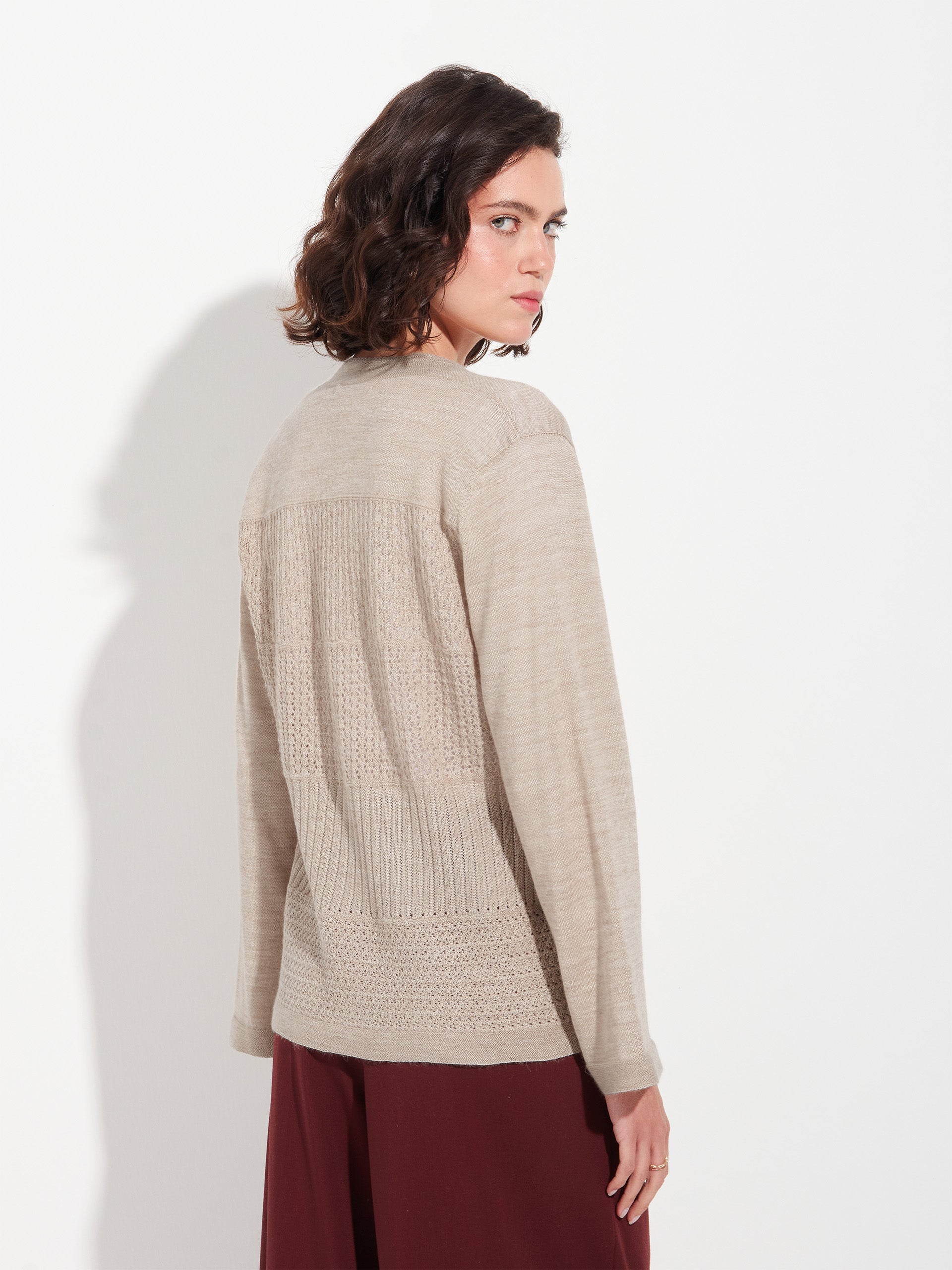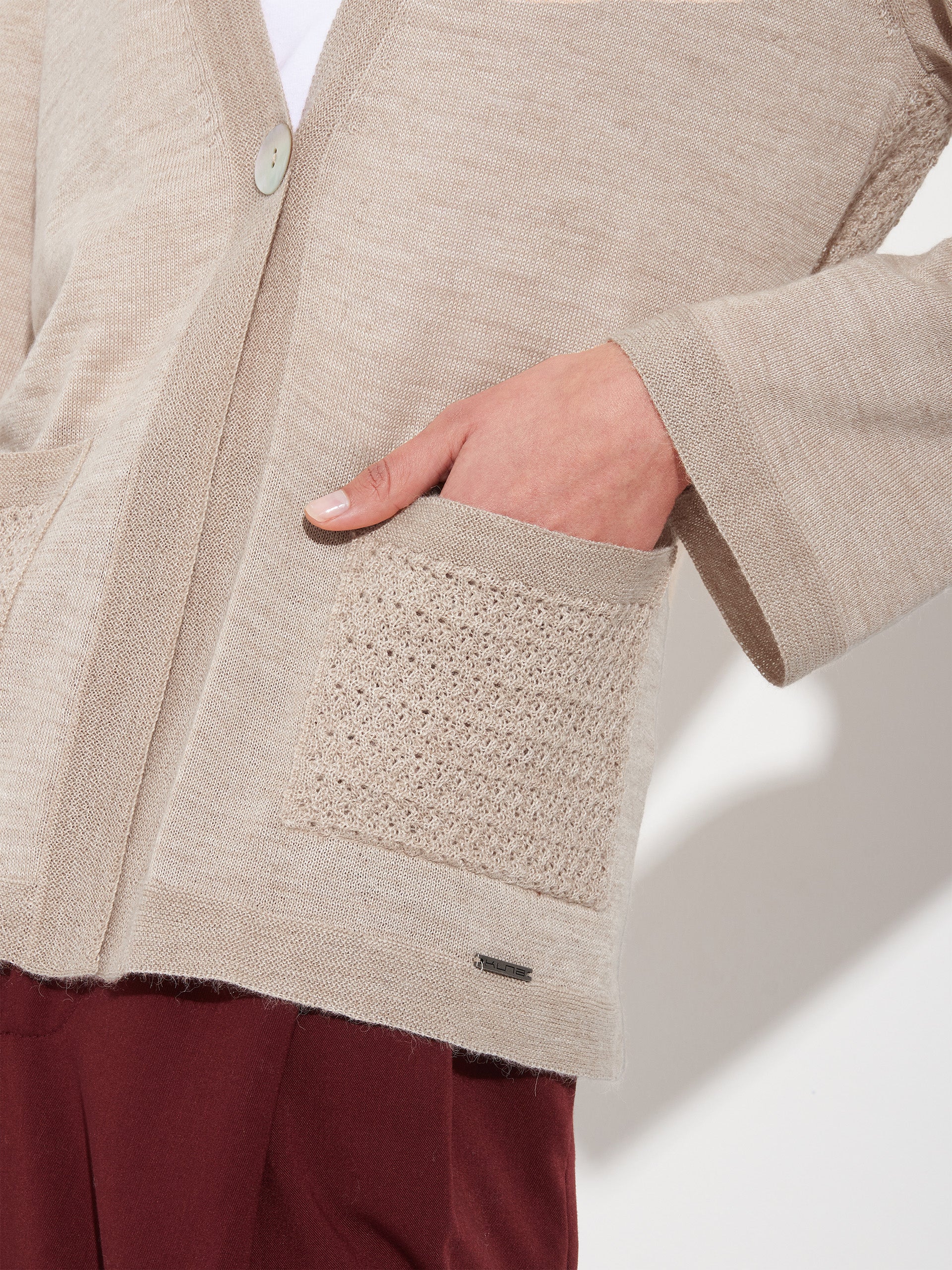 Cardigan Zanzibar en tonalidad beige, confeccionado en baby alpaca y seda. Presenta cuello en “V” con botones, punto llano en la parte delantera y delicados puntos pointelle en la espalda. Cuenta con bolsillos funcionales y un acabado elegante que equilibra confort y estilo. | Material predominante: Baby Alpaca