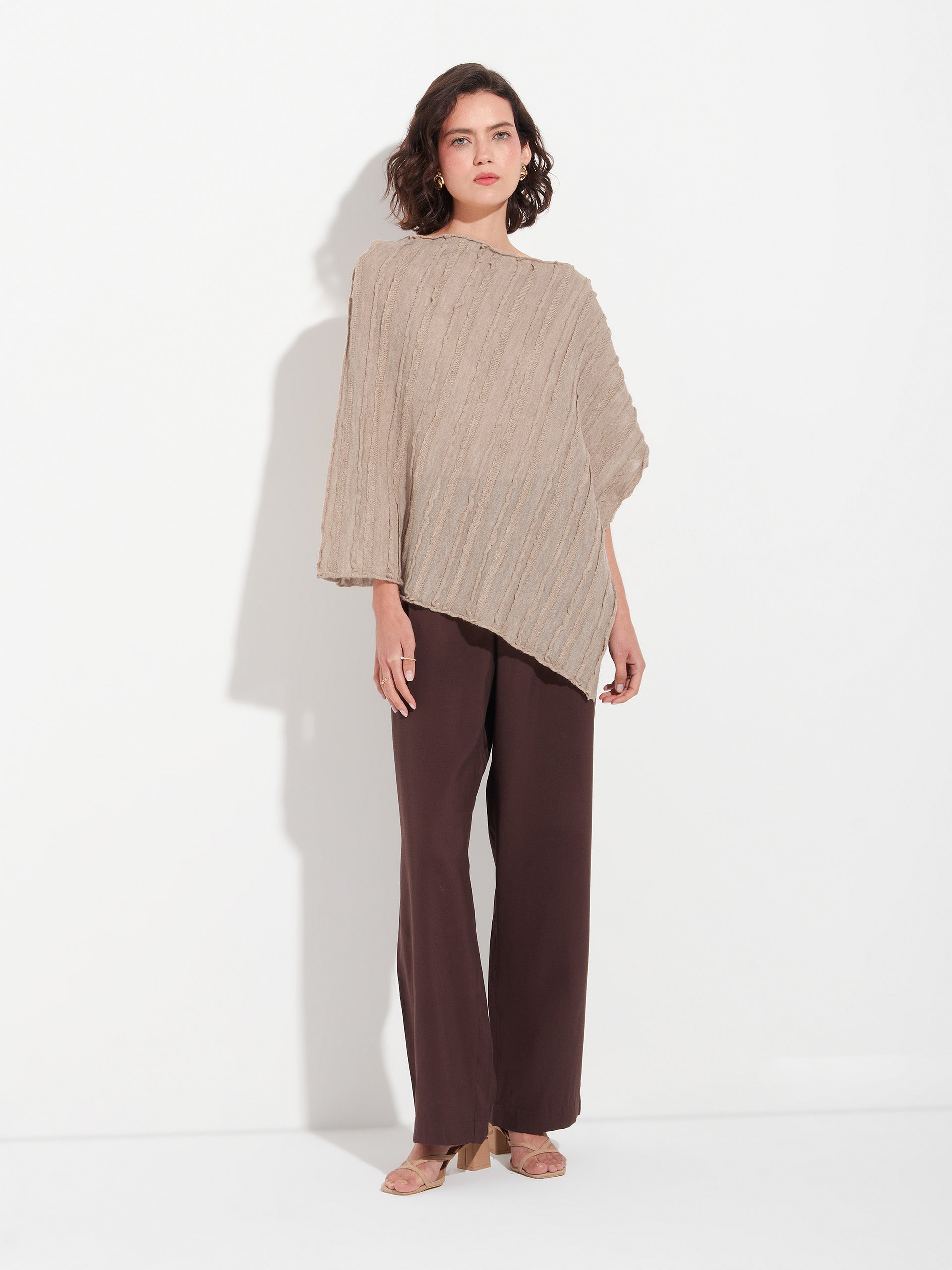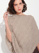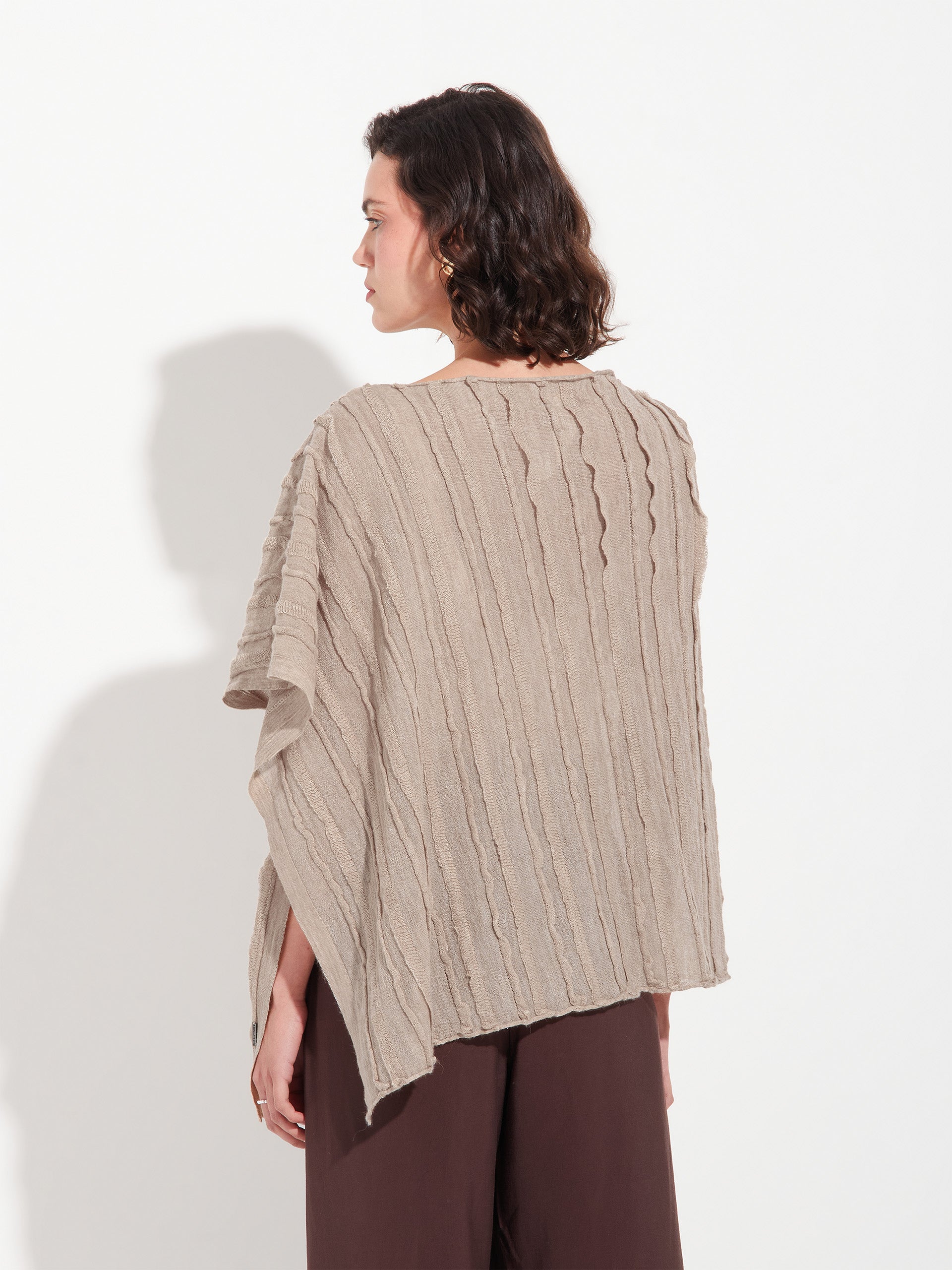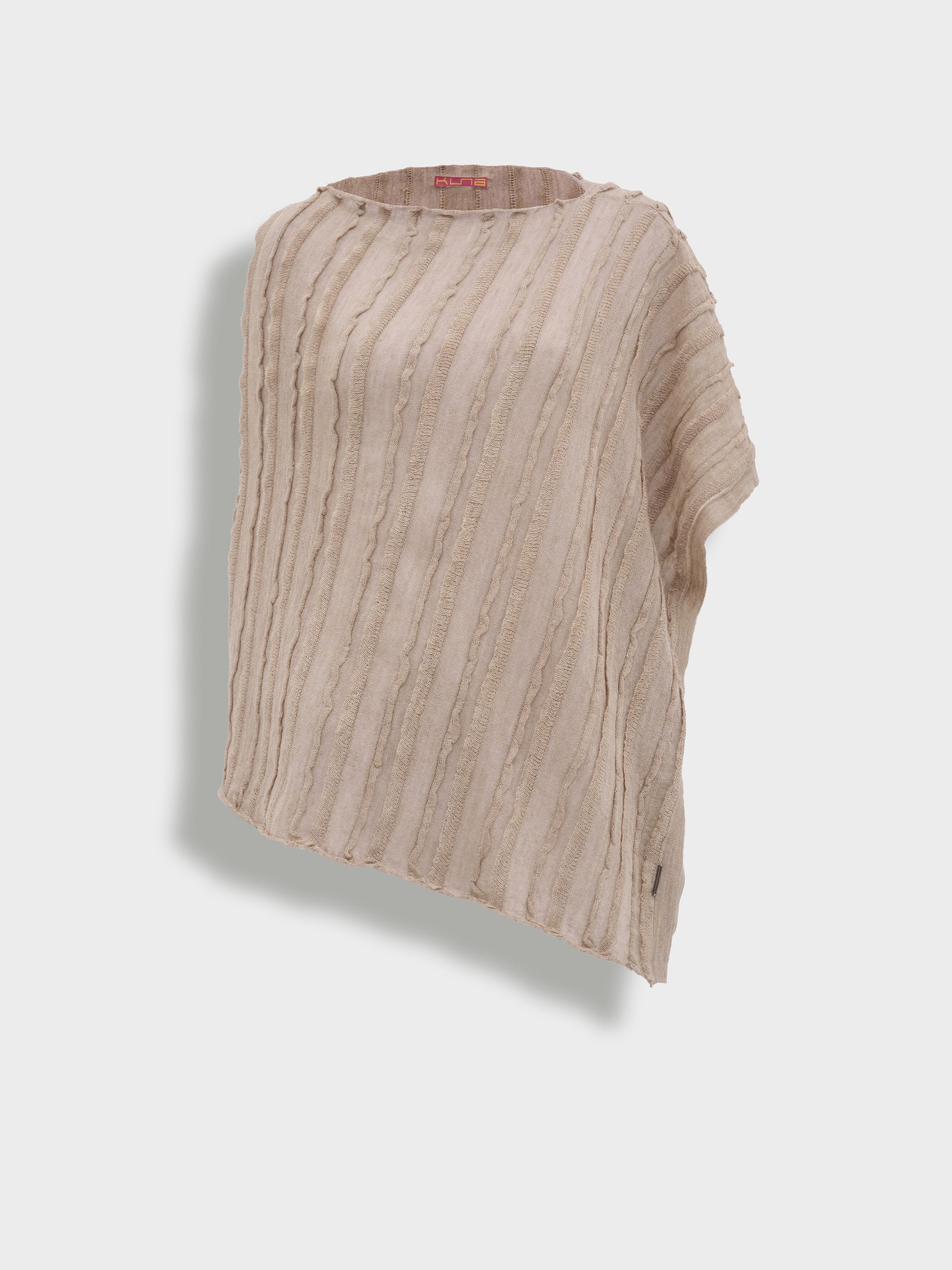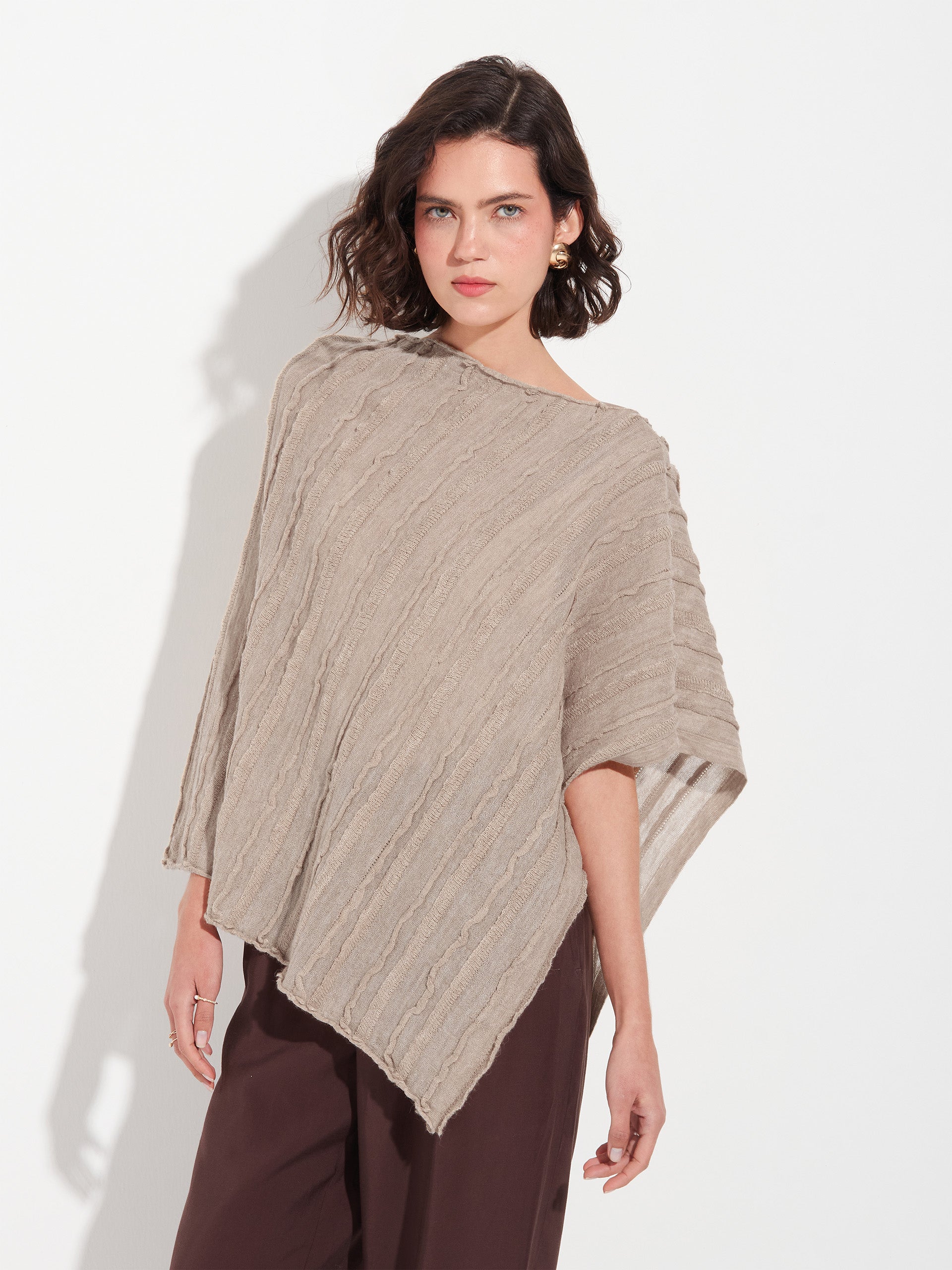 Capa Punto Zarina en tonalidad beige, confeccionado en baby alpaca y seda. Es un poncho cerrado con un sutil punto en relieve que aporta textura y un acabado elegante. | Material predominante: Baby Alpaca