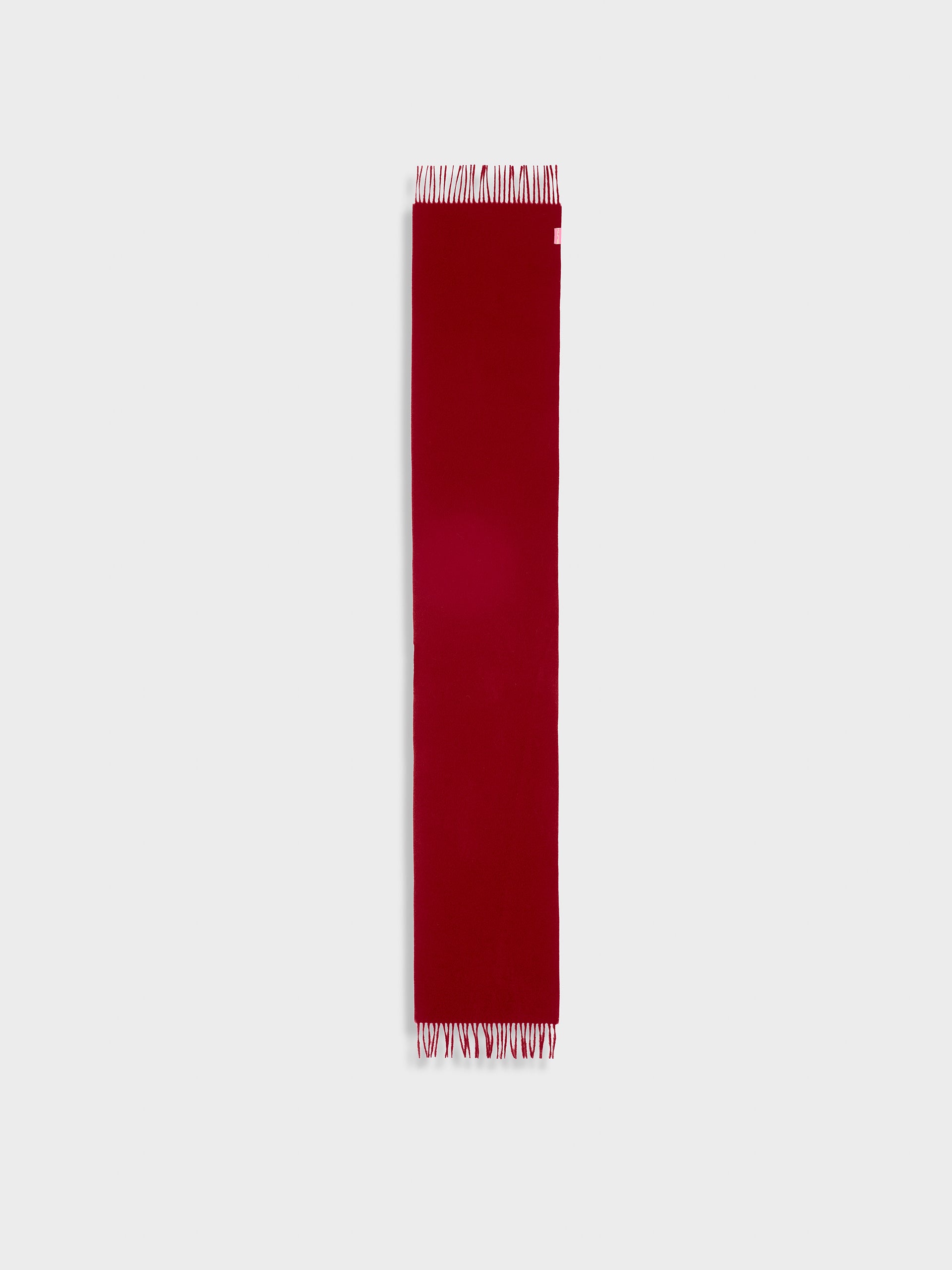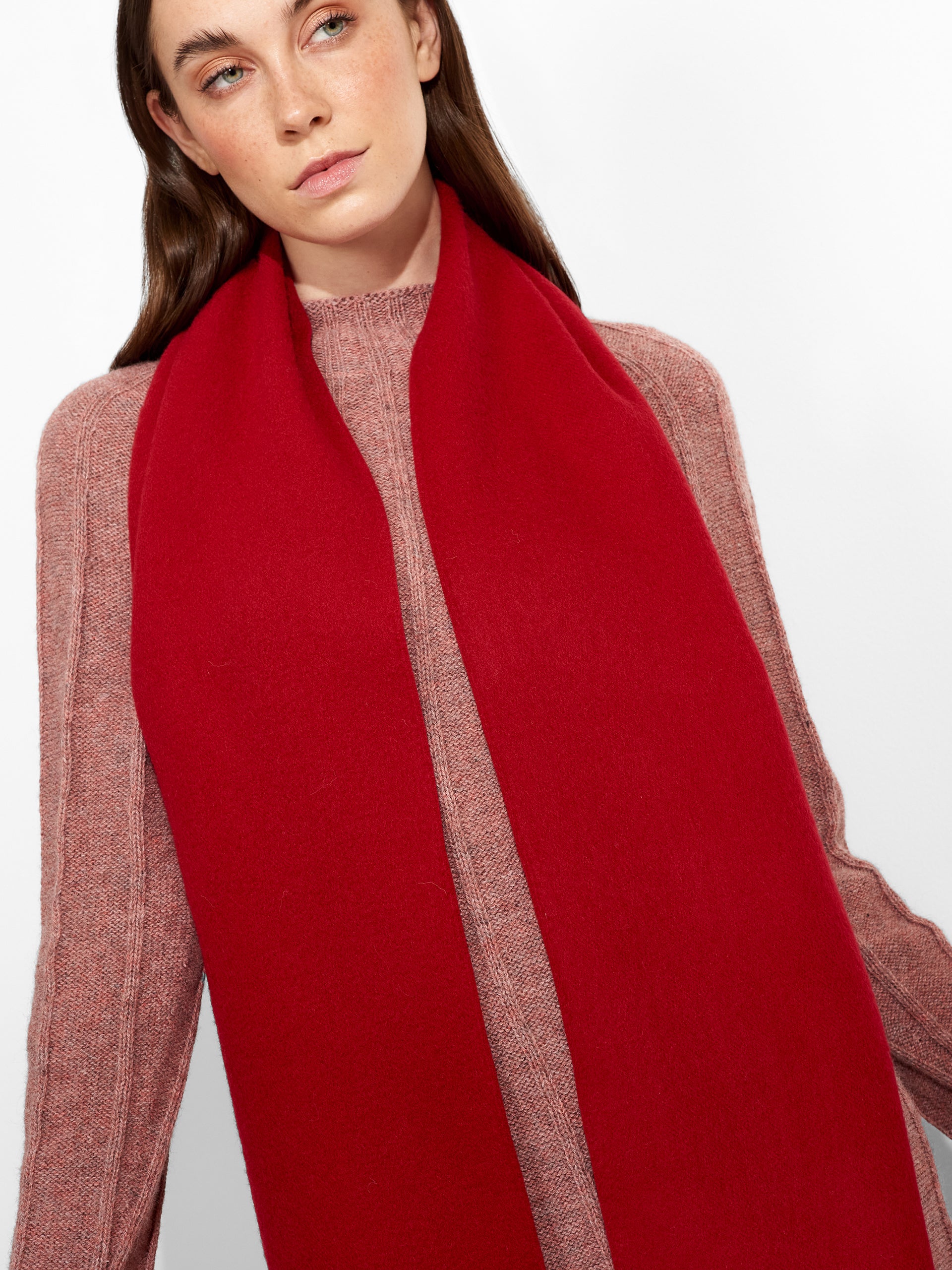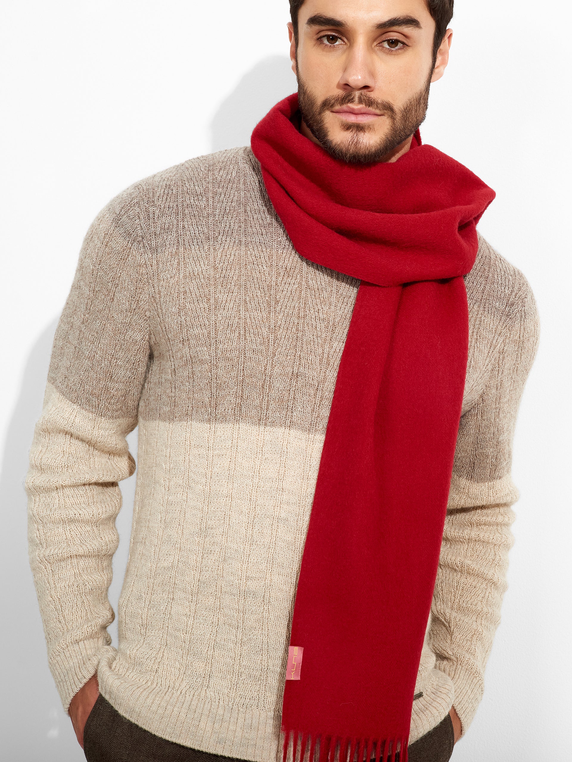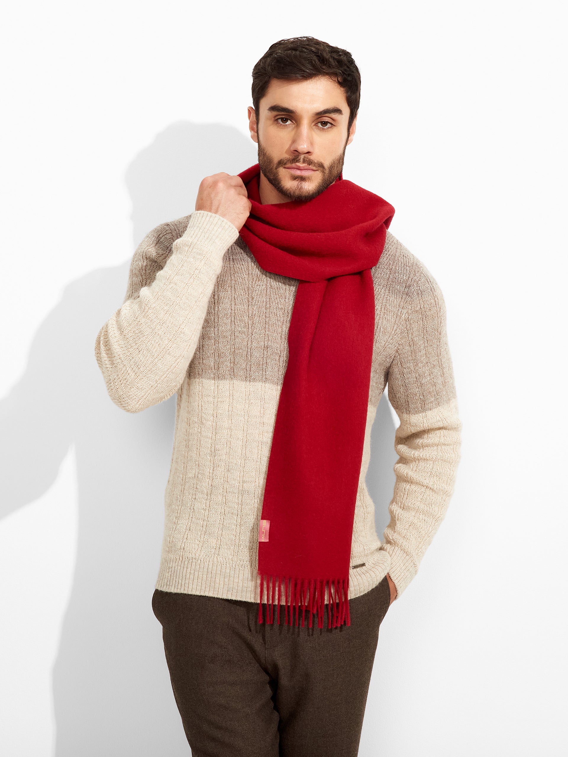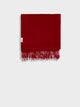 Chalina Adrian en tonalidad rojo, de diseño de color entero con bordes terminados en flecos gruesos. Confeccionada en baby alpaca, brinda calidez y suavidad. | Material predominante: Baby Alpaca